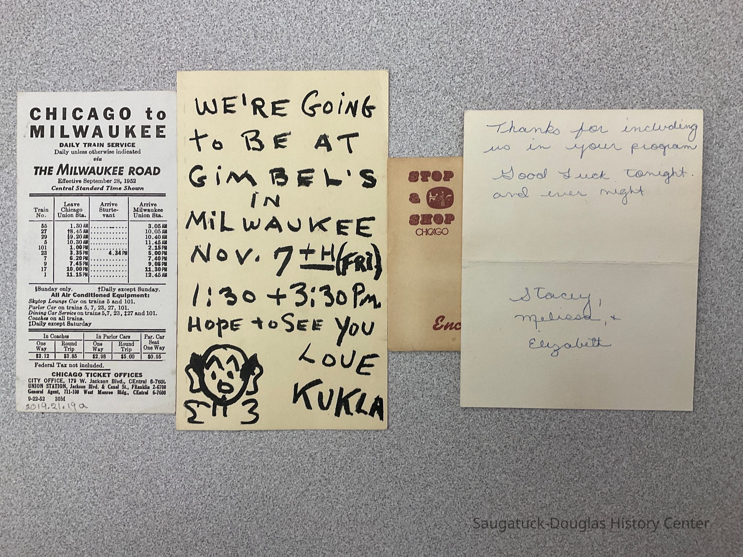 a) Train schedule (Chicago to Milwaukee), b) invitation from Burr Tillstrom, and c) cardCollection