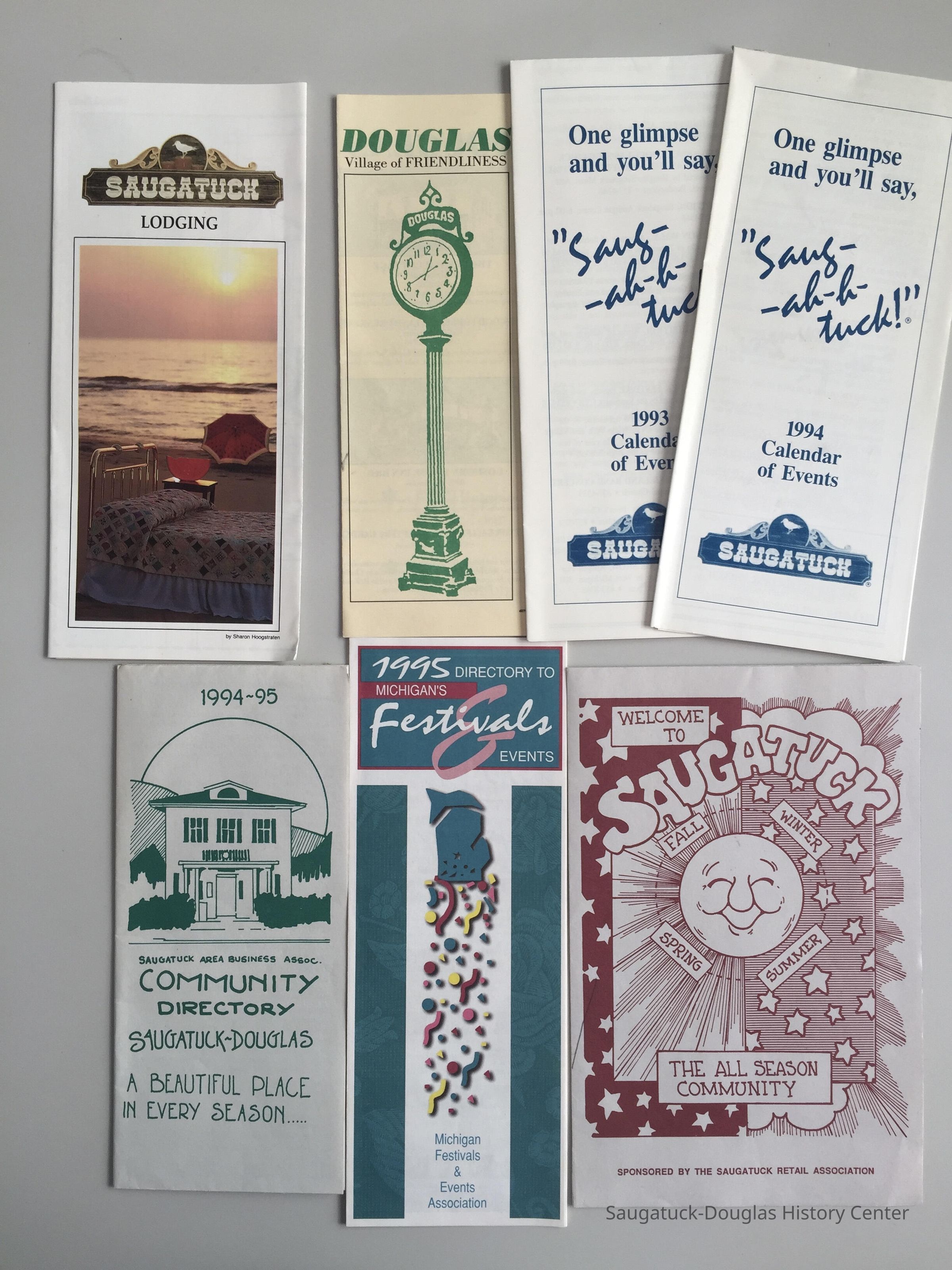 Collection of brochures, calendars of events and festival guides for tourists and visitors to Saugatuck and Douglas. These documents include lists and descriptions of business members, photos and maps. Slogans include "One glimpse and you'll say, Saug-ah-h-tuck!", "The All Season Community", and "A Beautiful Place in Every Season..."Context