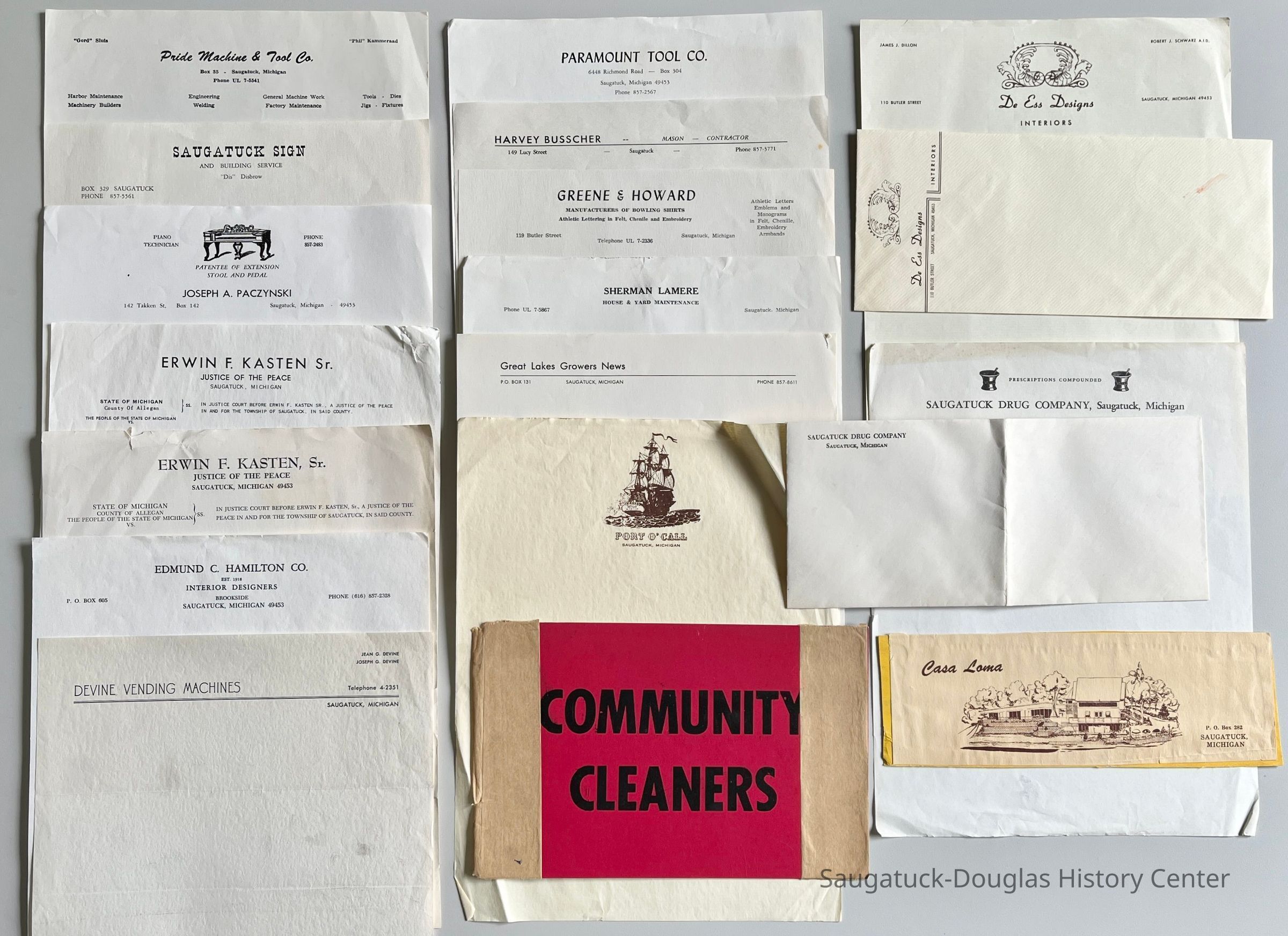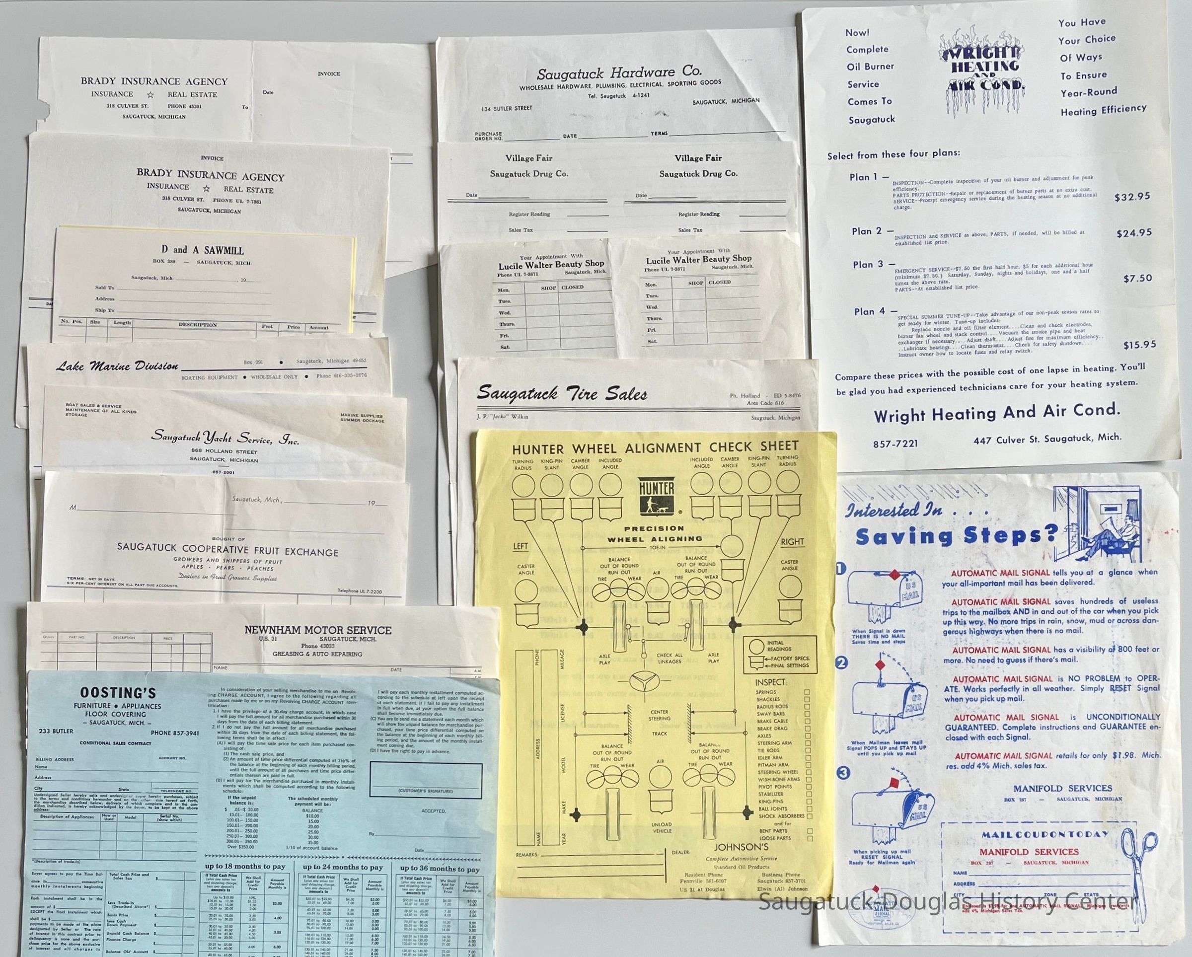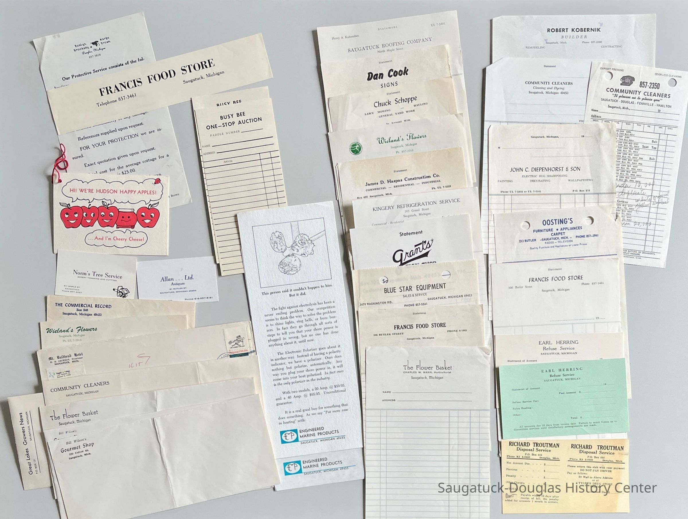 Local businesses include , Alan, Ltd., Norm's Tree Service, Francis Food Store, Evalyn J. Brockway and Marge Brown Protective Services, The Commercial Record, Bill Wilson's Gourmet Shop, The Flower Basket, Community Cleaners, Great Lakes Growers News, Mt. Baldhead Hotel, Dorn's Electric, Wieland's Flowers, Busy Bee Auction, Richard Troutman Disposal Service, Earl Herring Refuse Service, Oosting' Furniture and Appliances, John C. Diepenhorst & Son Decorating and Rug Shampooing, Robert Kobernik Builder, Blue Star Equipment, Grant's Sign Shop, Kingerly Refrigeration Service, James D. Haspas Construction Company, Shuck Shoppe Hauling and Yard Work, Dan Cook Signs, Saugatuck Roofing Company, Saugatuck Cooperative Fruit Exchange, Saugatuck Yacht Service Inc., Lake Marine Division wholesale boating equipment D and A Sawmill, Brady Insurance Agency, Saugatuck Hardware Co., Village Fair Saugatuck Drug Co., Lucile Walter Beauty Shop, Newnham Motor Service, Johnson Auto Service, Saugatuck Tire Sales, Wright Heating and Air Conditioning, Manifold Services mailboxes, Joe Hanacek's Lighthouse Service Station, West Michigan Oil Company/Douglas Gas & Oil Company, Casa Loma, De Ess Designs, Port O' Call, Sherman Lamere house & yard service, Harvey Busscher mason/contractor, Paramount Tool Company, Devine Vending Machines, Edmund C. Hamilton Co. interior designers, Erwin F. Kasten Sr. Justice of the Peace, Joseph A. Paczynski Piano Technician, "Dis" Disbow's Saugatuck Sign Service, "Gord" Sluis' Pride Machine & Tool Co.