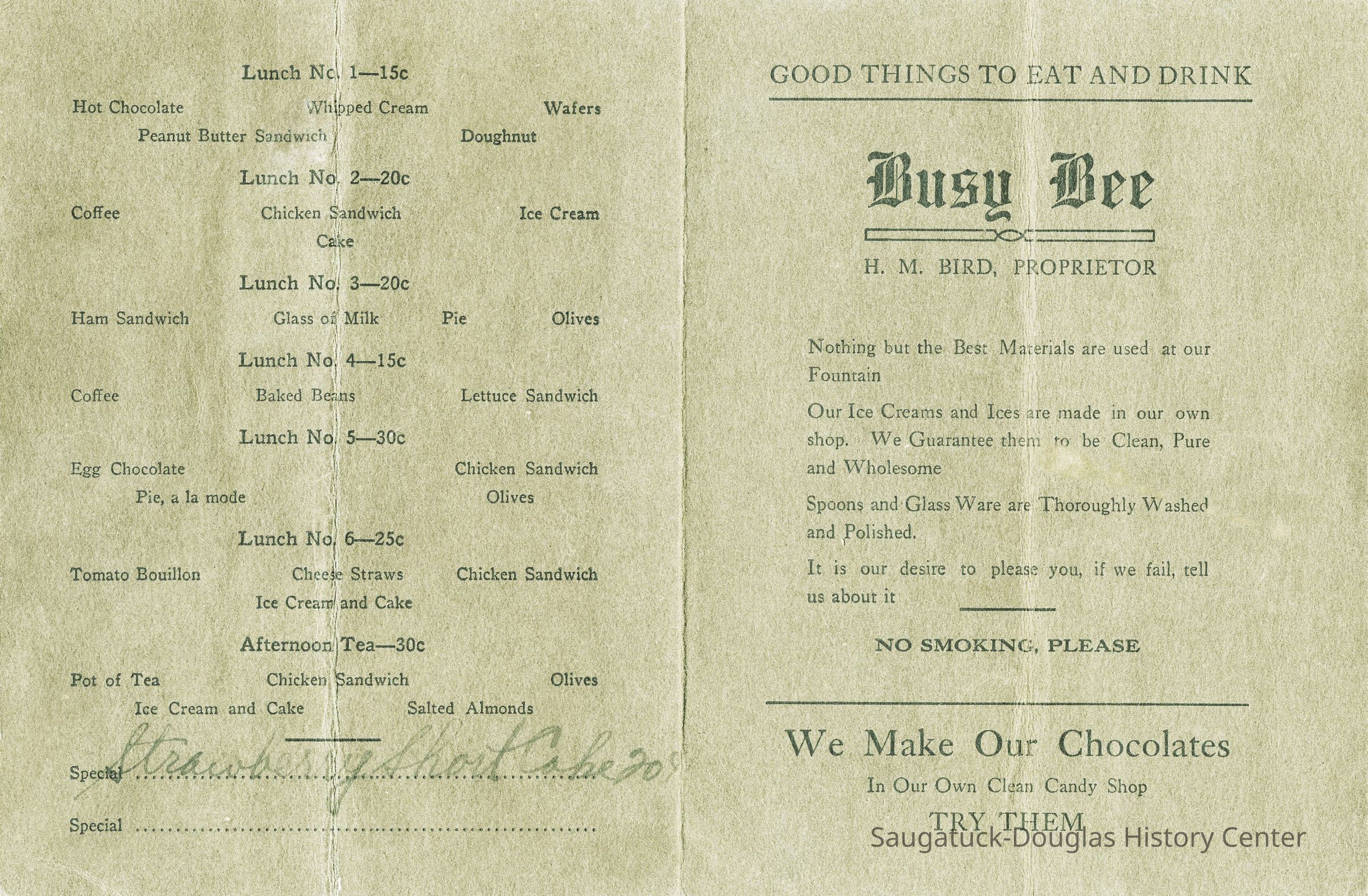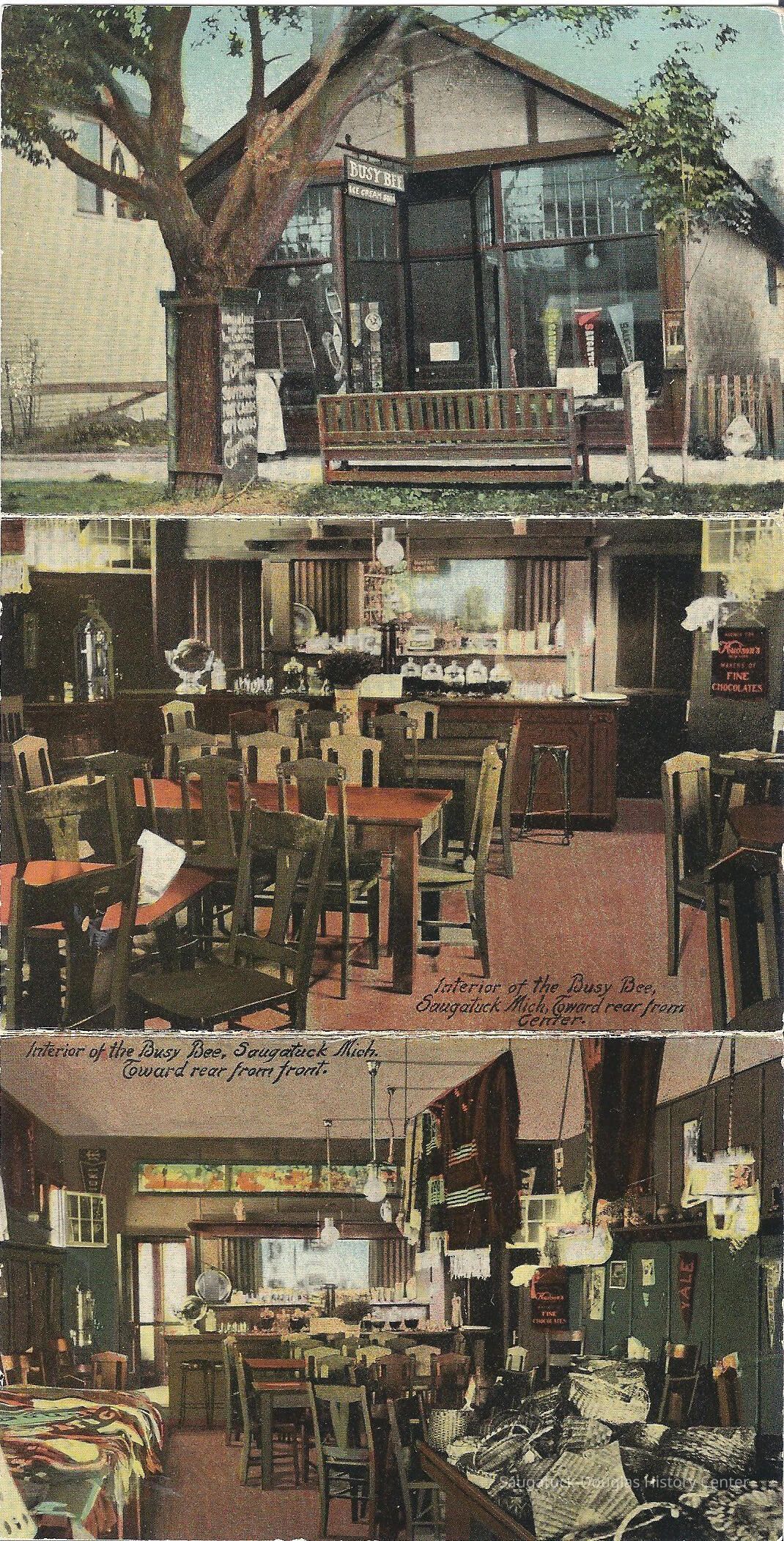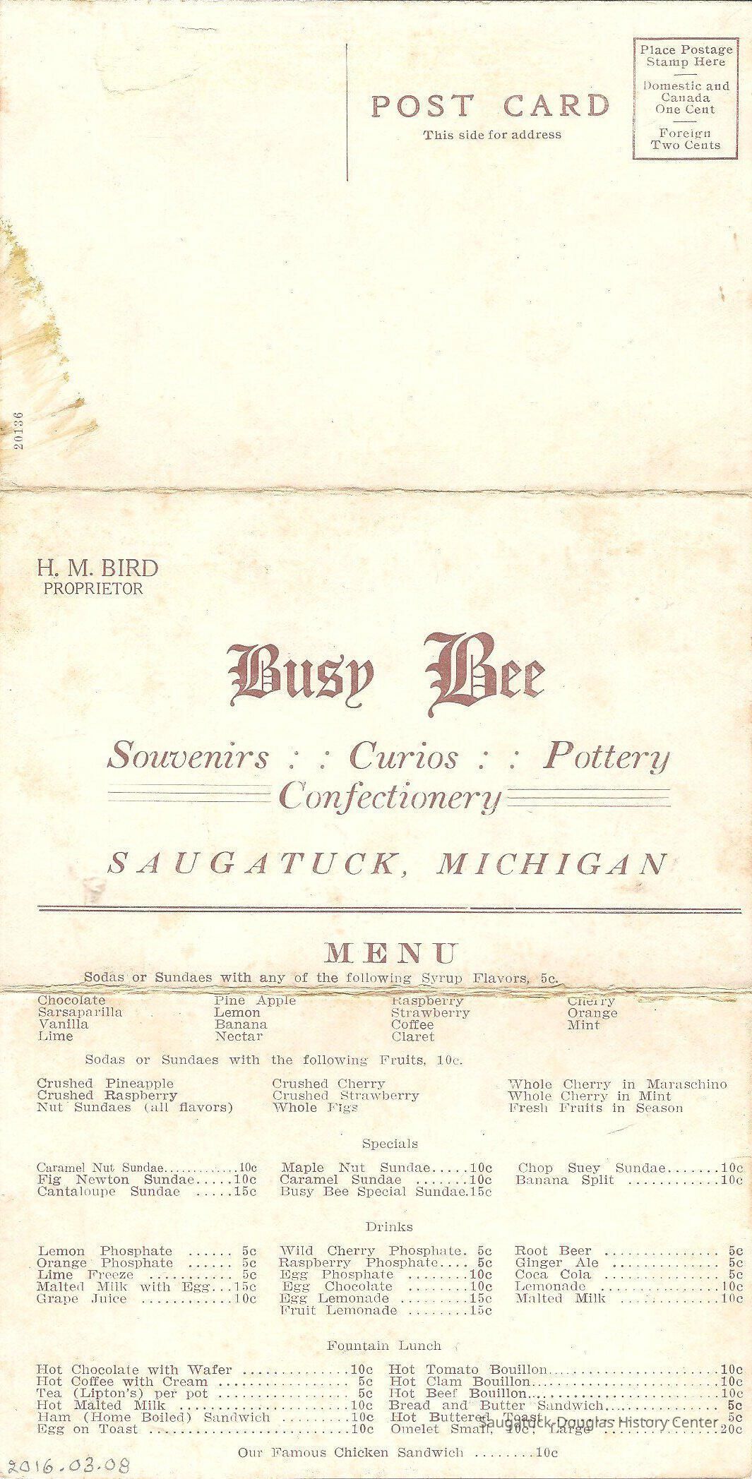 Postcard menu of the Busy Bee Cafe, believed to be located at 235 Butler Street. (Building replaced by Oosting East) Three views of the restaurant inside and outside. Menu on the reverse side.