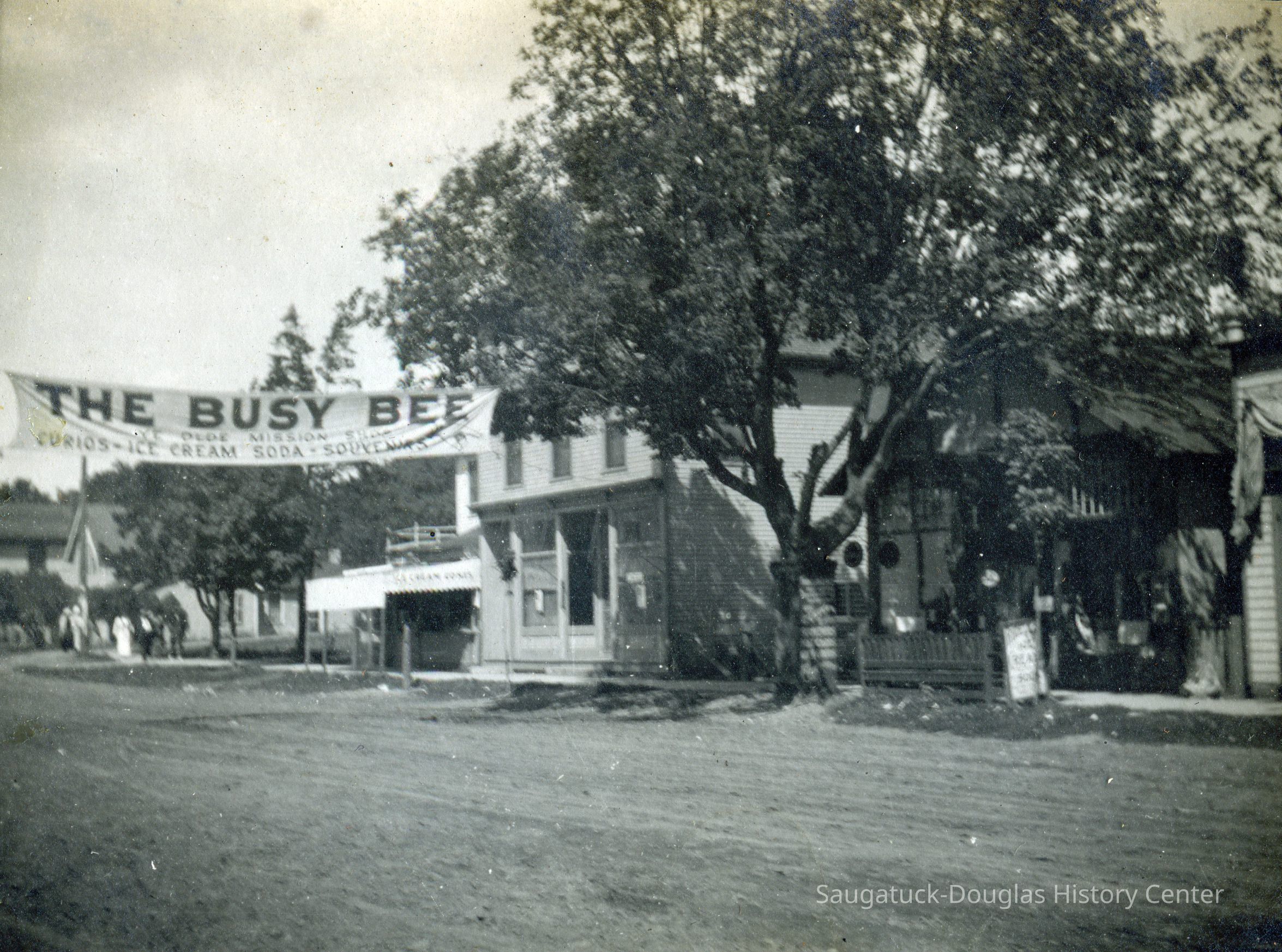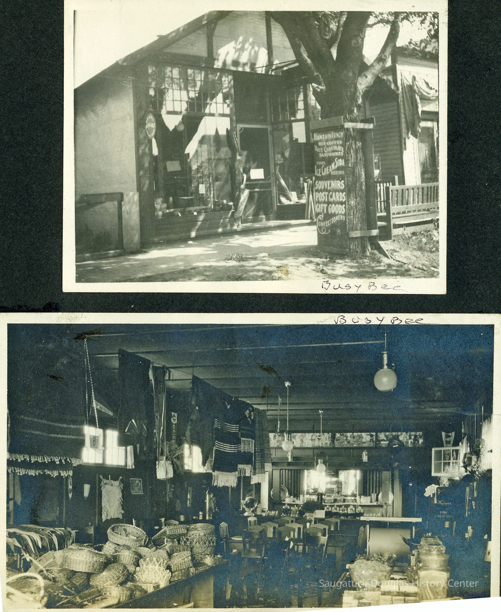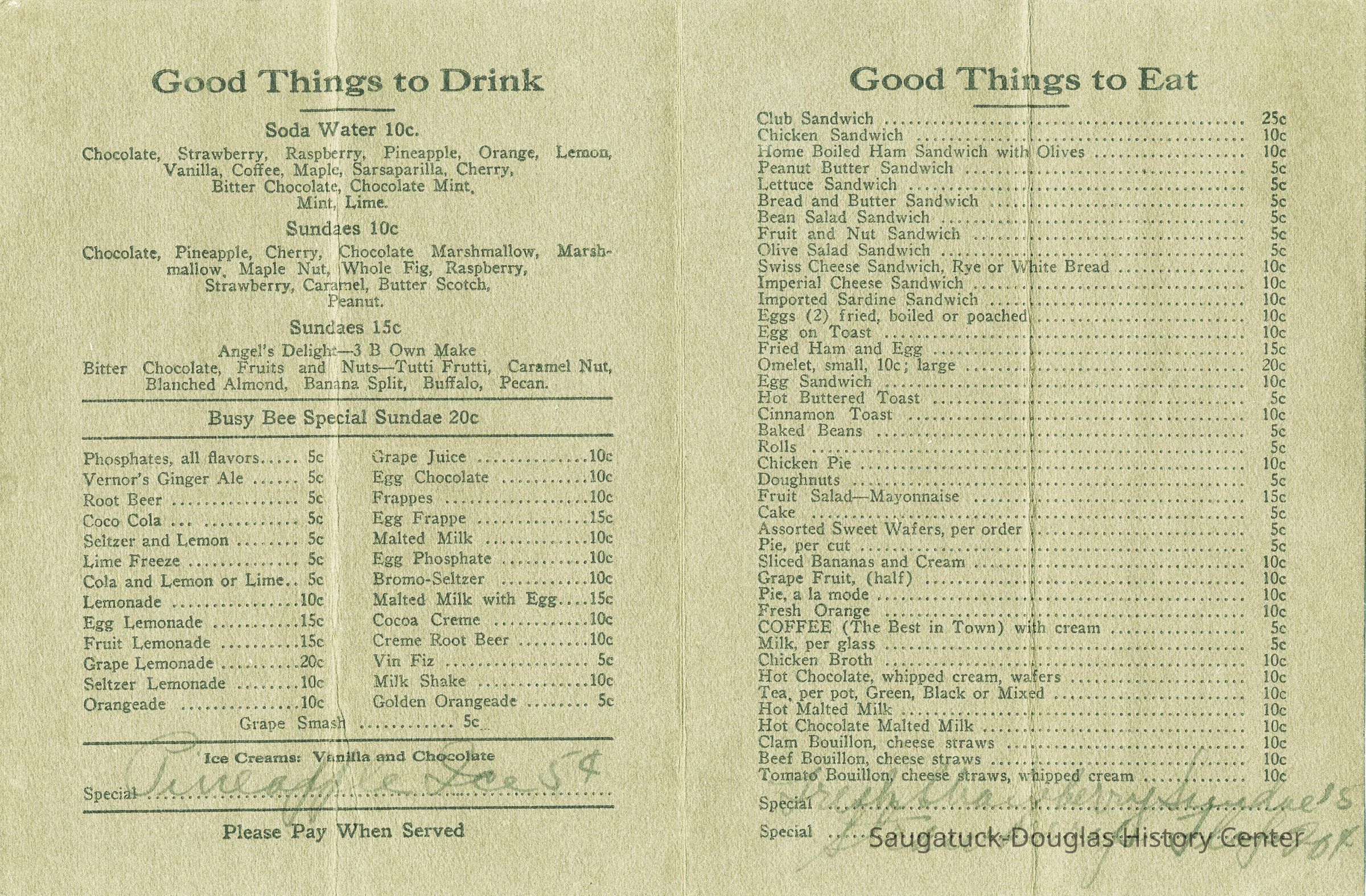 Postcard menu of the Busy Bee Cafe, believed to be located at 235 Butler Street. (Building replaced by Oosting East) Three views of the restaurant inside and outside. Menu on the reverse side.
