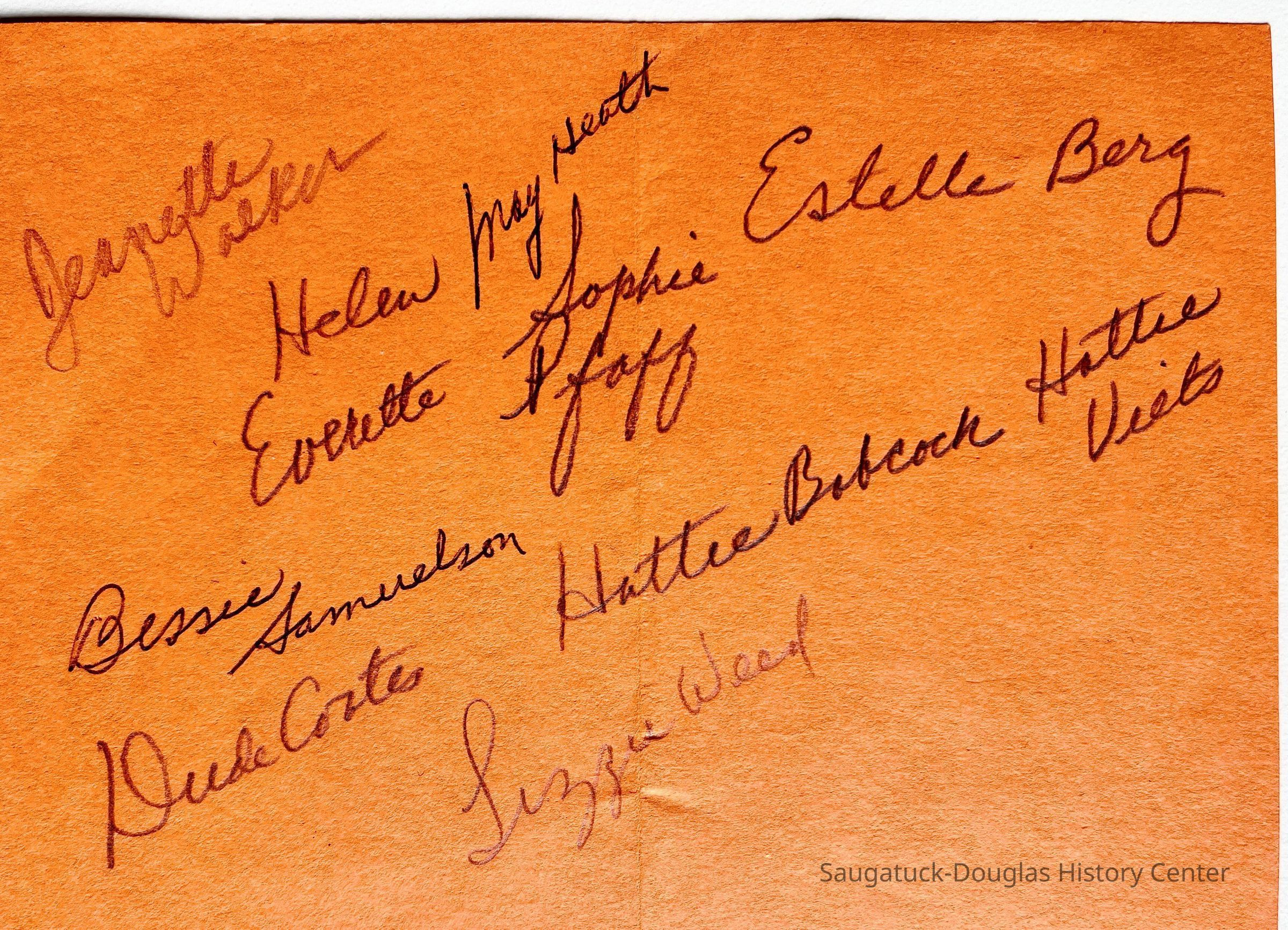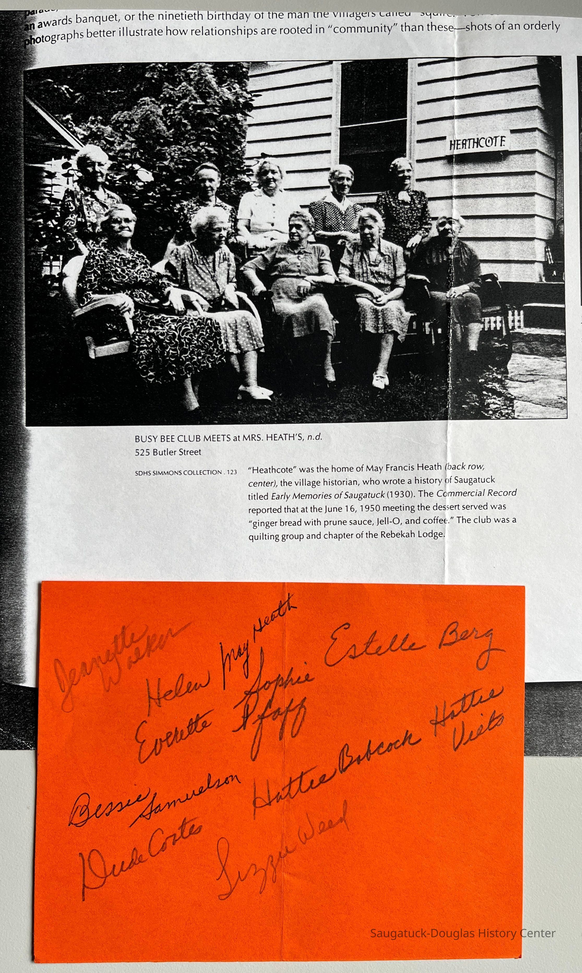Heath, May (Francis) 1873-1961, Busy Bee Club, Barr, Jeanette (Walker) 1902-1979, Everett, Helen, Pfaff, Sophia (Hirner) 1870-1854, Samuelson, Bessie 1868-1951, Coates, Julia Laura "Dude" (Shriver) 1886-1975, Weed, Elizabeth E. (Foley) 1862-1952, Babcock, Harriet Lavinia "Hattie" (Williams) 1865-1955, Veits, Hattie (Smalley) 1863-1948, 525 Butler/Heathcote 2nd/First Congregational Parsonage, Rebekah LodgeCollection