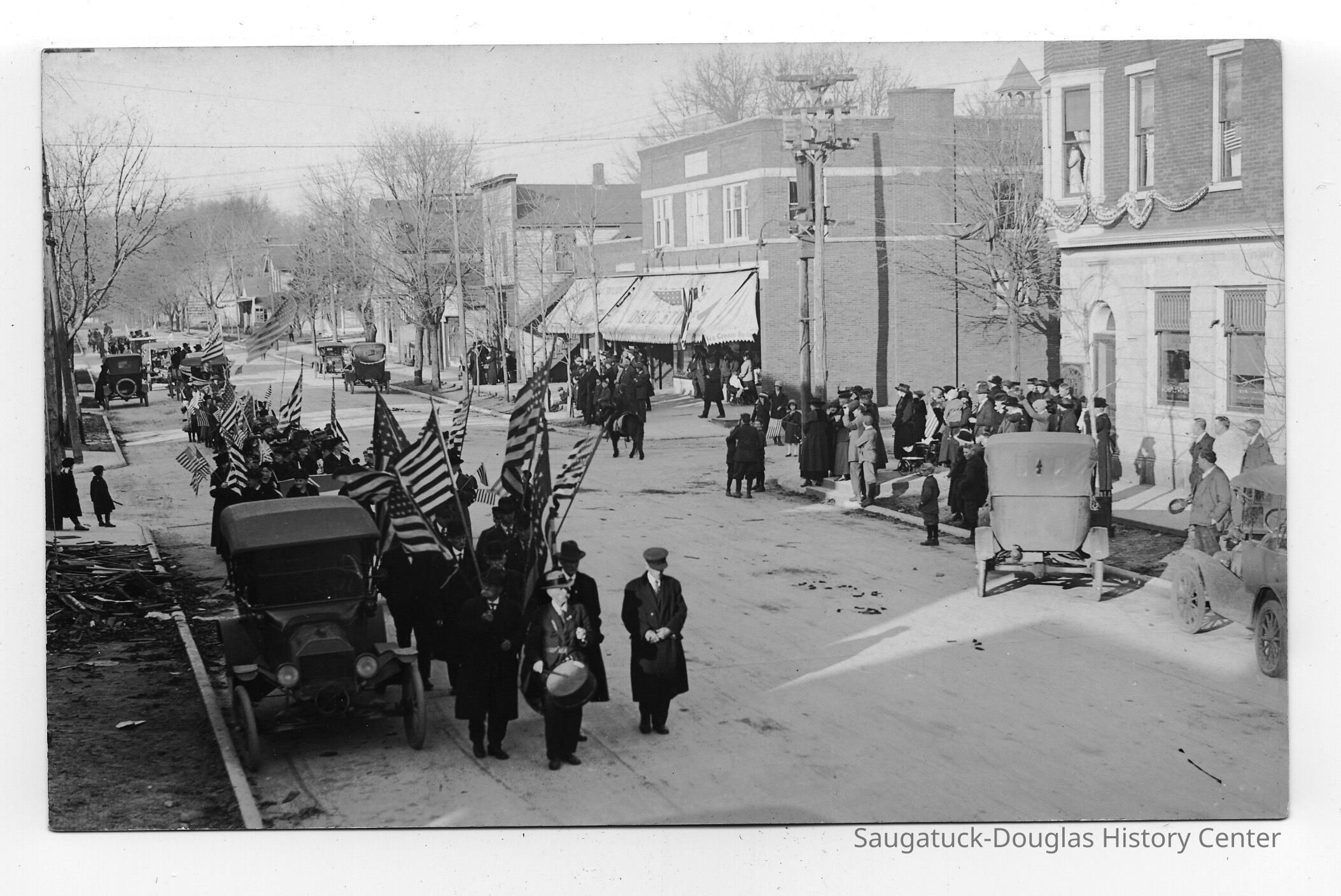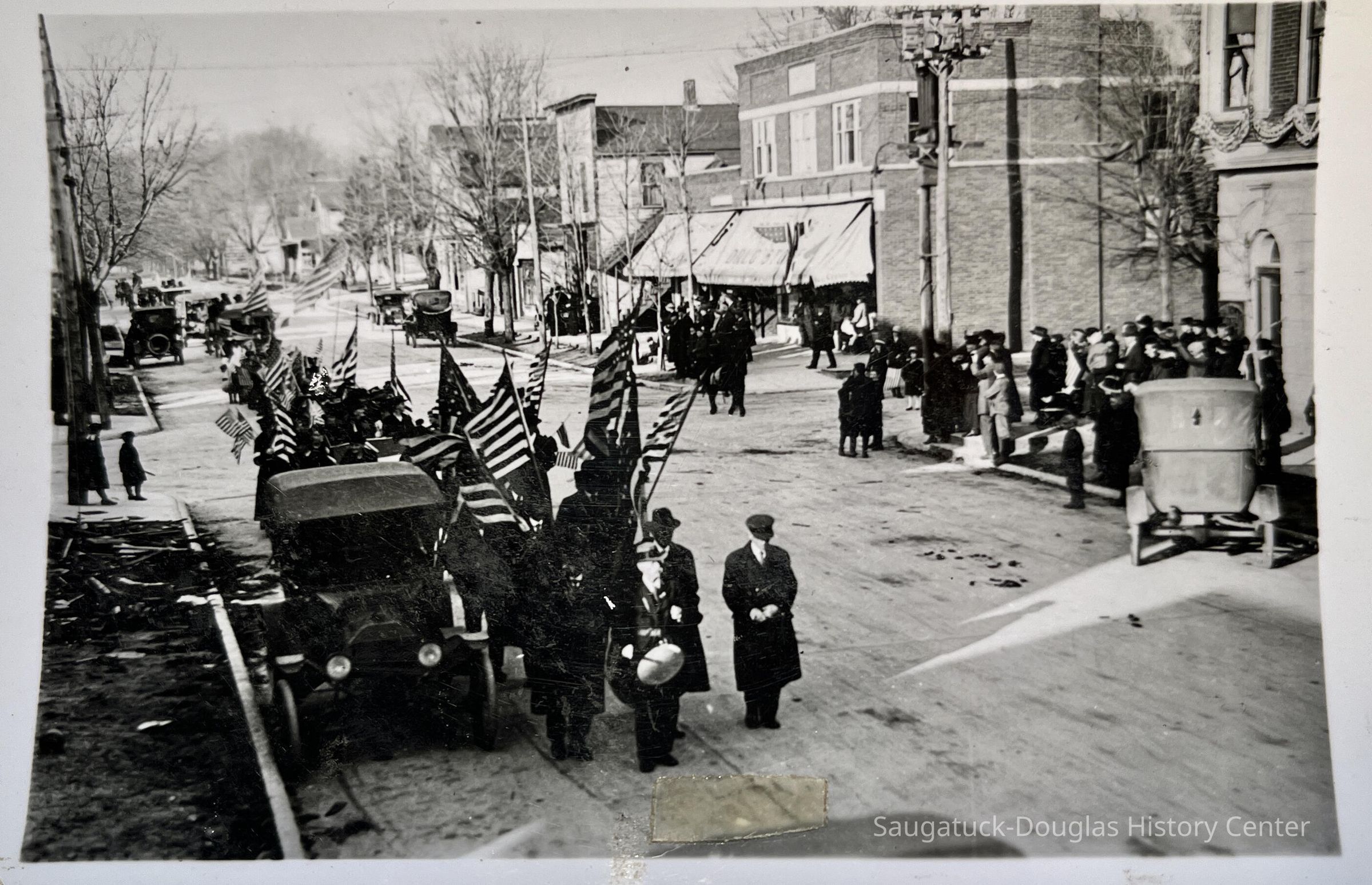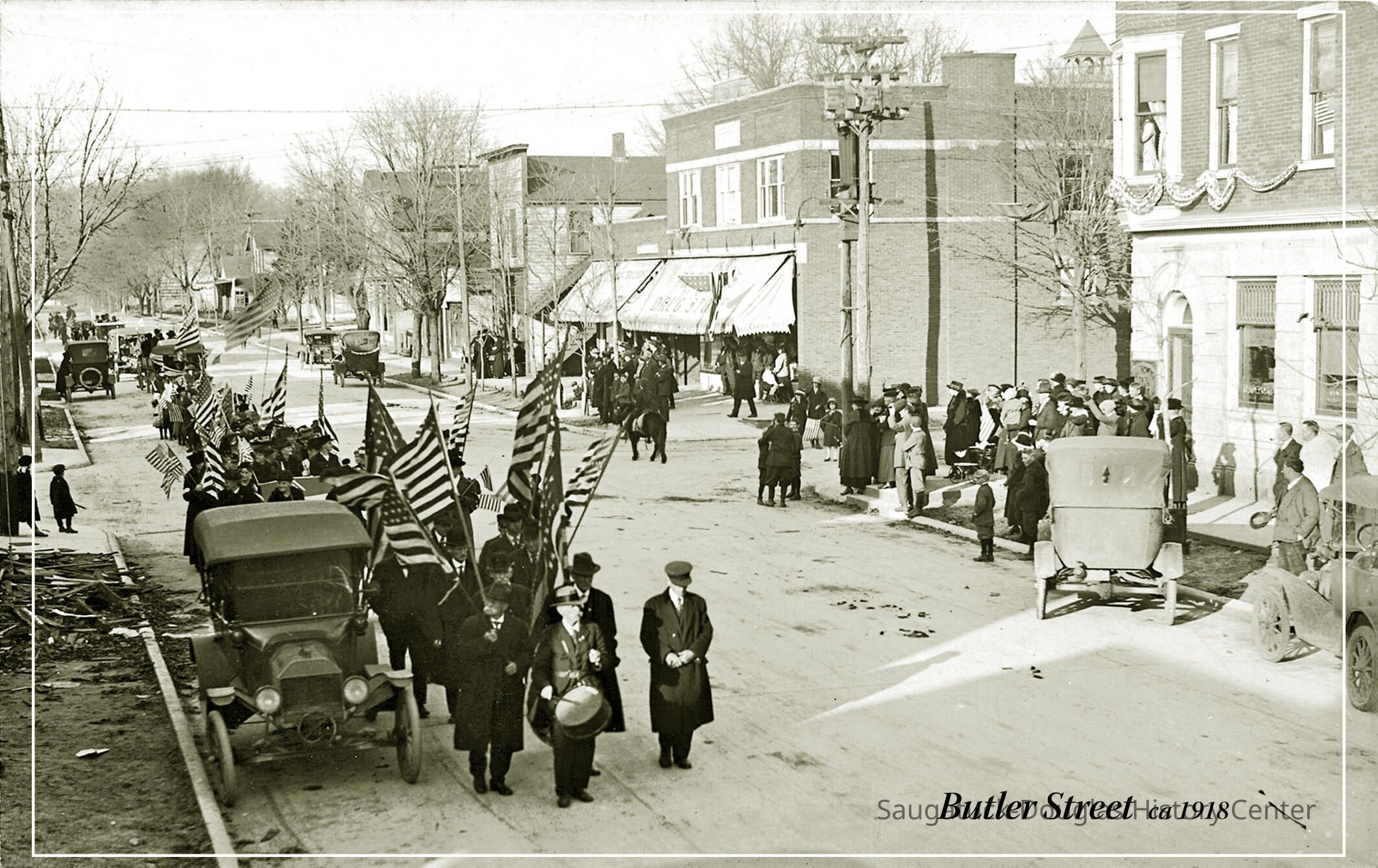 Butler Street parade: an elderly gentleman, believed to be William T. Kimsey with a cap and drum, is standing in front of a column of men bearing flags. Model T-type cars are parked along the street with parade-watchers dressed for cold weather. Corner of Mason and Butler. May be the 1918 Armistice Day parade of veterans on Butler Street.