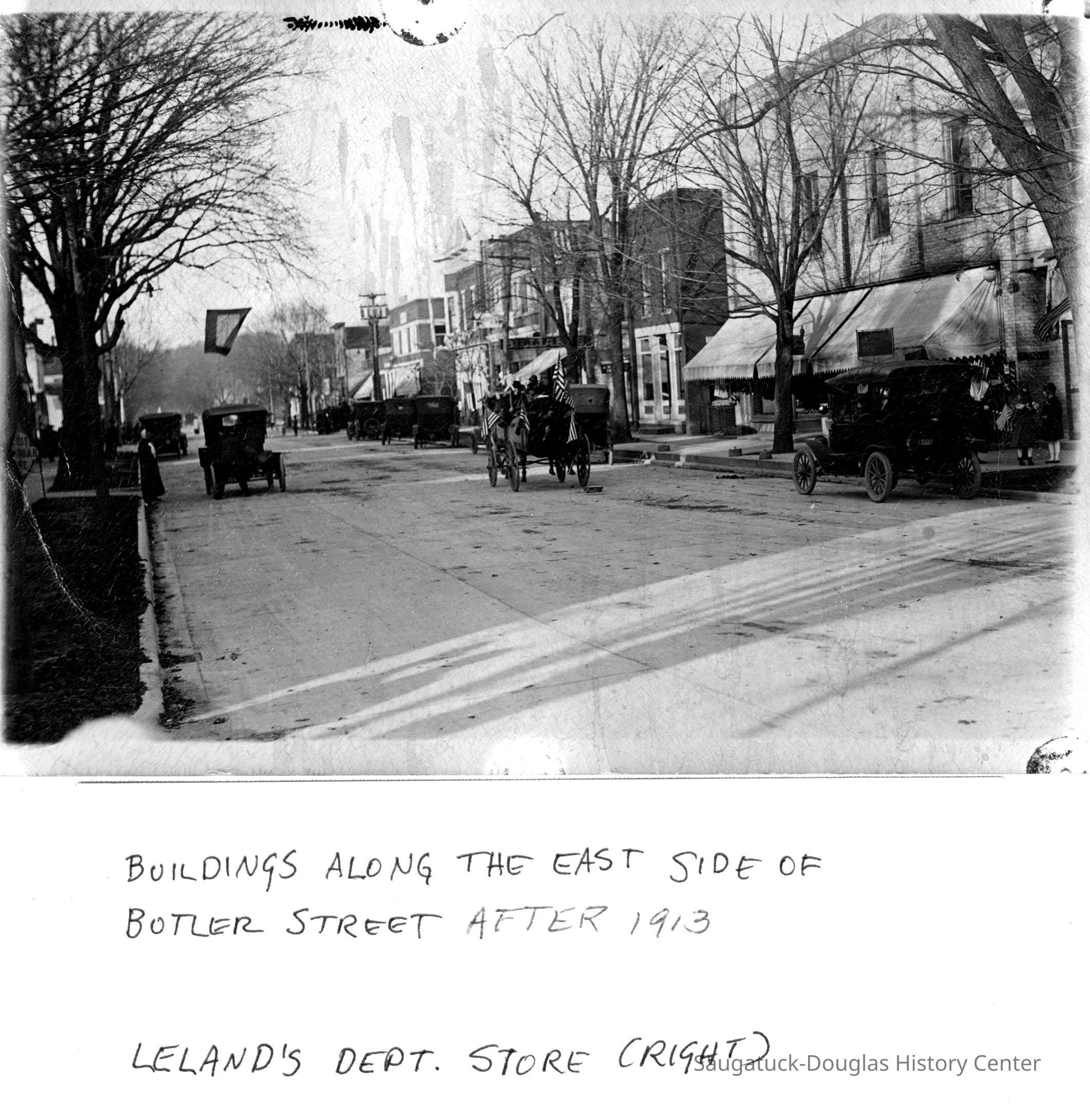 Butler Street, 119-121 Butler/Leland's Department Store Building 1907, 133 Butler/Alle Rue/Casual Man/London Shop/Goodrich Boarding house, 141 Butler/Sand Bar Saloon/Edson Crow Barbershop & Billiard Parlor, Mize Rose Garden north side/Fruit Growers State Bank/Clapp's Grocery/Flint's Shoes/Walz Meat Market/Griffin/Tanner, Mize Rose Garden south side/Soda Lounge/Crow Hotel/Davis Hotel/Davis Restaurant/Stimson & Winslow building, 201 Butler/Saugatuck Drug/Rexall/Parrish's Drug/Hotel Hamilton/Saugatuck House 1852-1913Collection