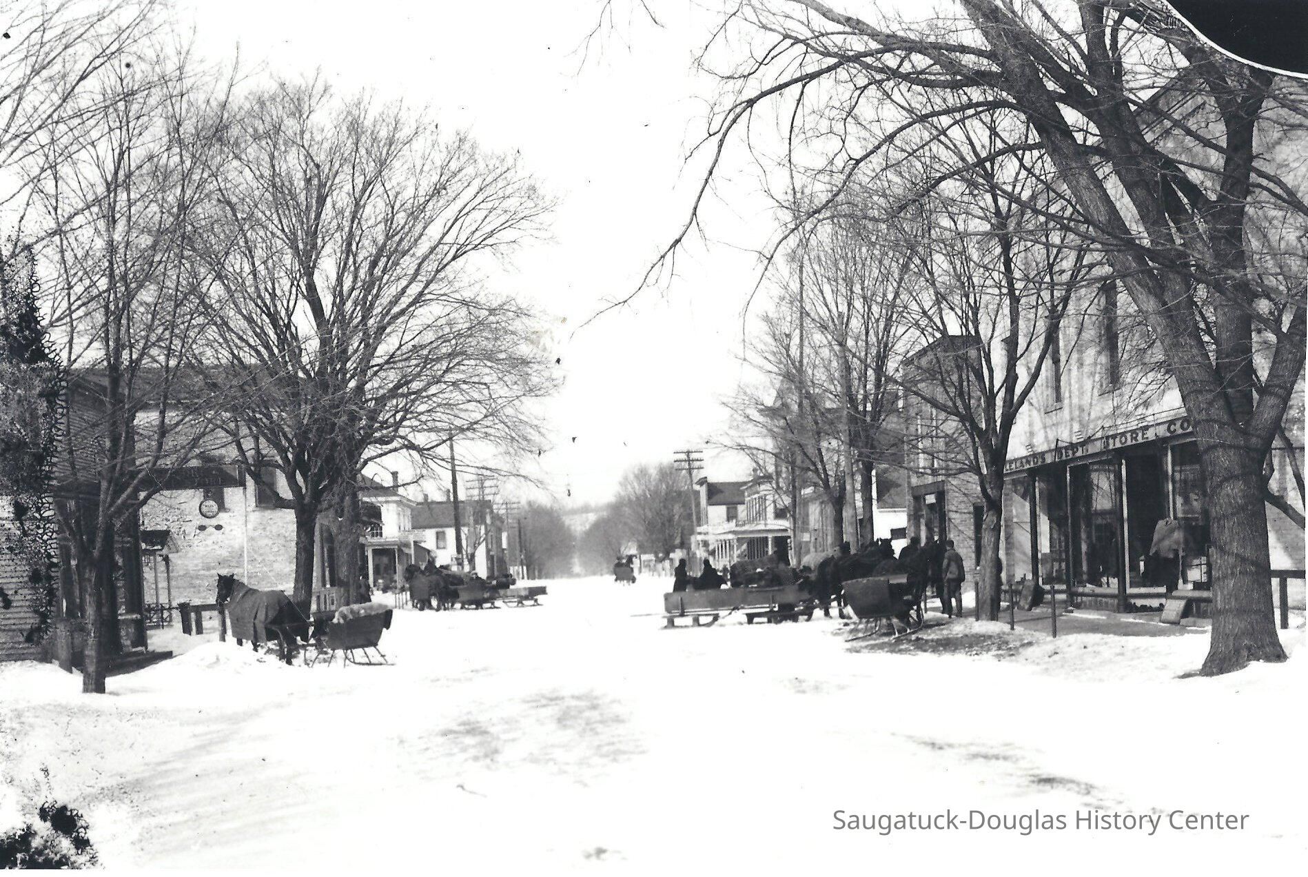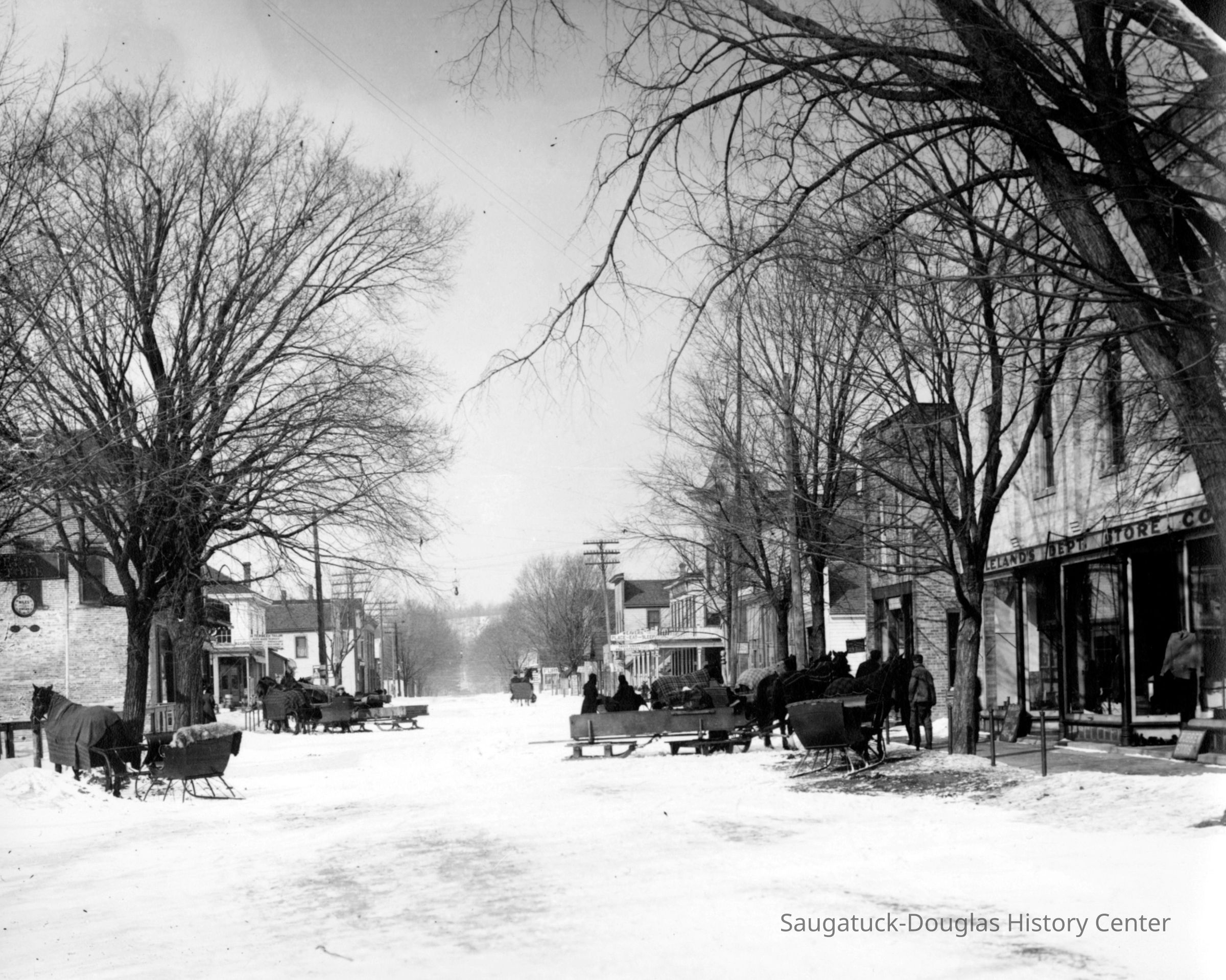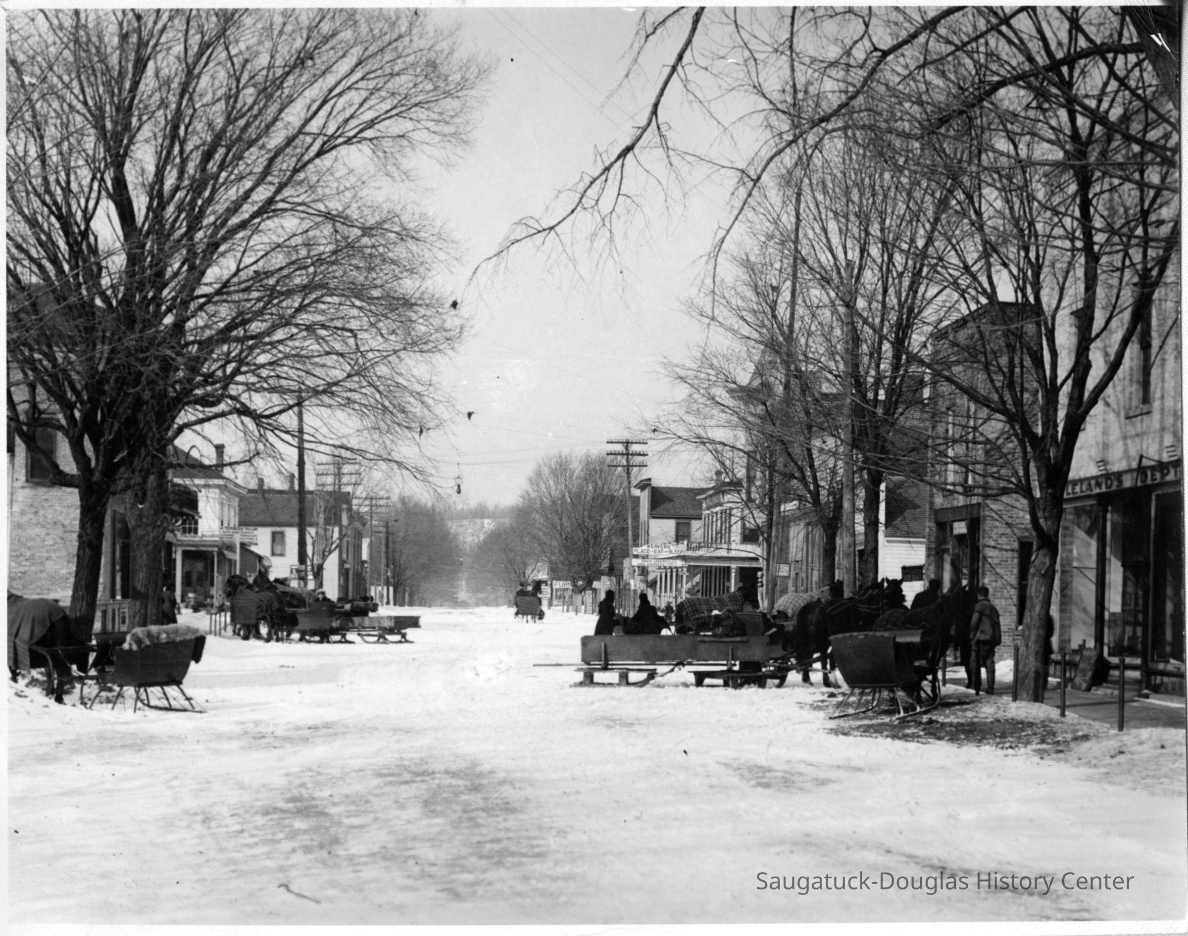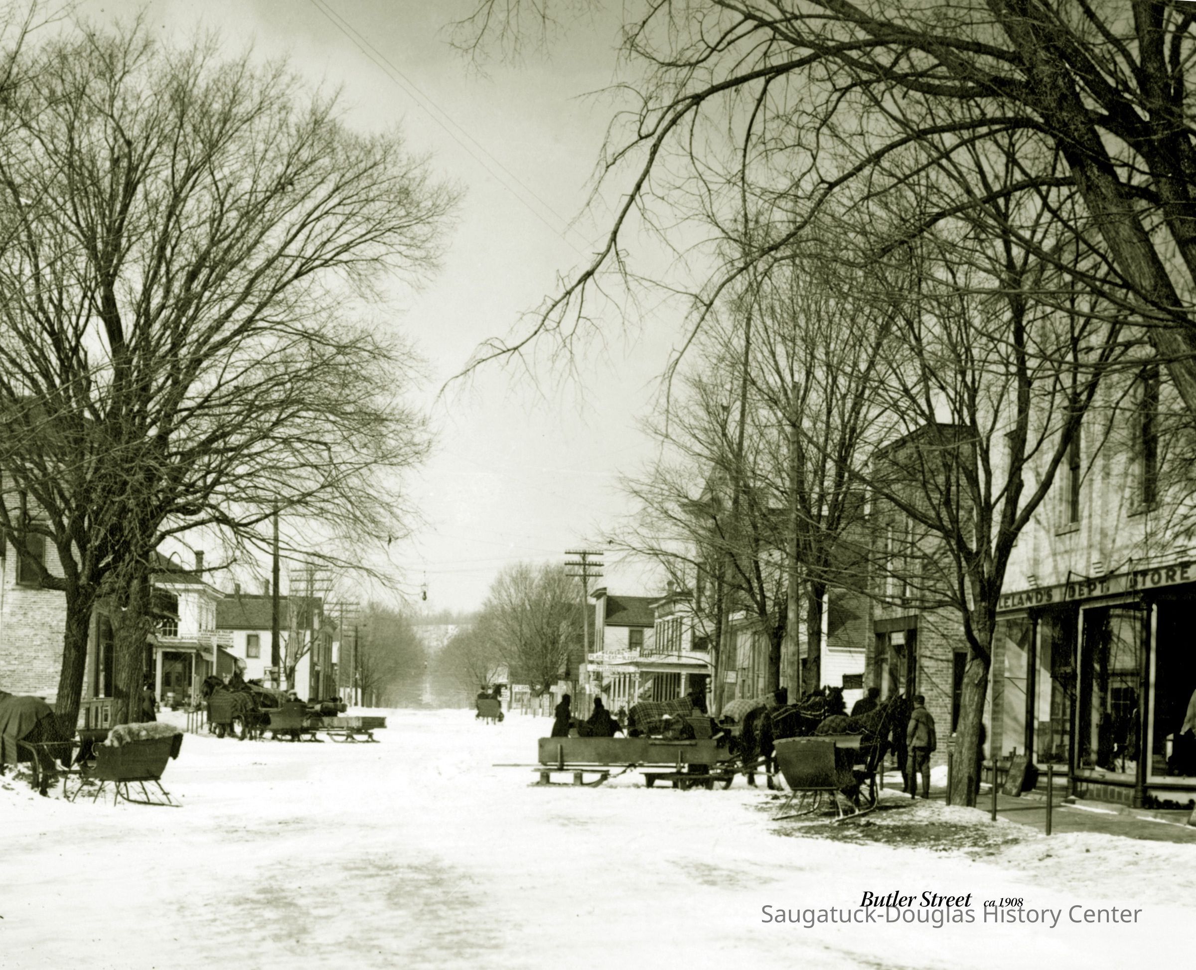 Photograph of Butler Street in the snow showing various sleds and horse-drawn sleighs or cutters in front of Lelands Department Store.Photograph Details