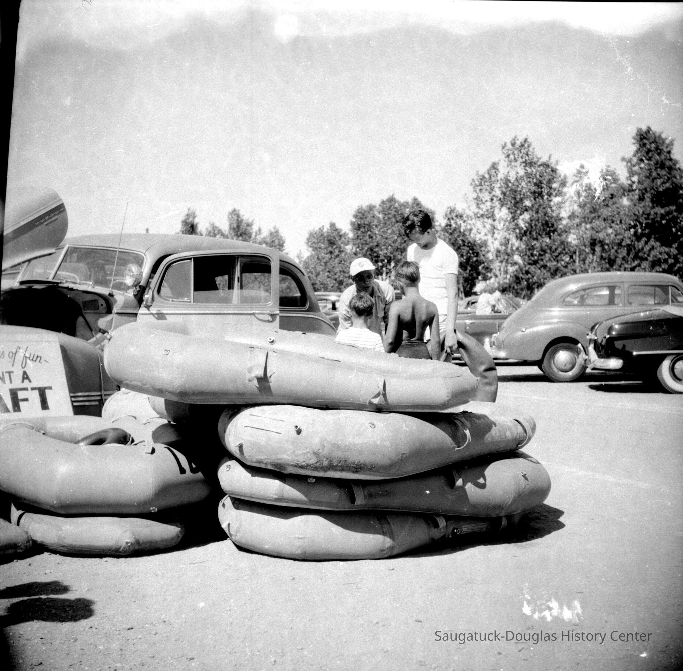 Car with a variety of inflatables boats and mats available for rent at Oval Beach. Edwin J. Bombly listed in 1956 telephone directory.