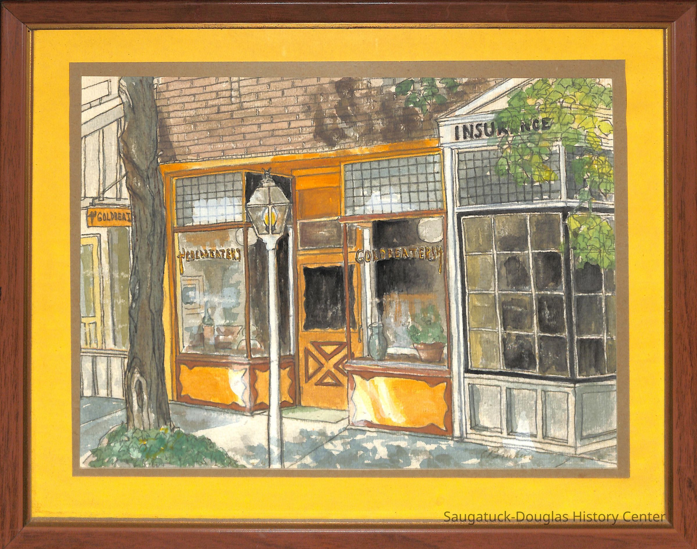 Watercolor painting of the (2nd) Goldbeaters location in downtown Saugatuck. Painted by C. Rimkus. The painting depicts the shop's yellow and brown facade, with two plate glass windows and a central doorway. The small, square windows suggest the location was in the single-story Heath building at 314 Butler Street. The facade of building next door, marked Insurance, doe not match the way the Heath building looks today.Type of Painting