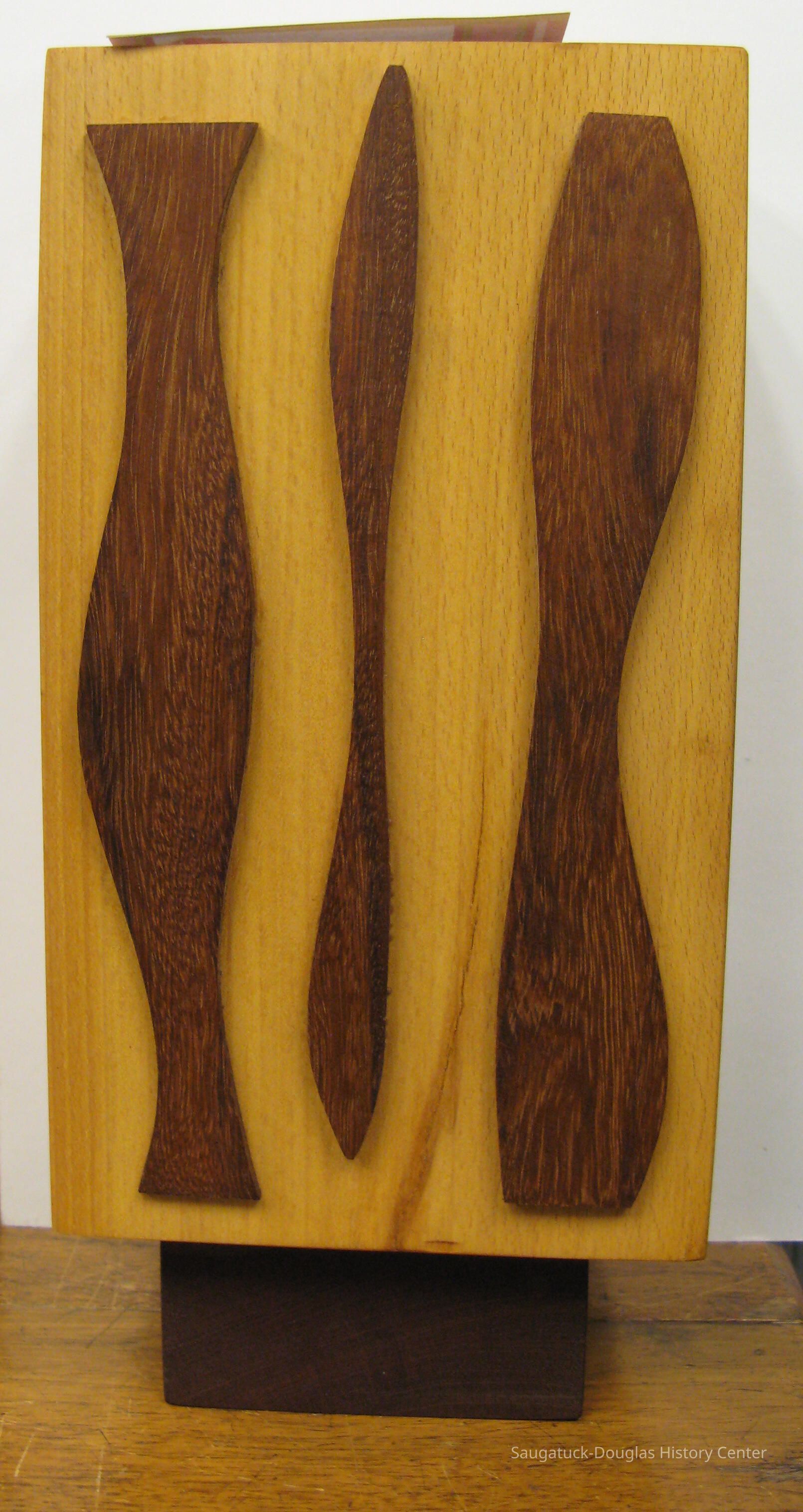 Mid-century wooden sculpture made by Norm Pera. 5.5"x11.5 " Stained blond wood with darker stained designs glued to one side. made by Norm PeraCollection