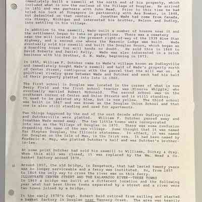 Jonathan Wade is given the official title of first settler because he immediately built a sawmill at the north end of his property, which included what is now the nucleus of the Village of Douglas. He arrived in 1851 and was partners with John Mead. Prior to this time he had tried his luck at Singapore in partnership with Asa Bowker, in 1848, but defaulted on that venture. Jonathan Wade had come from Canada, via Otsego, Michigan and interested his brother, Nelson and Dudley, into settling in his village.