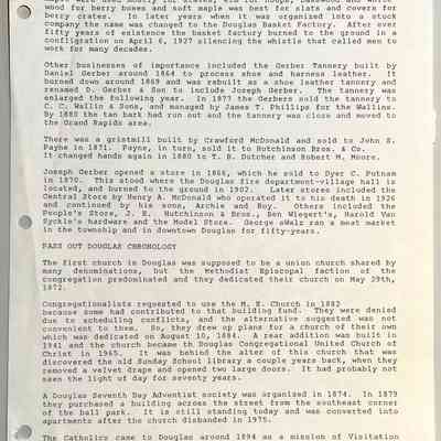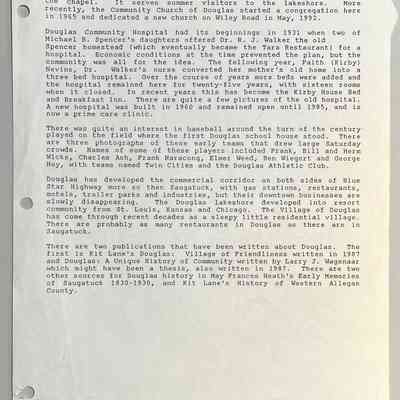 There are two publications that have been written about Douglas. The first is Kit Lane’s Douglas: Village of Friendliness written in 1987 and Douglas: A Unique History of Community written by Larry J. Wagenaar which might have been a thesis, also written in 1987. There are two other sources for Douglas history in May Frances Heath’s Early Memories of Saugatuck 1830-1930, and Kit Lane’s History of Western Allegan County.