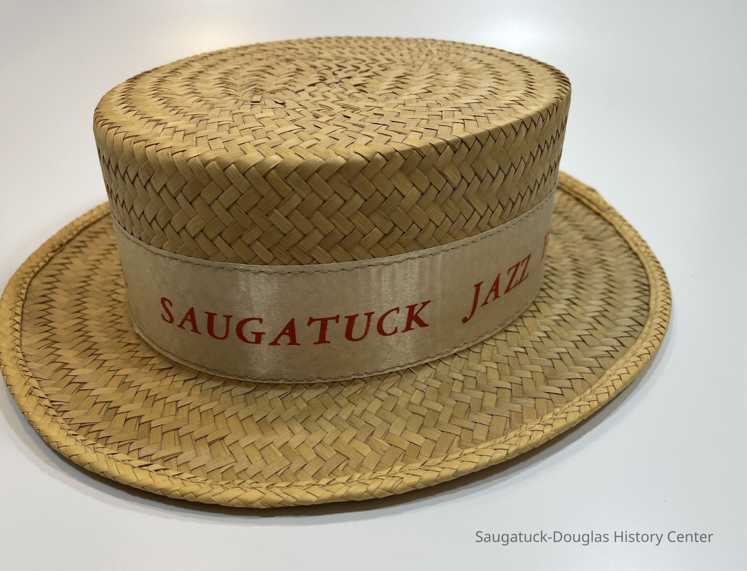 Natural colored men's straw "boater" hat with the words, "Saugatuck Jazz Festival" written in red letters on a white satin ribbon around the crown of the hat.Collection