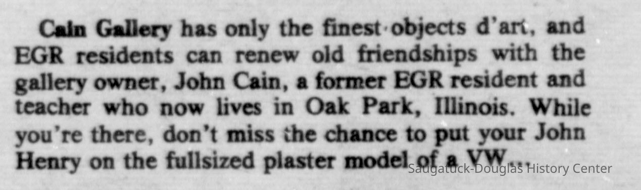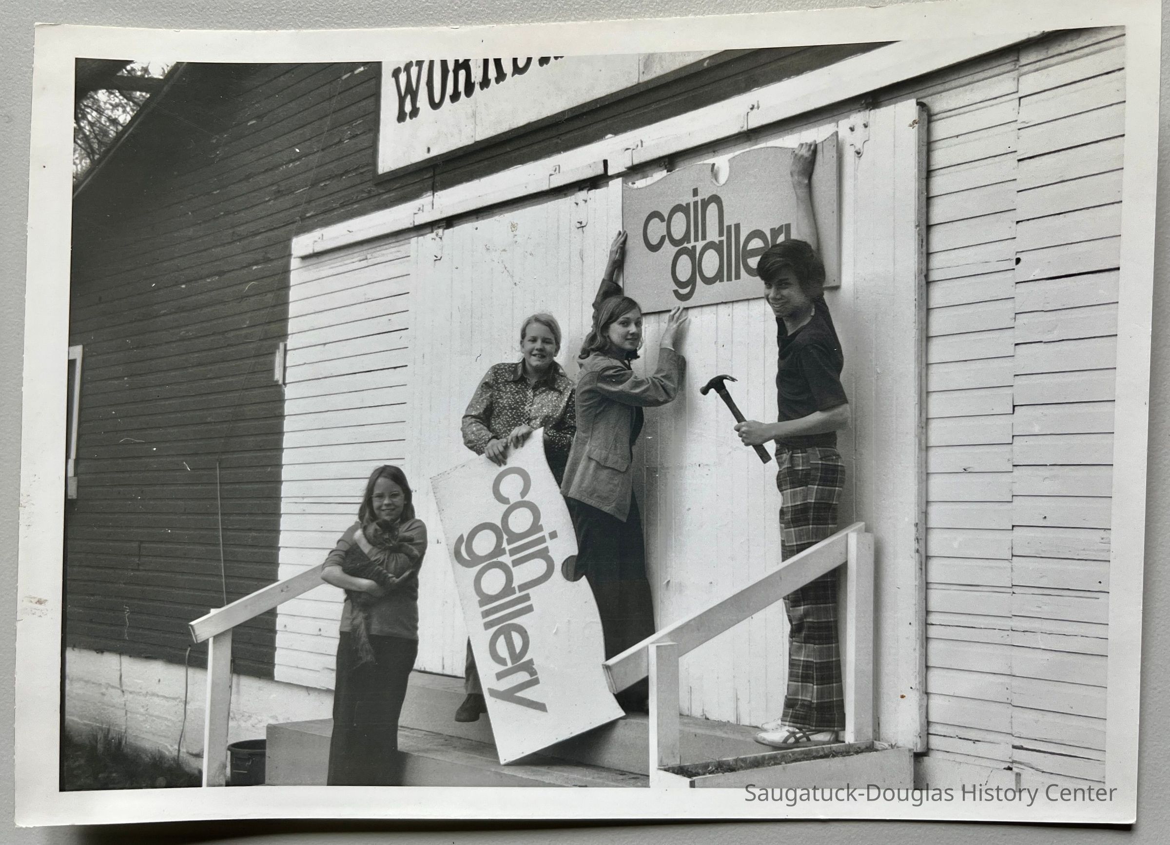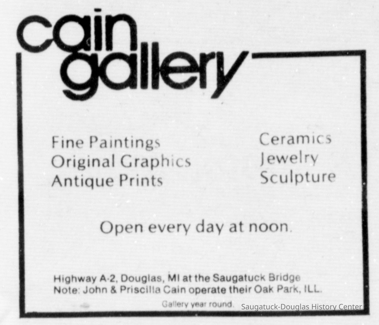 The children in the photo are likely Chris Cain, Julia (Cain) Herrick, Ceci Cain and Mary Grace Cain. In the early 1980s, the gallery moved to 322 Butler Street. The back of the print has calculation used to reproduce it in the newspaper and the following typed text "CAIN GALLERY, Douglas, Michigan, 49406, (616) 857-4353"Collection