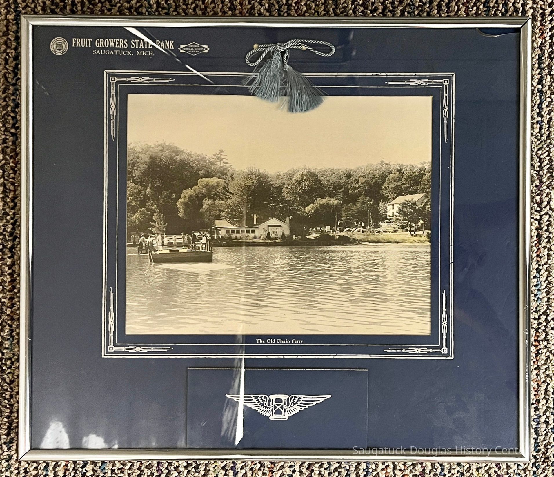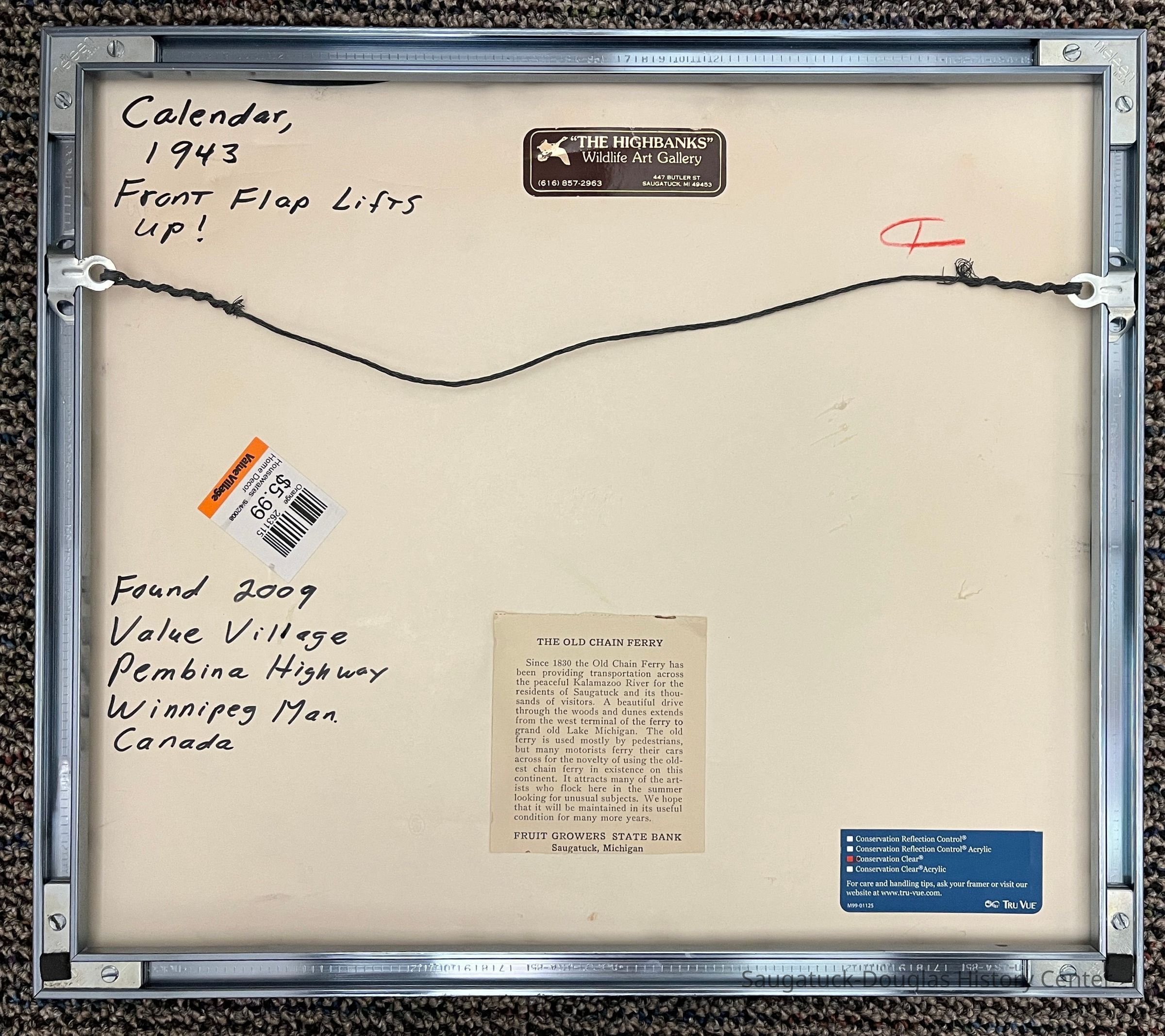 1943 calendar, hidden behind a small flap decorated with a winged hourglass. The calendar backing board features a colorized photo of the old Chain Ferry scow about half way across the river with the Ferry Store in the background. The blue mat is imprinted with the Fruit Growers State Bank logo and adorned with a blue tassel. The calendar is behind conservation glass and framed in a silver-tone metallic frame. The back of the frame has stickers for the Highbanks Gallery in Saugatuck and notes about where the items was purchased.Collection