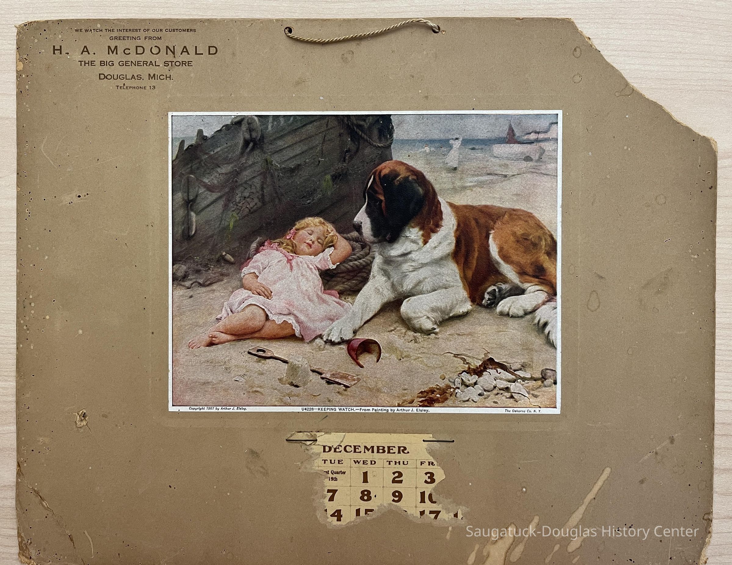 Wall calendar distributed by the H.A. McDonald - The Big General Store in Douglas Michigan. The calendar backer board has the monthly pages detached except for a portion of December. The decorative color image is of a girl slumbering on a beach, next to a St. Bernard dog and a beached boat.Context