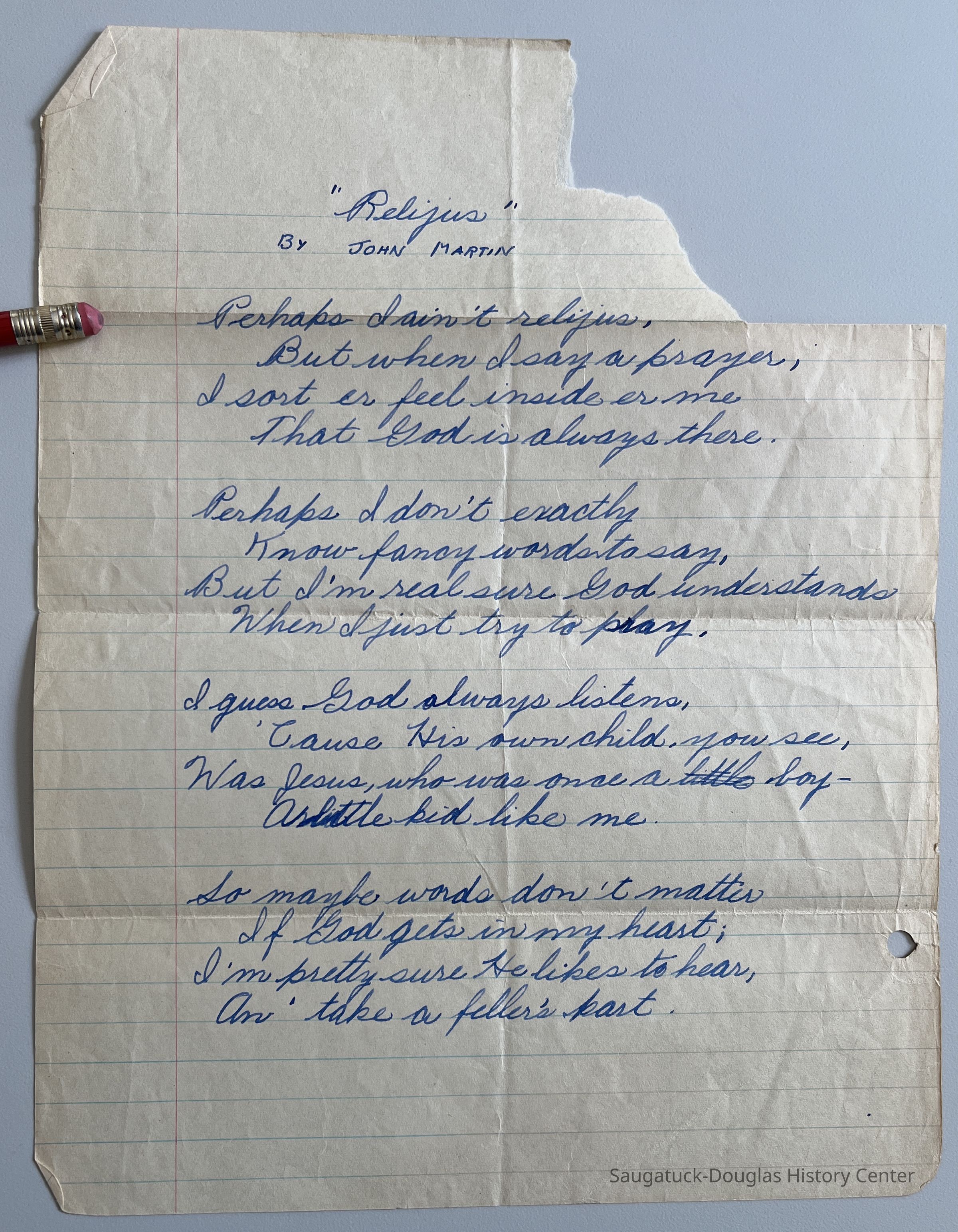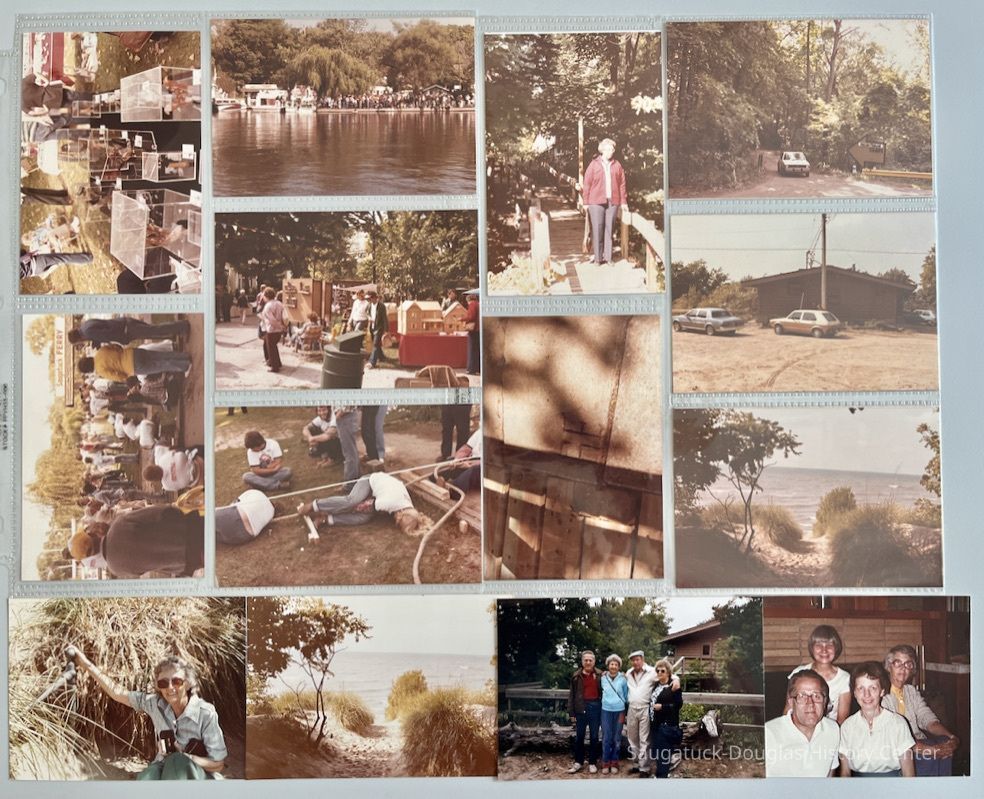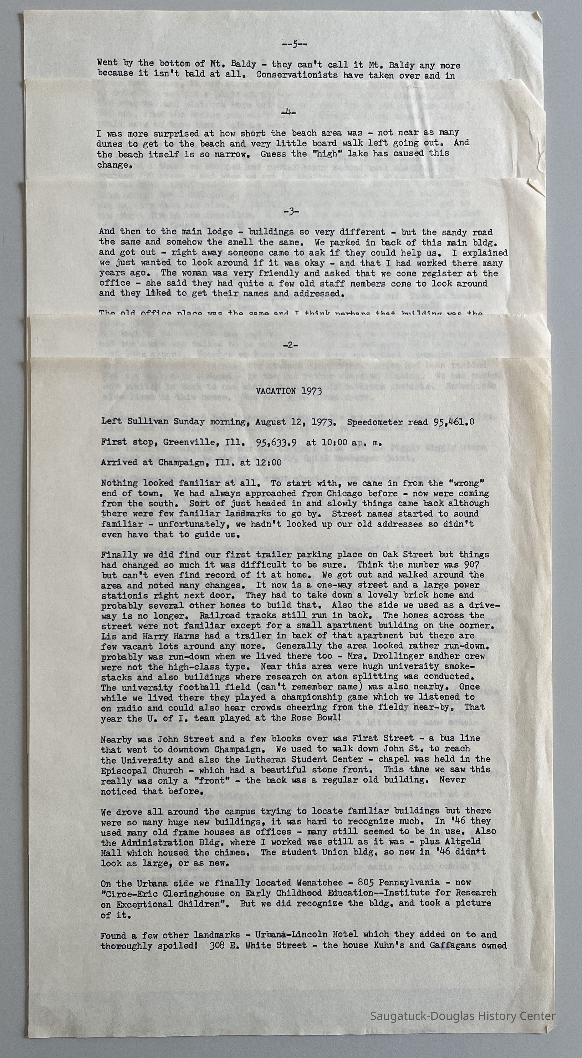 5-page typewritten account of visit to Saugatuck and the Presbyterian Camp by Majorie Kamp in 1973. Descriptions of Camps plus Arrowhead Motel, changes in town (more commercial, yachts, high water levels) and complaints about trees and golf-ball "water tower" on Mt. Baldhead.