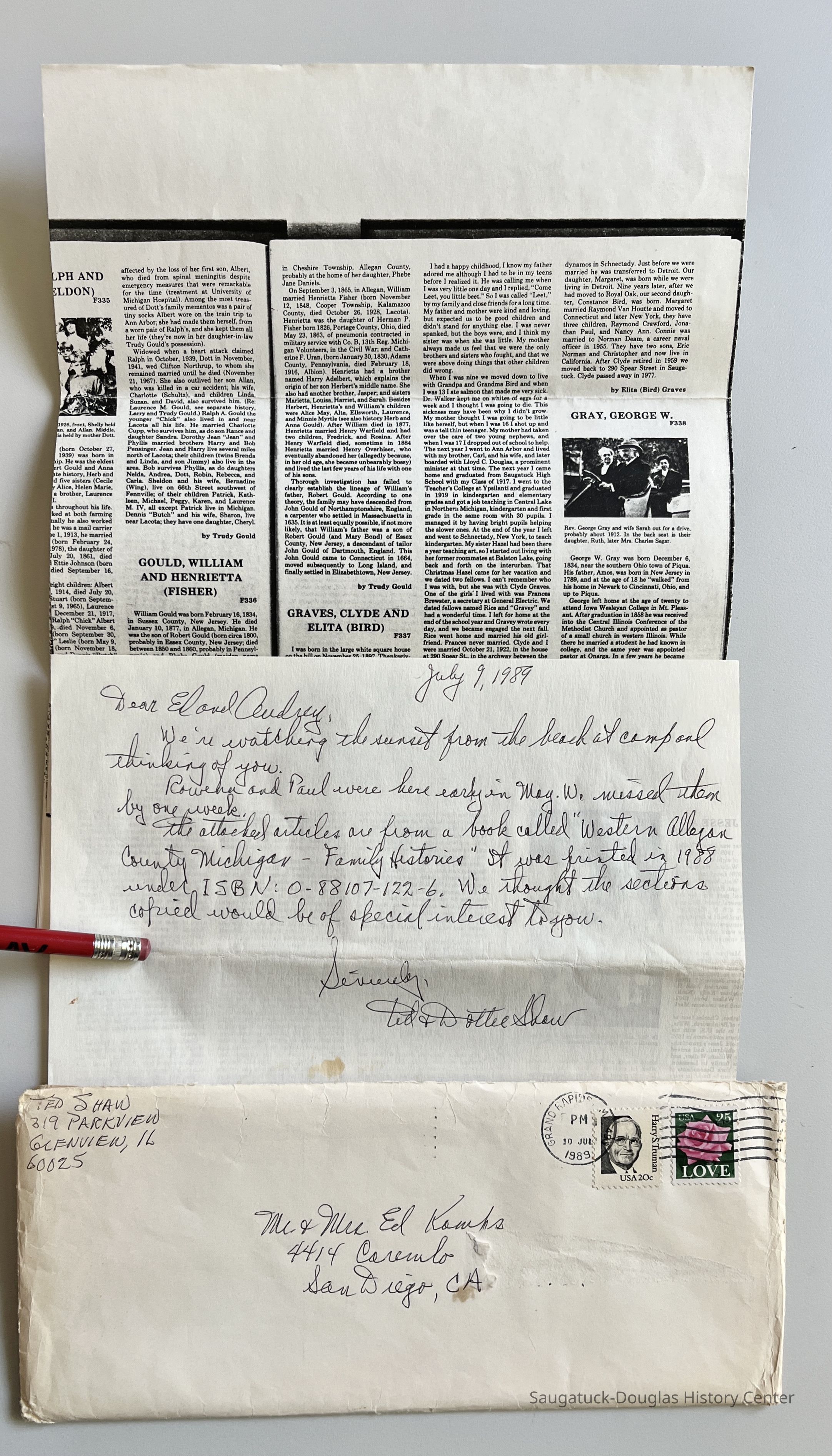 July 1989 letter to Edwin Kamps from Ted Shaw with photocopies of pages from Kit Lane's History of Western Allegan County about George Gray, William & Lynn Lankton, Rowena (Walker) Markham, Edna Walker and Roderick WalkerCollection