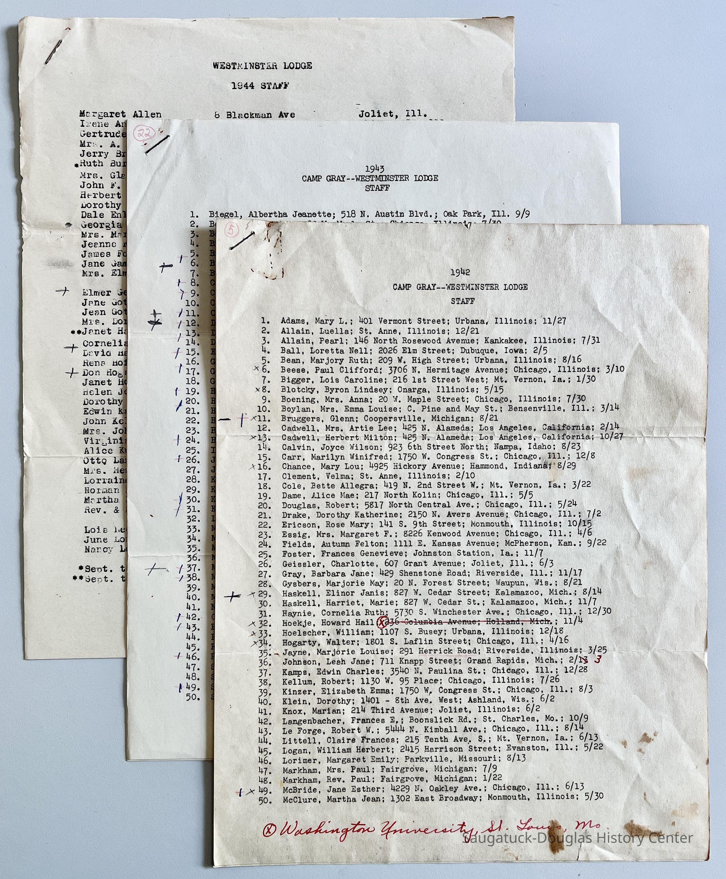 Westminster Lodge staff contact information sheets from 1942, 1943 and 1944 - photocopies of typed lists of staffers names and home addresses.