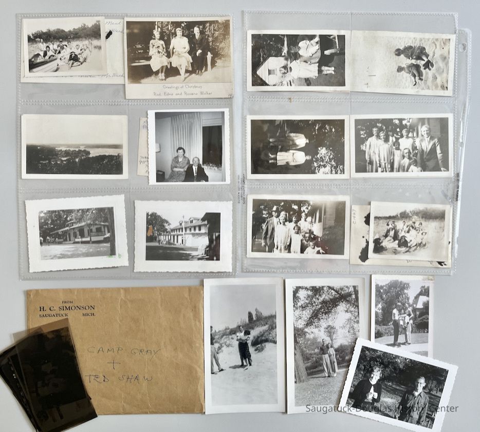 Black and white photos, mostly dated 1927, and with names written on the back. Images of Edwin and Marjorie as toddlers at camp; their parents, their grandparents Anna and Charles Pundt; photo postcard of Mr. and Mrs. Edna and Roderick "Rod" Walker and their daughter Rowena (Walker) Markham 1932; Mrs. Walker's aunt Mrs. {Addie} Jefferson; View from Mt. Baldhead in 1930s, Rod and Edna Walker Dec. 1963; the same social group in Lake Geneva and the Camp Gray beach in 1930; four photos from the 1930s of unknown teens.