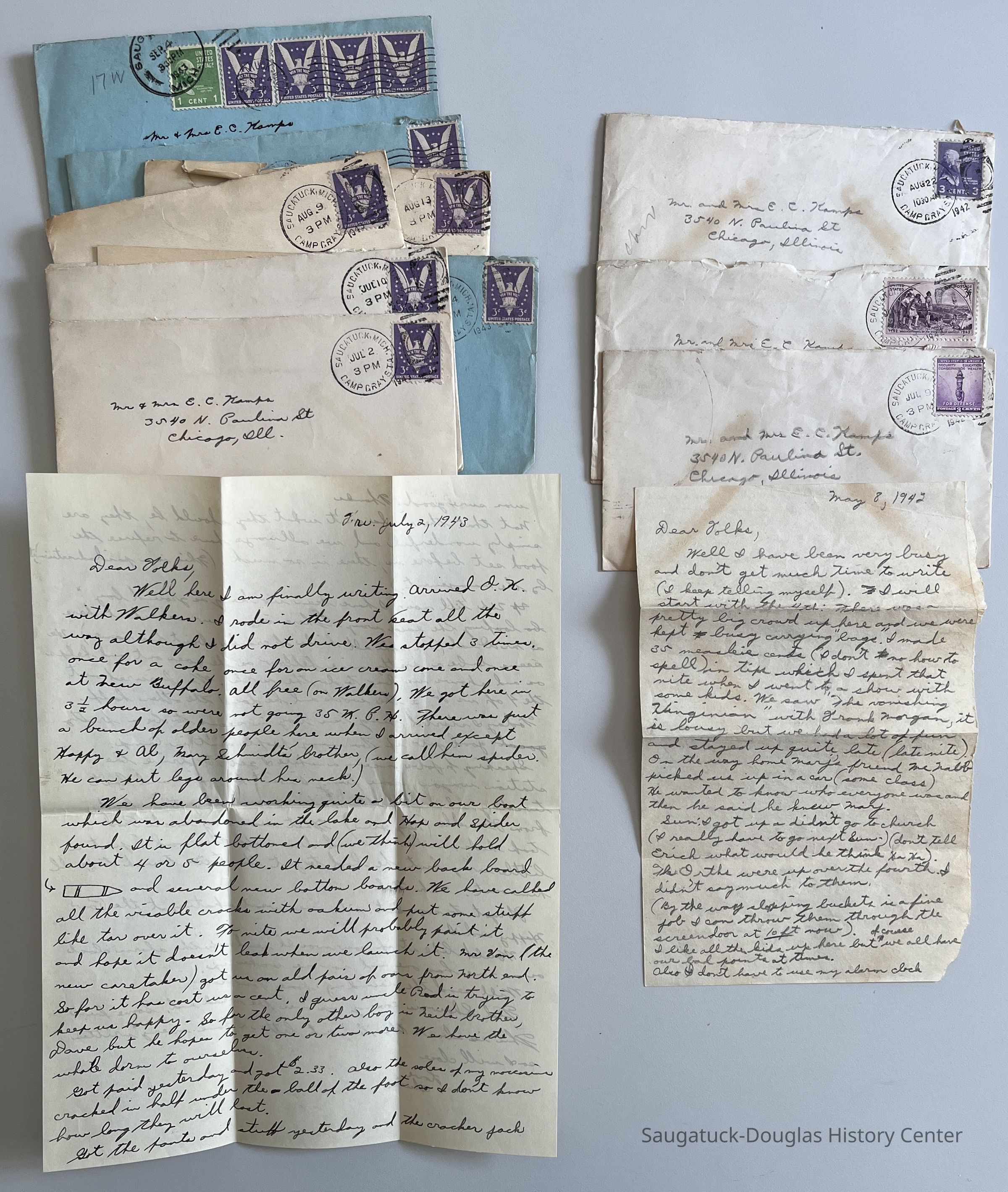 Letters and postcards written by Edwin Kamps when he worked at the Camp in 1942 (5 items) and 1943 (10 items). Mailed to his parents Mr. & Mrs. E. C. Kamps, at 3540 N. Paulina St., Chicago, Illinois.