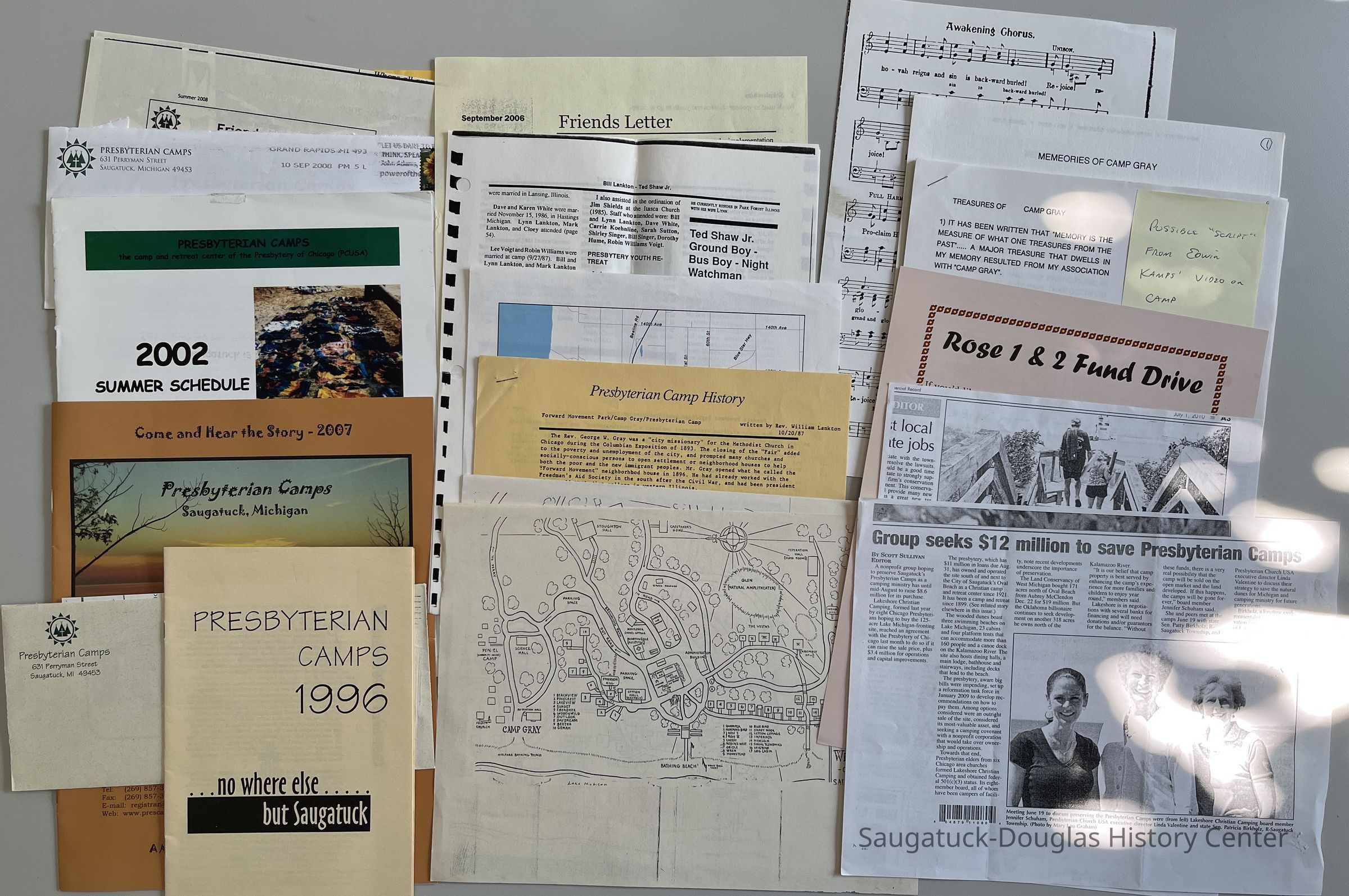 Collection of Presbyterian Camps newsletters, mailings and schedules from circa 1996 to 2008; photocopies of Westminster Lodge map and Camp Gray dining room, map of New Richmond to Saugatuck canoe trip; photocopy of Langton's 1987 camp history with 1988 note from Ted and Dottie Shaw; photocopies of biographies of Ted and Dottie Shaw and Dixie Elder from unknown publication but likely "Sand Dunes, Rope Hikes, and Parsley: Presbyterian Camps Saugatuck, Michigan (1966-90)"