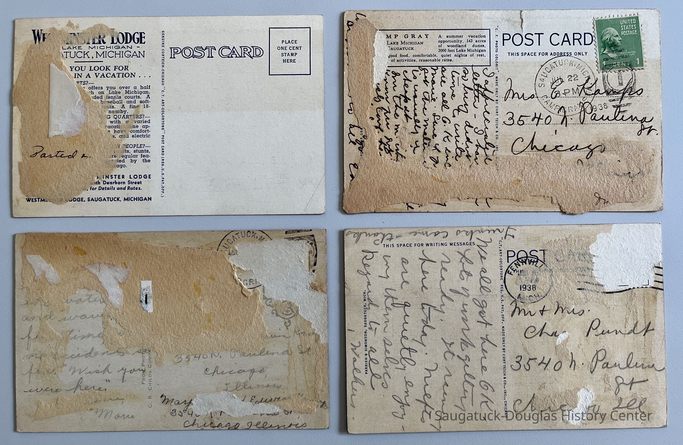 Postcards: many mailed to Kamp/Pundt family at 3540 N Paulina St. address. Two postmarked 1938. Backs of cards damaged from pasting in a scrapbook.