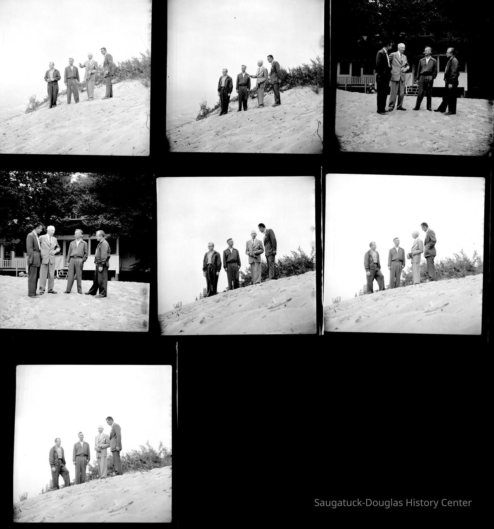 Four men in suits posed on the dunes and in front of a cottage.