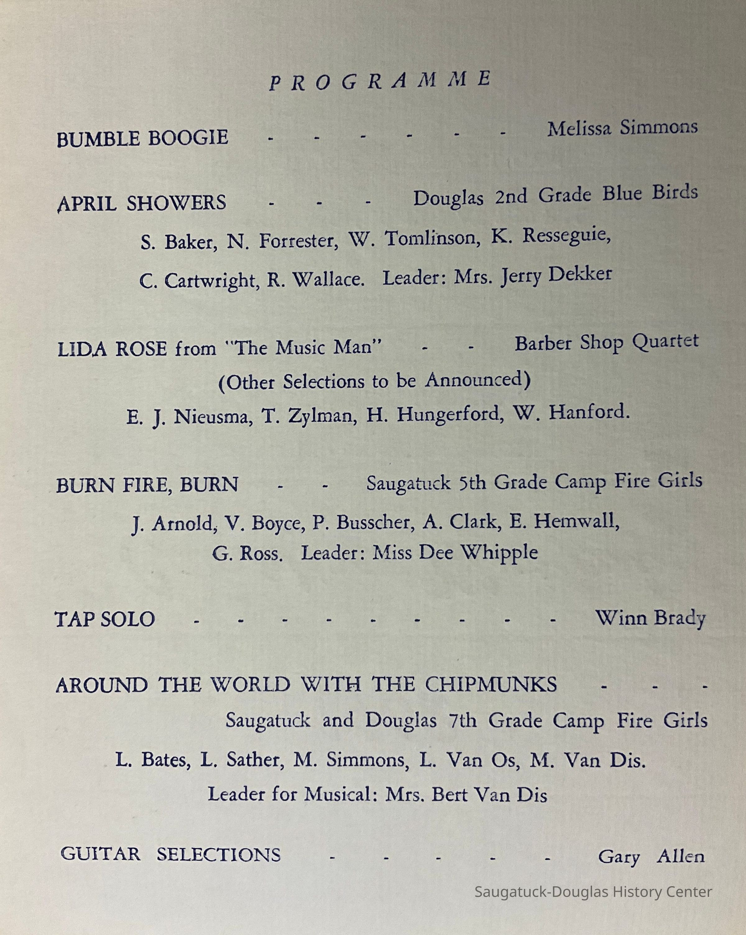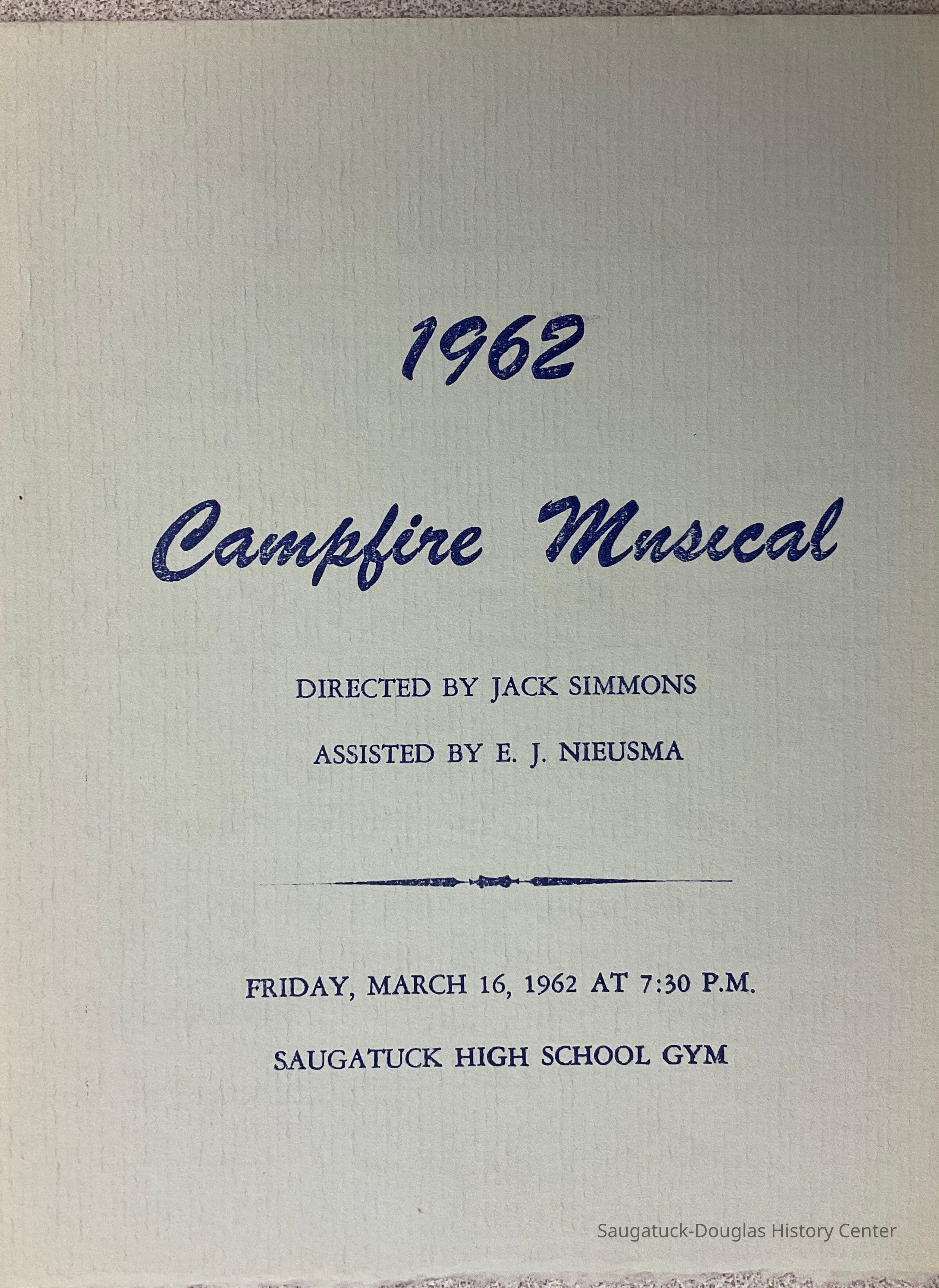 This program features blue text that reads "1962/ Campfire Musical" and contains the date, time and location information. The interior contains the program information. The back features the names fo sponsors for the Campfire Girls.Collection