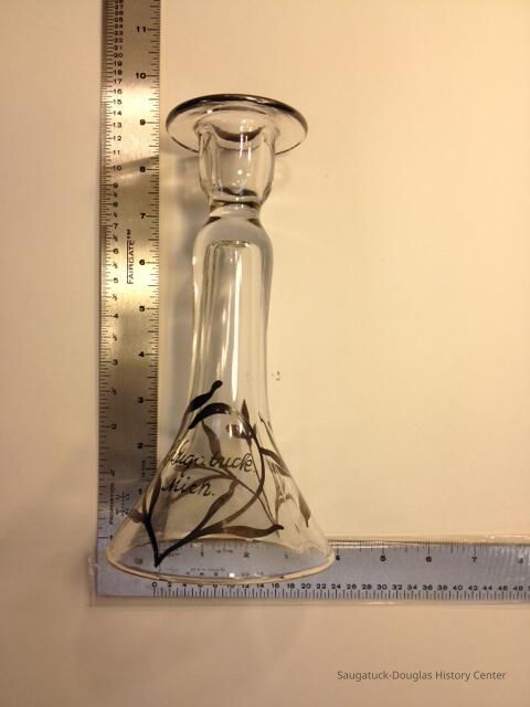 Glass candlestick with flowers painted in black. "Saugatuck Mich." is painted on one side in black.Collection