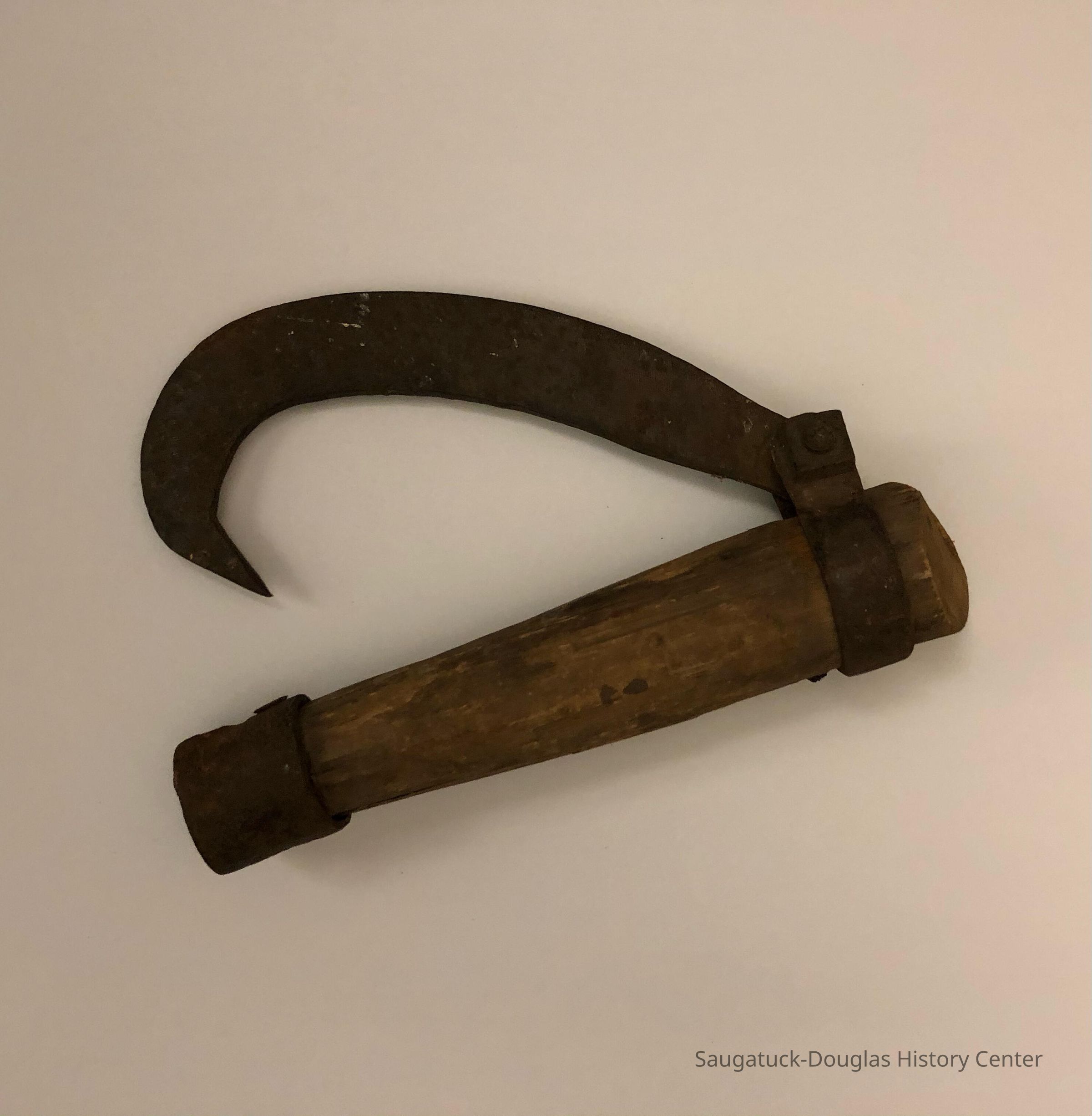A cant hook or cant dog is a traditional logging tool consisting of a wooden lever handle with a movable metal hook called a dog at one end, A peavey or peavey hook is similar, but has a spike in the end of the handle, whereas a cant dog has a blunt end or possibly small teeth for friction. Most cant hooks have a strong wooden pole with a curved, hooked, iron bar that hinges. This particular cant hook has a short handle.Cataloged By