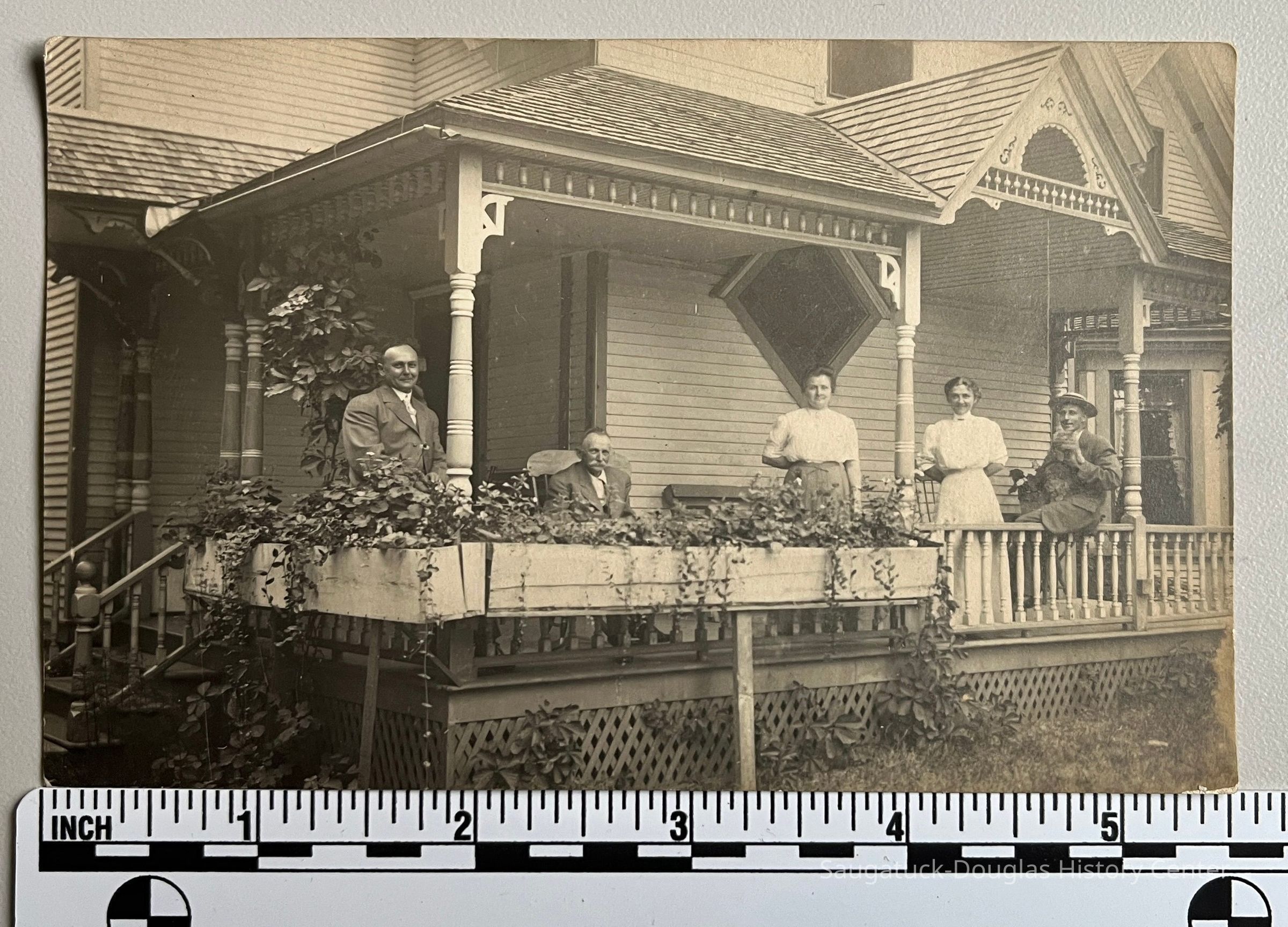 Real photo postcard of two women and three men posing on the front porch of the Captain W.G. Phelps residence at 134 State Street, Saugatuck. The porch is adorned with Victorian-style spindles and "gingerbread" plus window boxes spilling over with plantsPhotograph Details