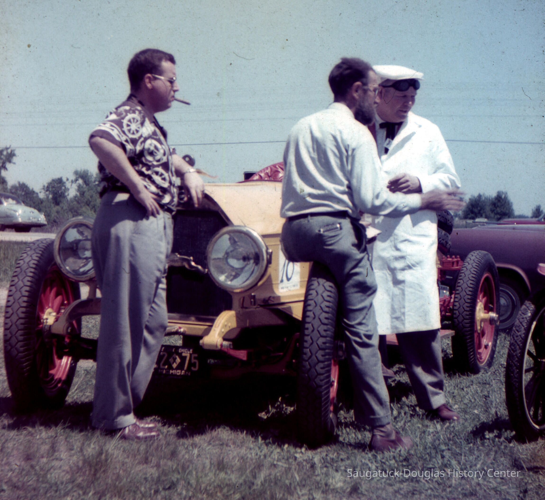 One is low-angle shot of a fenderless roadster automobile with a leaping rabbit emblem on the front grill. The car's Michigan license plate says "Historic Vehicle 1275." A man and two women dressed in 1910s-style costumes. A car parked behind the woman with the raised arm is from the 1940s. 8x10" Compare car and man in long white coat to image from a mid-1950s car rally from Jack Sheridan collection.