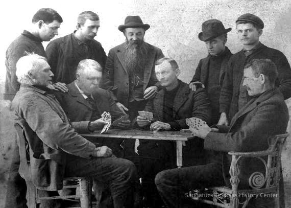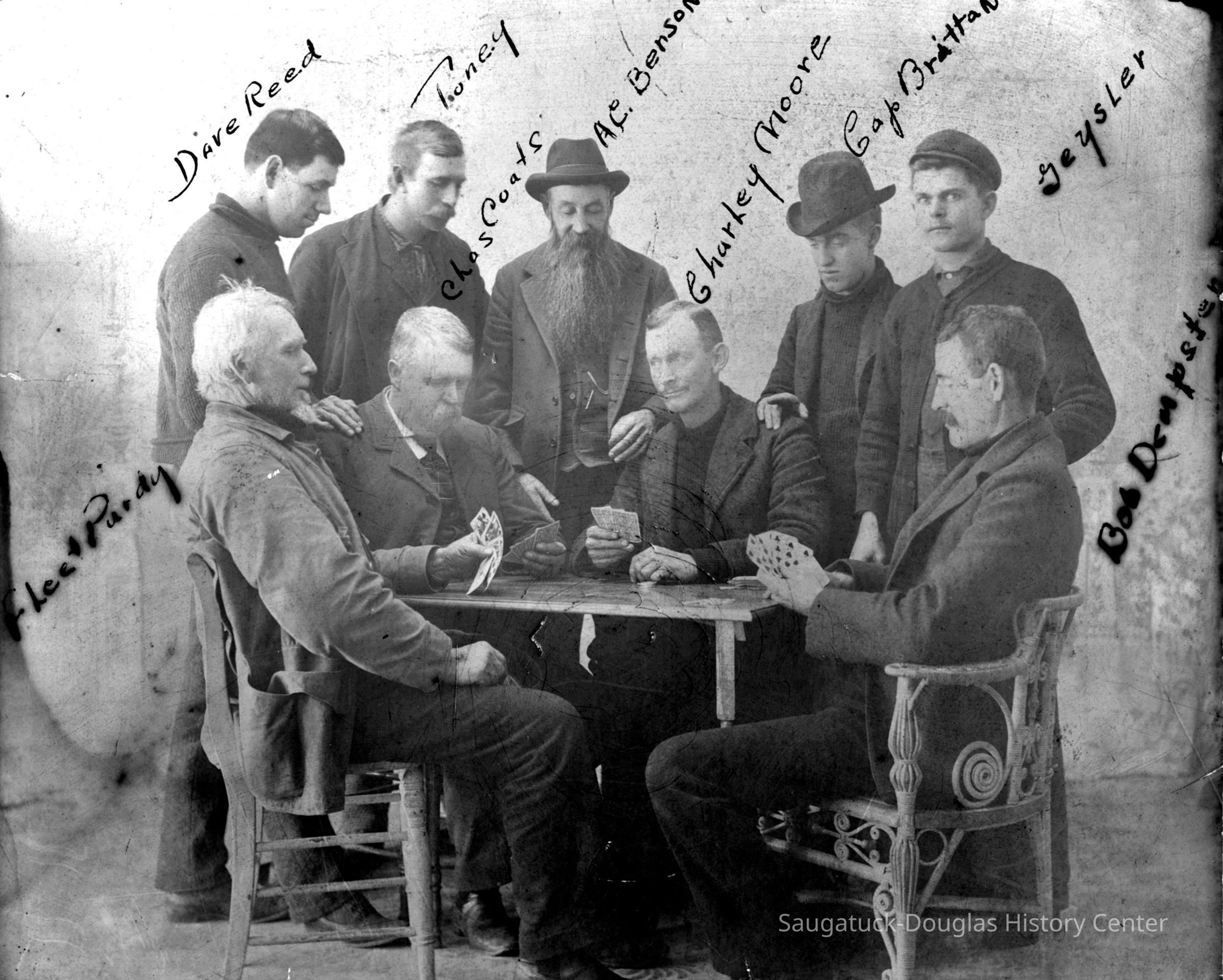 This image was featured as History Mystery #45 with the question "Area ship masters and officers get together for a friendly poker game circa 1905. Captain Fleet Purdy - 2nd from left - has an ace high straight. Can you name any of the others in the photo?" and the solution "From left: Dave Reed, Purdy, Doney, Charles Coats, A. C. Benson, Charley Moore, Captain Leonard Brittain, Geyeler, Bob Dempster."Photograph Details