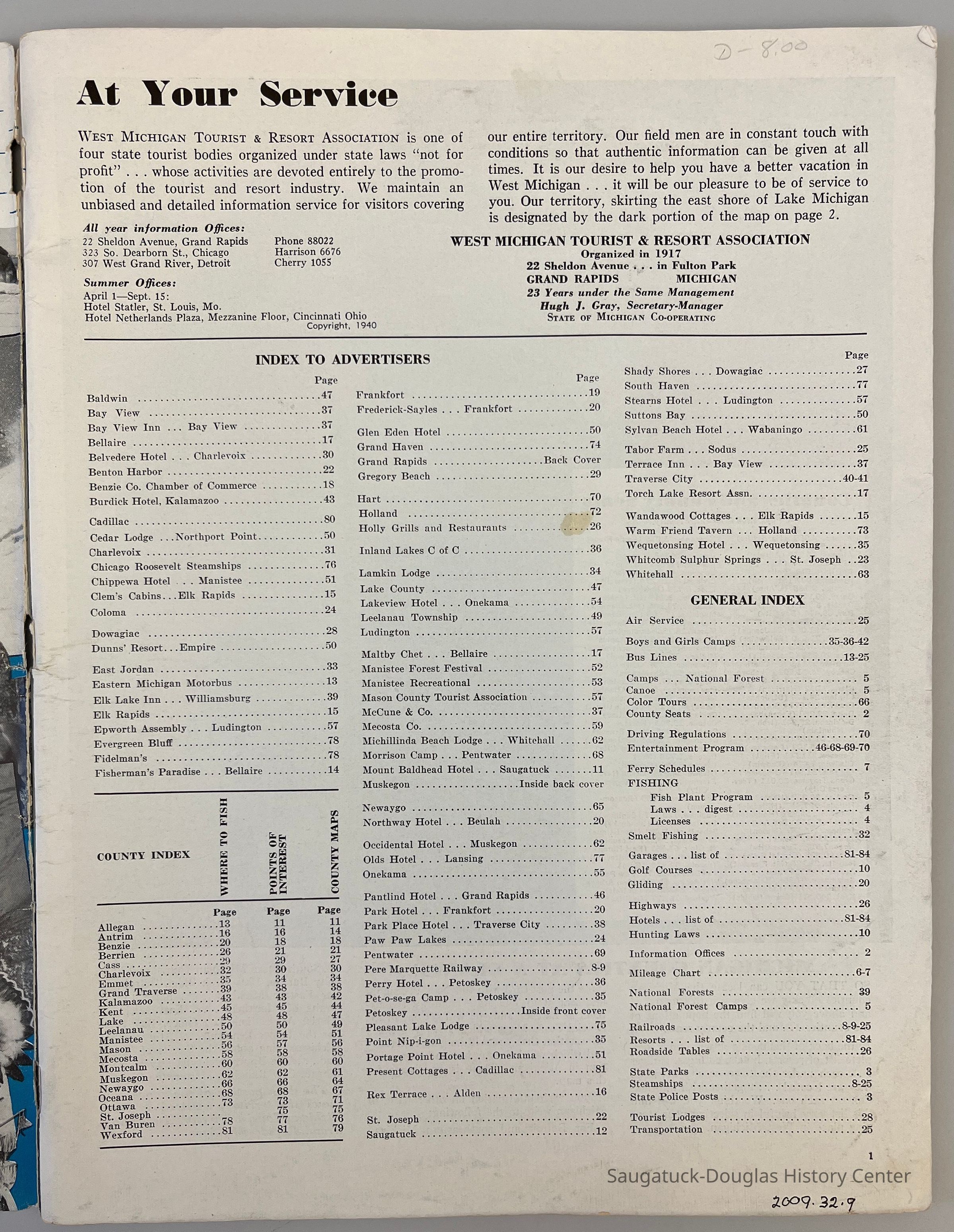 "Under Hugh Gray’s leadership, an annual guide, the West Michigan Vacation Directory, made its debut in the early 1920s and by 1927 included three-color maps that showed main highways as well as railroad and interurban lines, lakes and rivers. Also included were listings of hotels, state parks, campgrounds, golf courses, hunting and fishing regulations and traffic rules. Resort experts considered the directory to be one of the finest published anyplace in the United States. By 1936 the vacation directory had evolved into Carefree Days in West Michigan and continues today as West Michigan Carefree Travel Guide. Over the years the MTRA also went on to publish fishing, hunting and canoeing guides, to distribute seasonal booklets promoting fall color tours and winter sports and to recommend road signs to help motorists find their way."