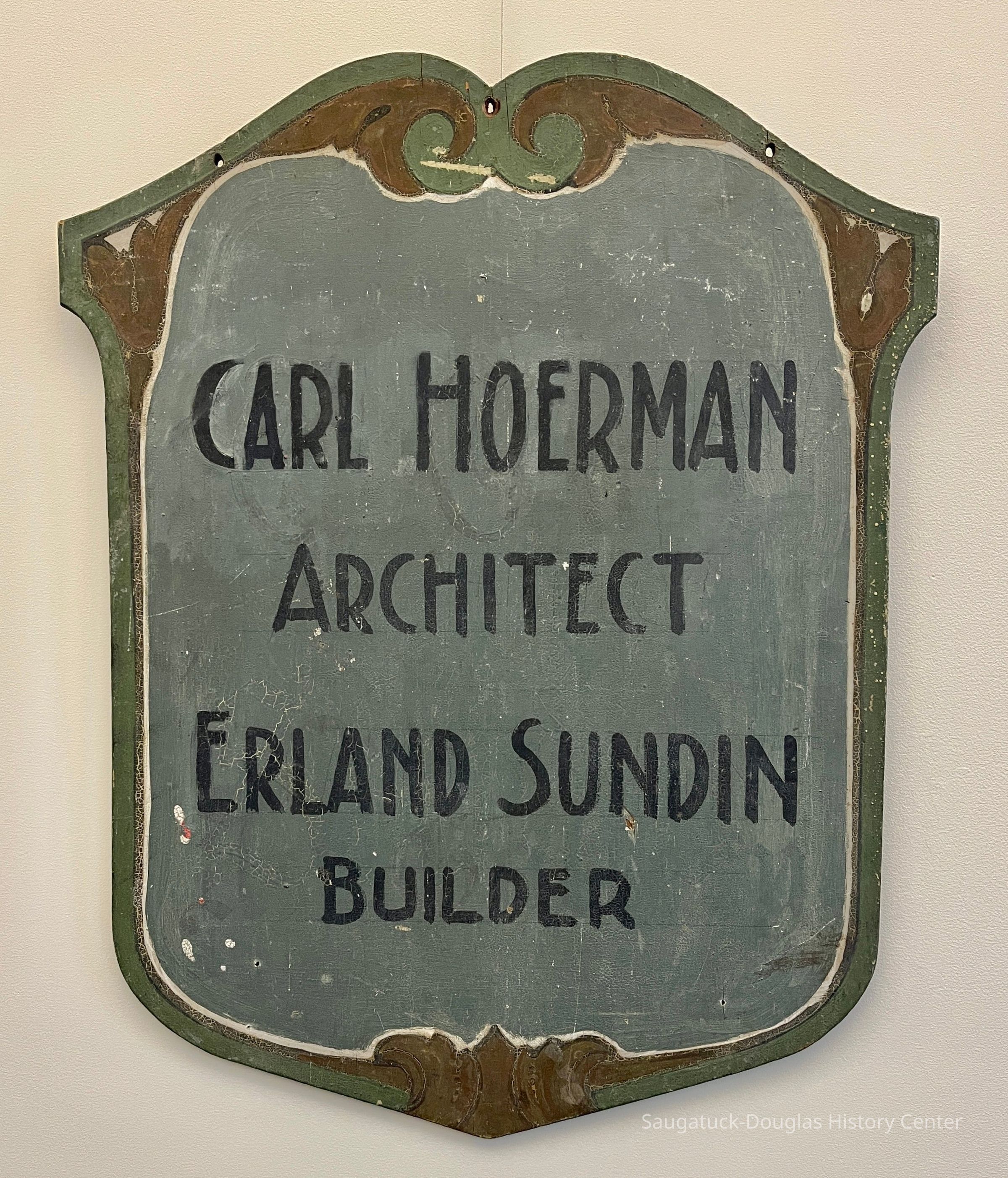Building site signboard—probably painted by Hoerman, in the Arts&Crafts manner of the time. This construction sign of 1937 marked the construction of the Merrill “cottage” at 2420 Lakeshore Drive near Pier Cove. Carl Hoerman left his native Germany as a young man to study and practice architecture in Chicago but fell in love with the Saugatuck area’s natural beauty. He spent most of his adult life painting the area landscape and designing homes, many of them large Arts&Crafts “summer homes,” but also reconstructed Saugatuck Village Hall, Congregational Church.