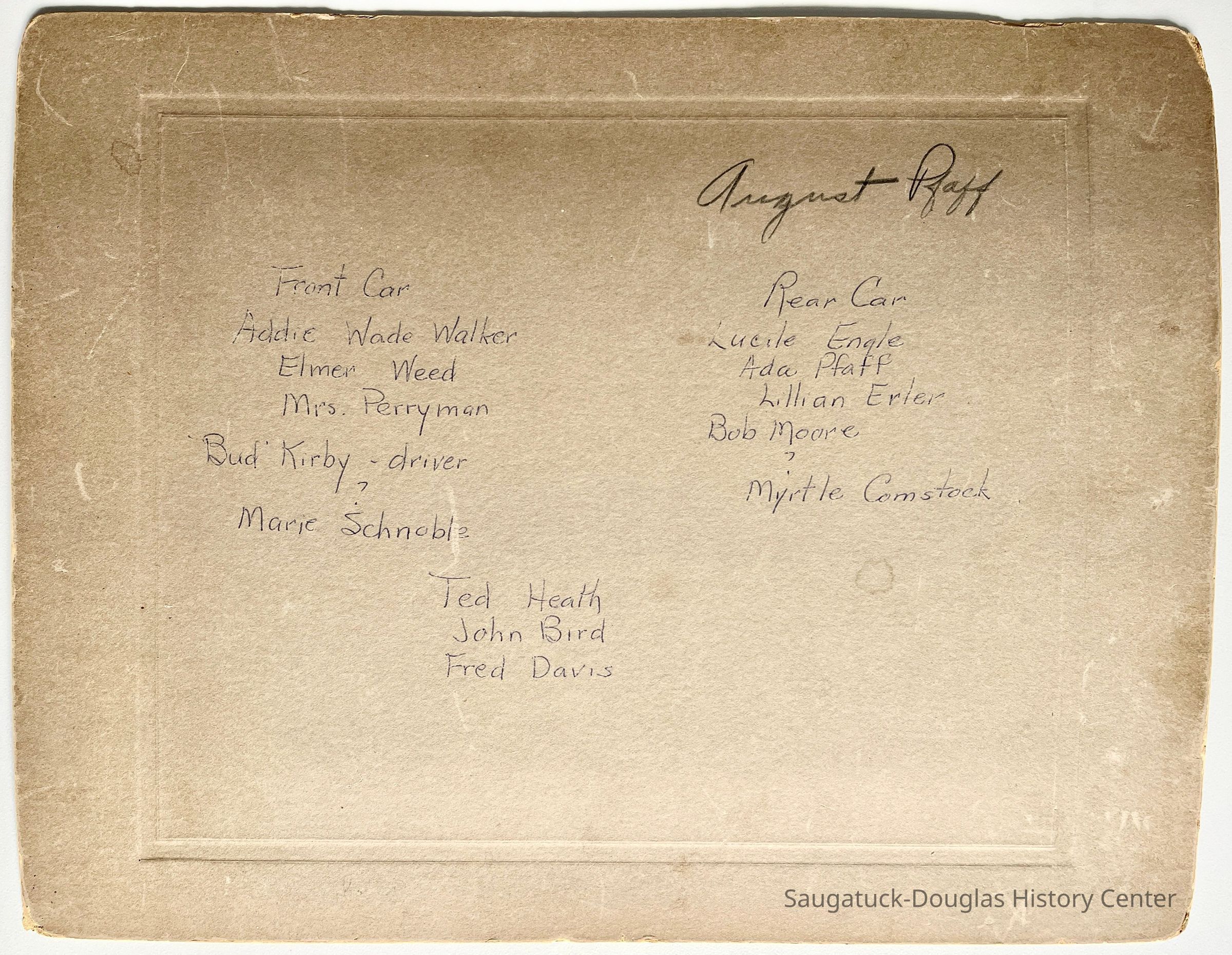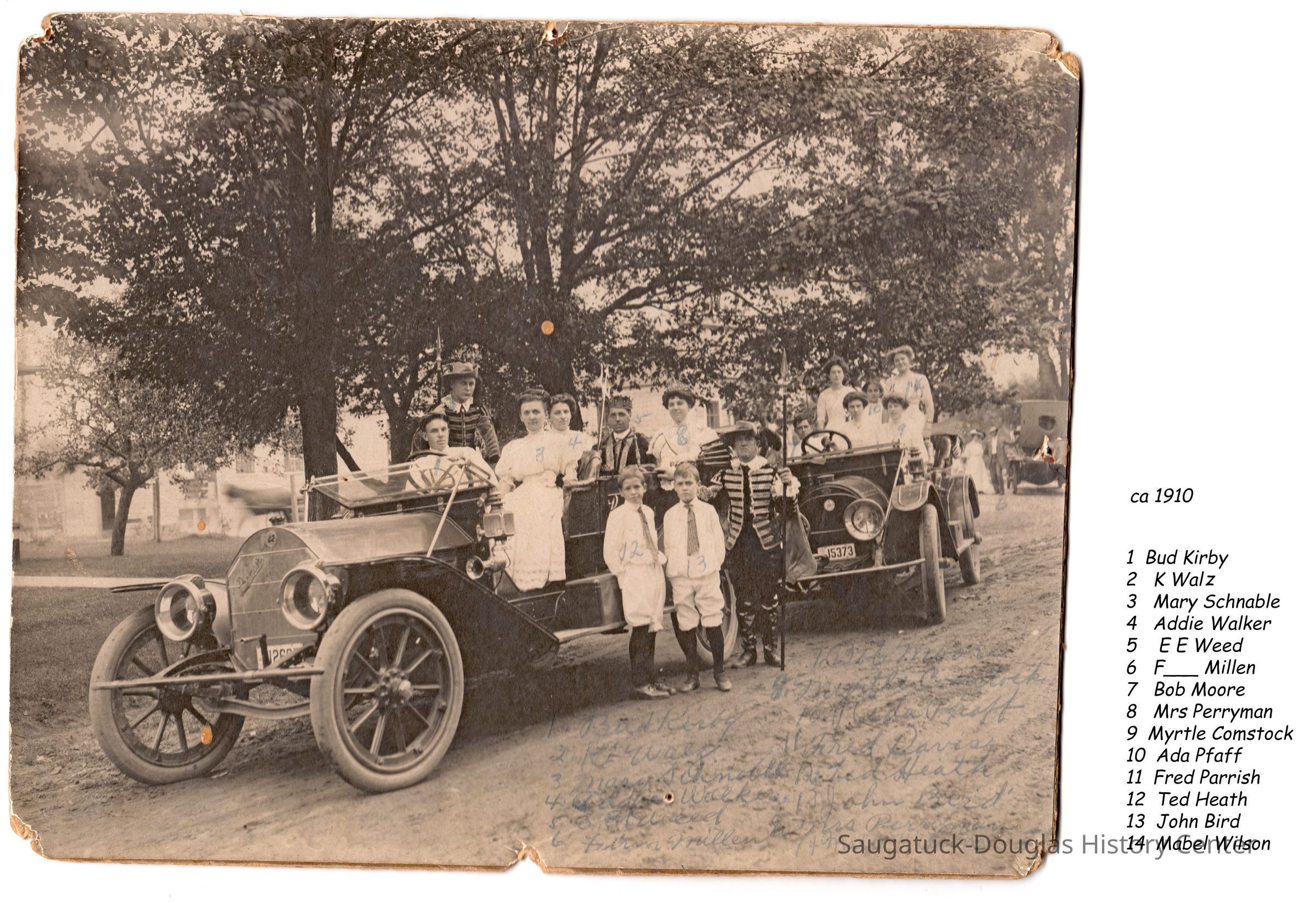Front car: Addie Wade Walker, Elmer Weed, Mrs. Perryman, Bud Kirby driver, unknown, Marie Schnoble