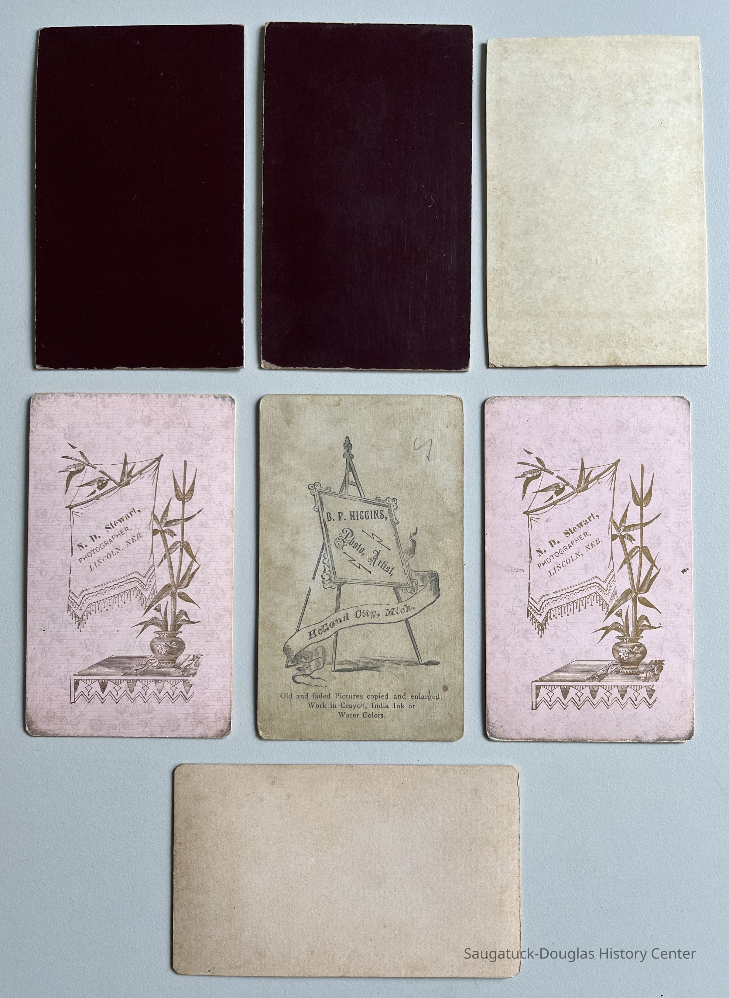 A pair of cards, of a man and a woman, are marked "N.D. Stewart, Lincoln, Nebraska" on the pink back.Photograph Details