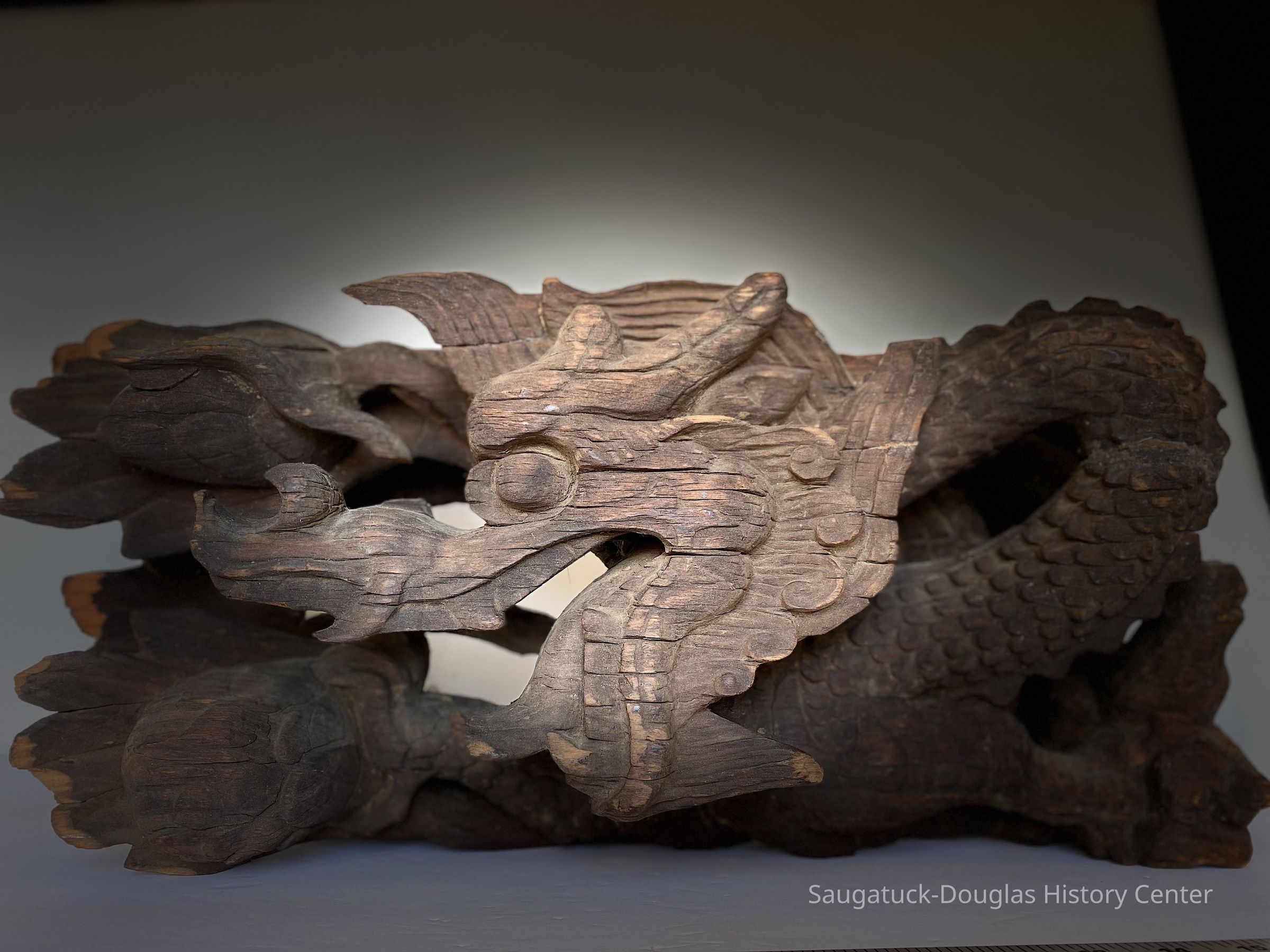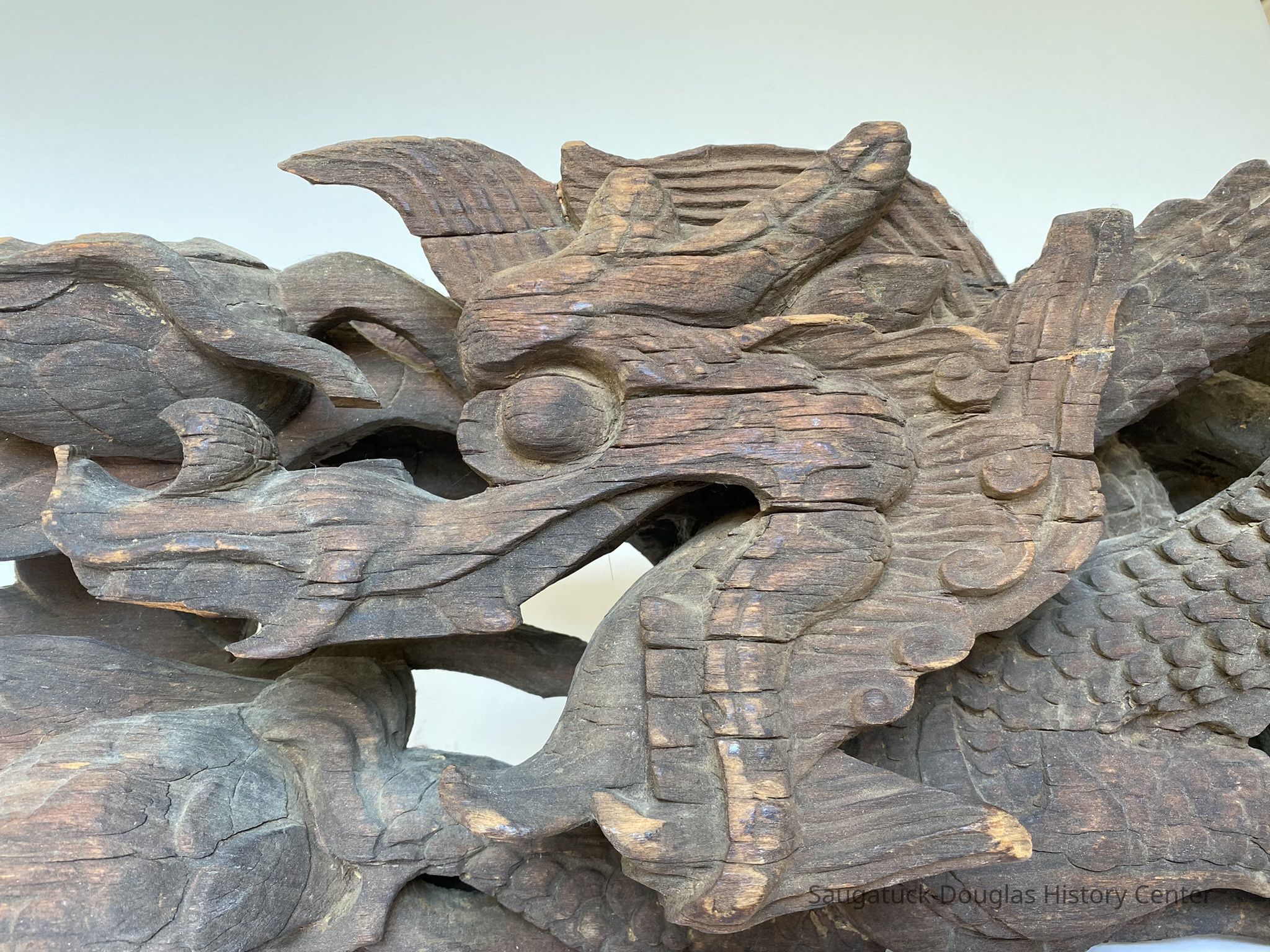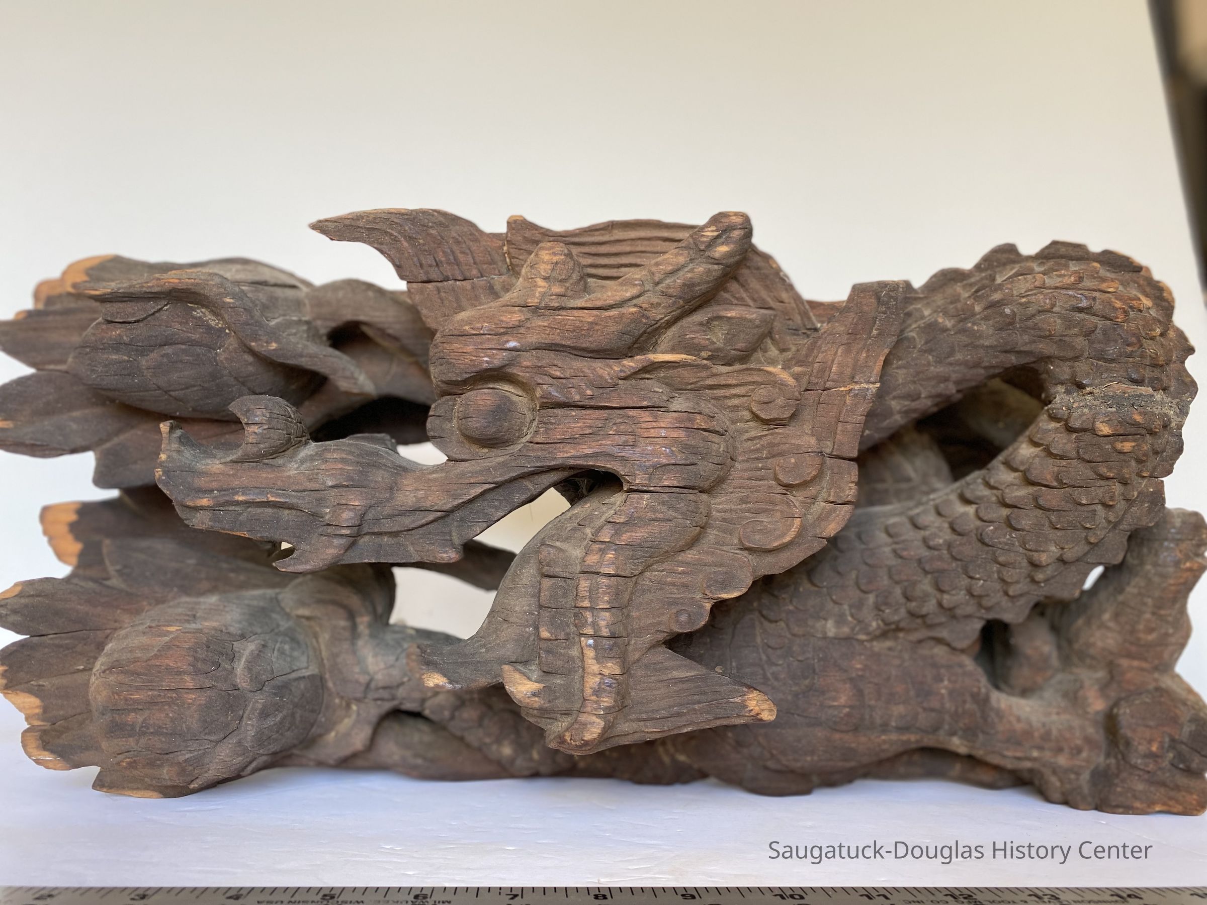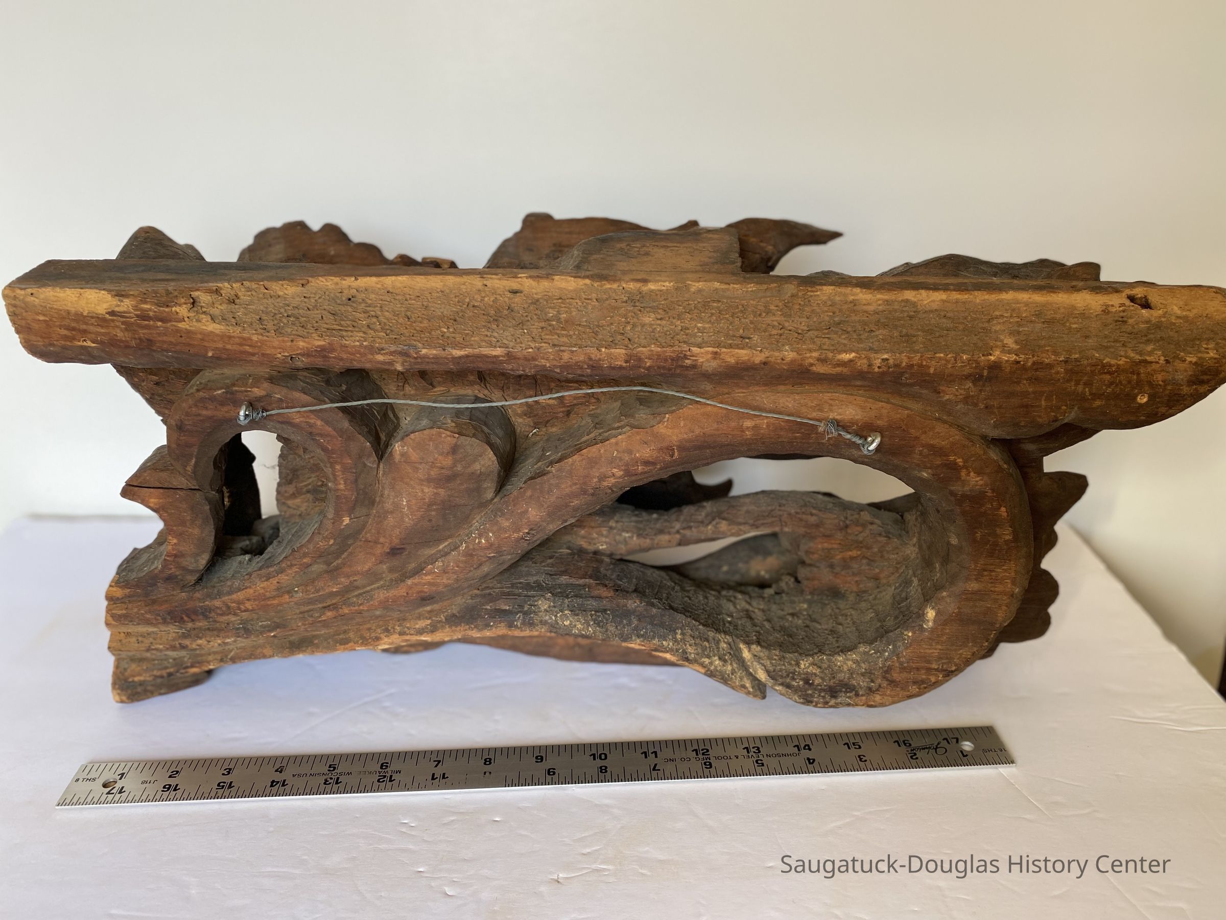 A carved ornamental object possibly a sea serpent or dragon. This dark wooden sculpture was sawed off from a main piece and fitted with a wire for hanging possibly over a mantle. It was taken from a cottage called the “Kemah House”Type of Sculpture