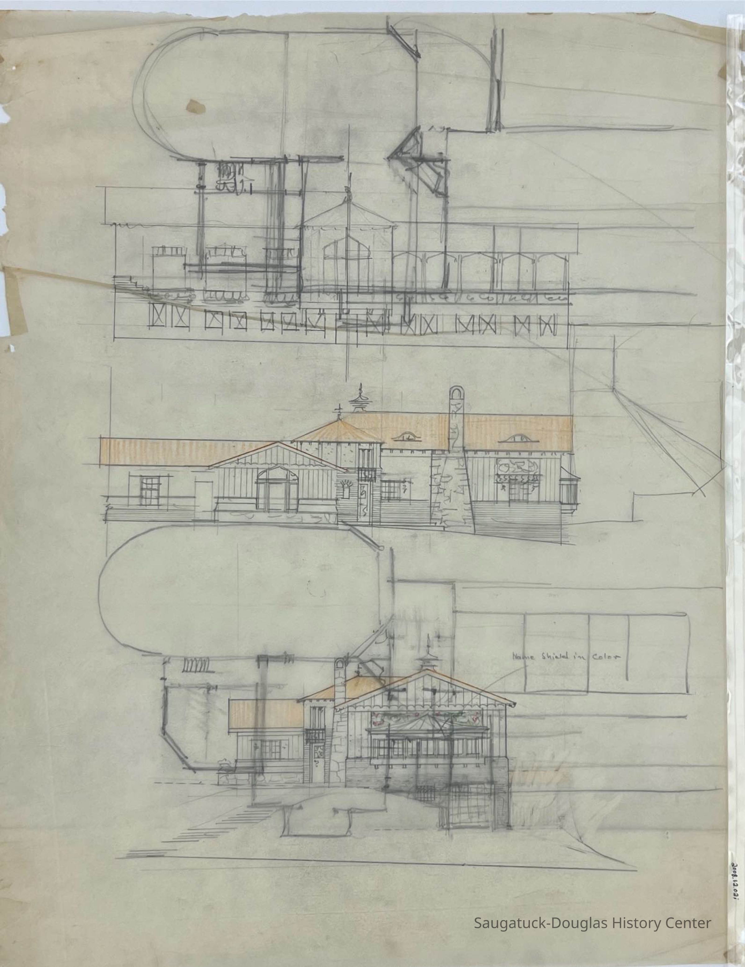 This architectural drawing consists of three different depictions of the Dunn hotel 'Casa Del Marquette.' The top drawing features a rough outline of a section of the exterior of the hotel and features little detail and no descriptions. The middle contains a more detailed drawing that shows the siding, a few windows and a chimney. The bottom drawing also contains more detail with siding, the chimney, what appears to be a large bay window and different exterior materials that are shown but not labeled. The backside also contains rough outlines for the building with no detail.Collection