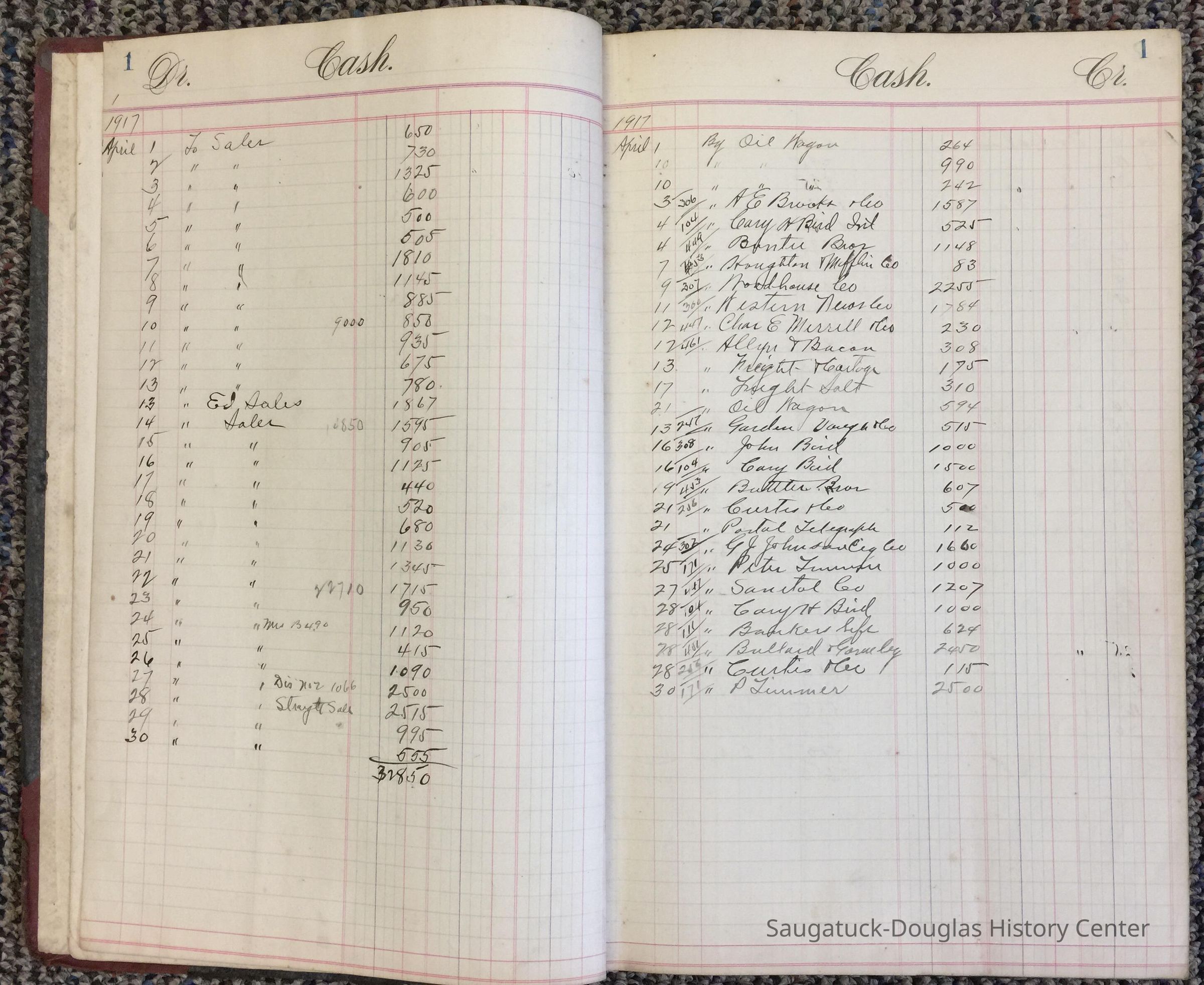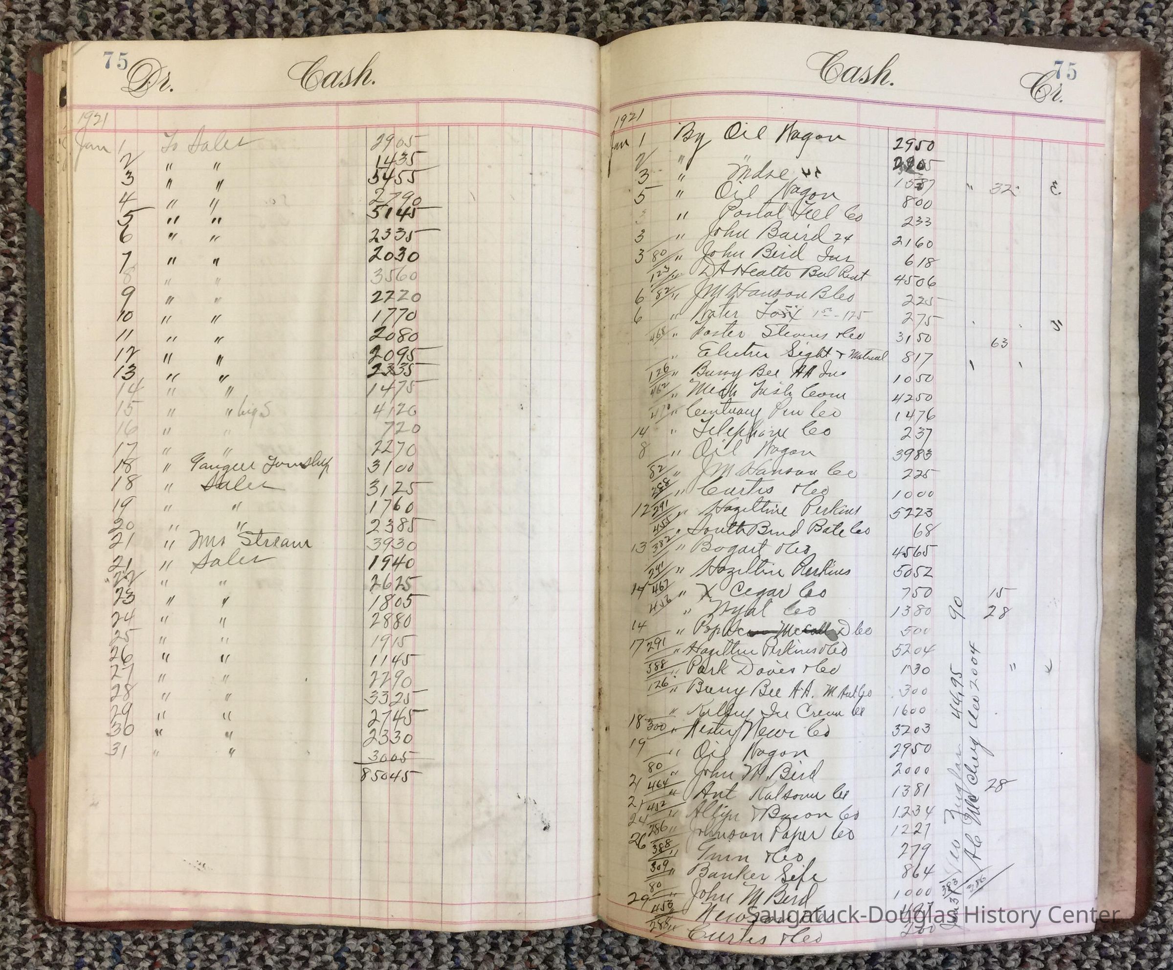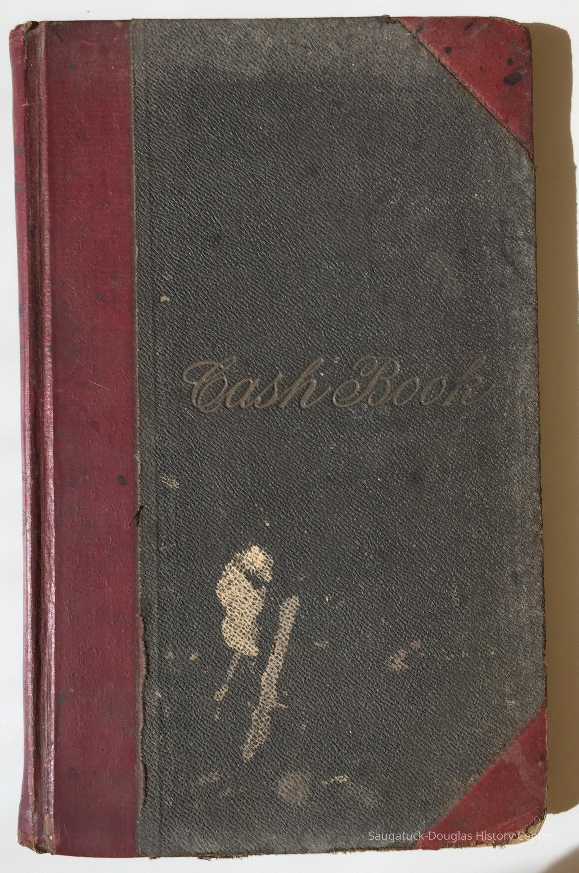 Black leather book with red spine and corner details and "Cash Book" embossed on the cover. Inside are ledger pages that list small purchases from 1917 to 1921. Most every page in the book is filled. After studying the contents, Cynthia Sorensen speculates the book is from the drug store.Collection