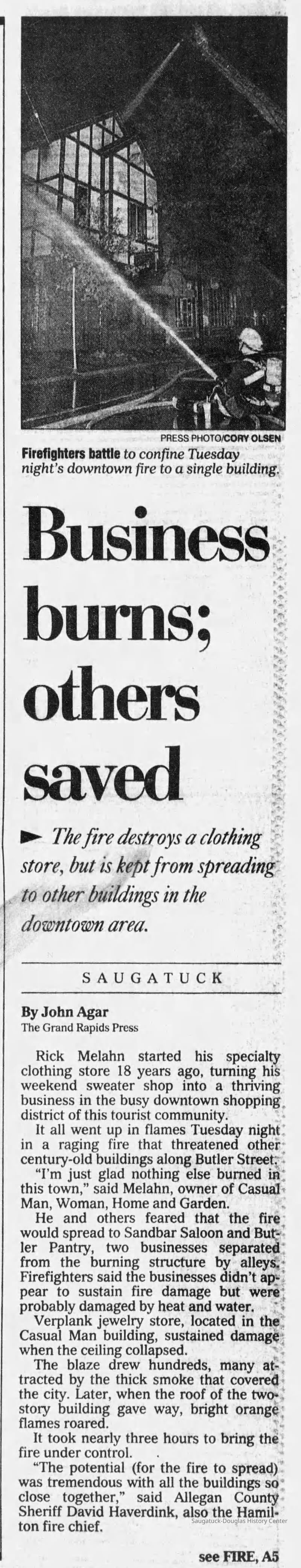 ''I'm just glad nothing else burned in this town," said Melahn, owner of Casual Man, Woman, Home and Garden. He and others feared that the fire would spread to Sandbar Saloon and Butler Pantry, two businesses separate from the burning structure by alleys. Firefighters said the businesses didn't appear to sustain fire damage but were probably damaged by heat and water.