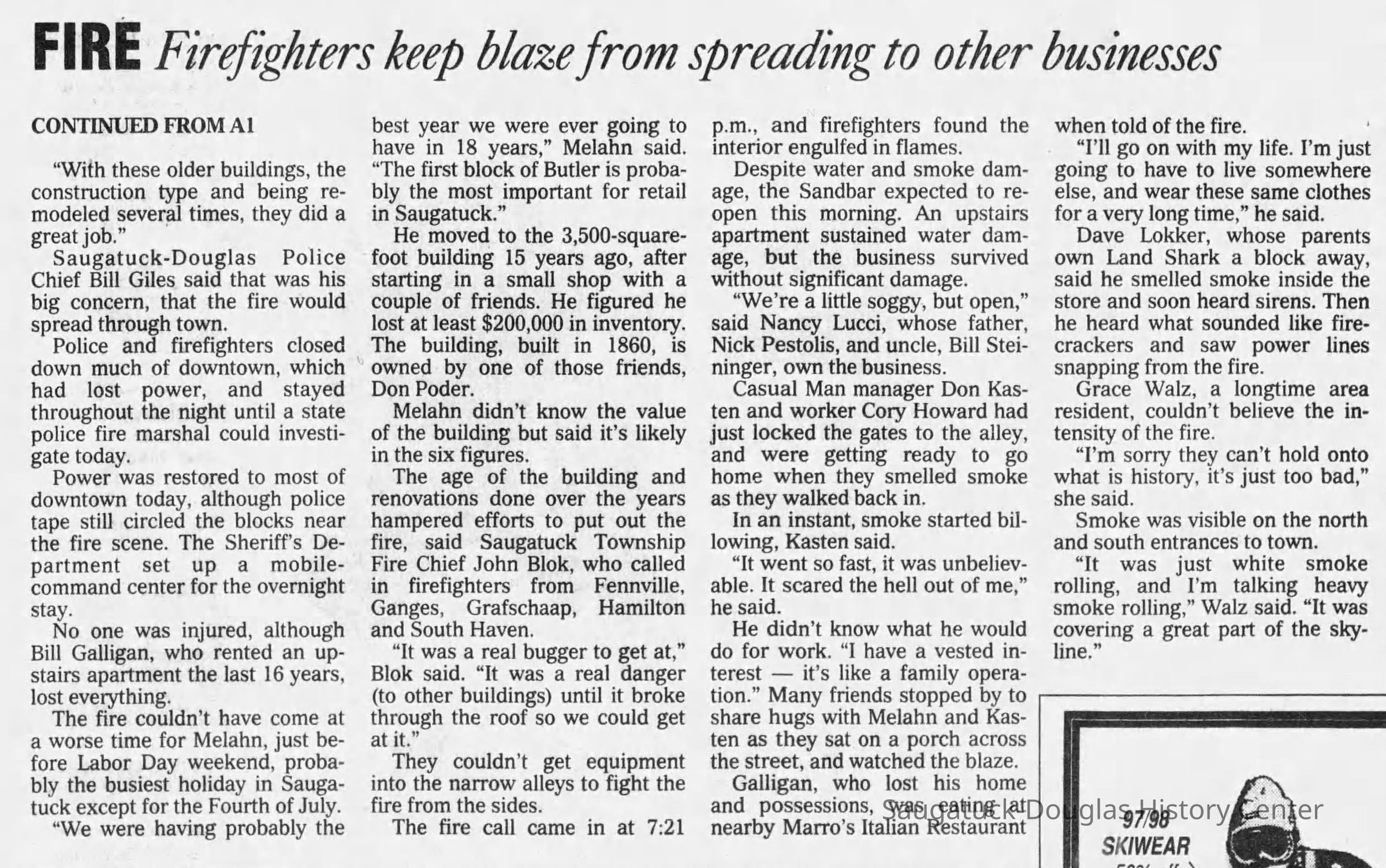 Saugatuck-Douglas Police Chief Bill Giles said that was his big concern, that the fire would spread through town.
