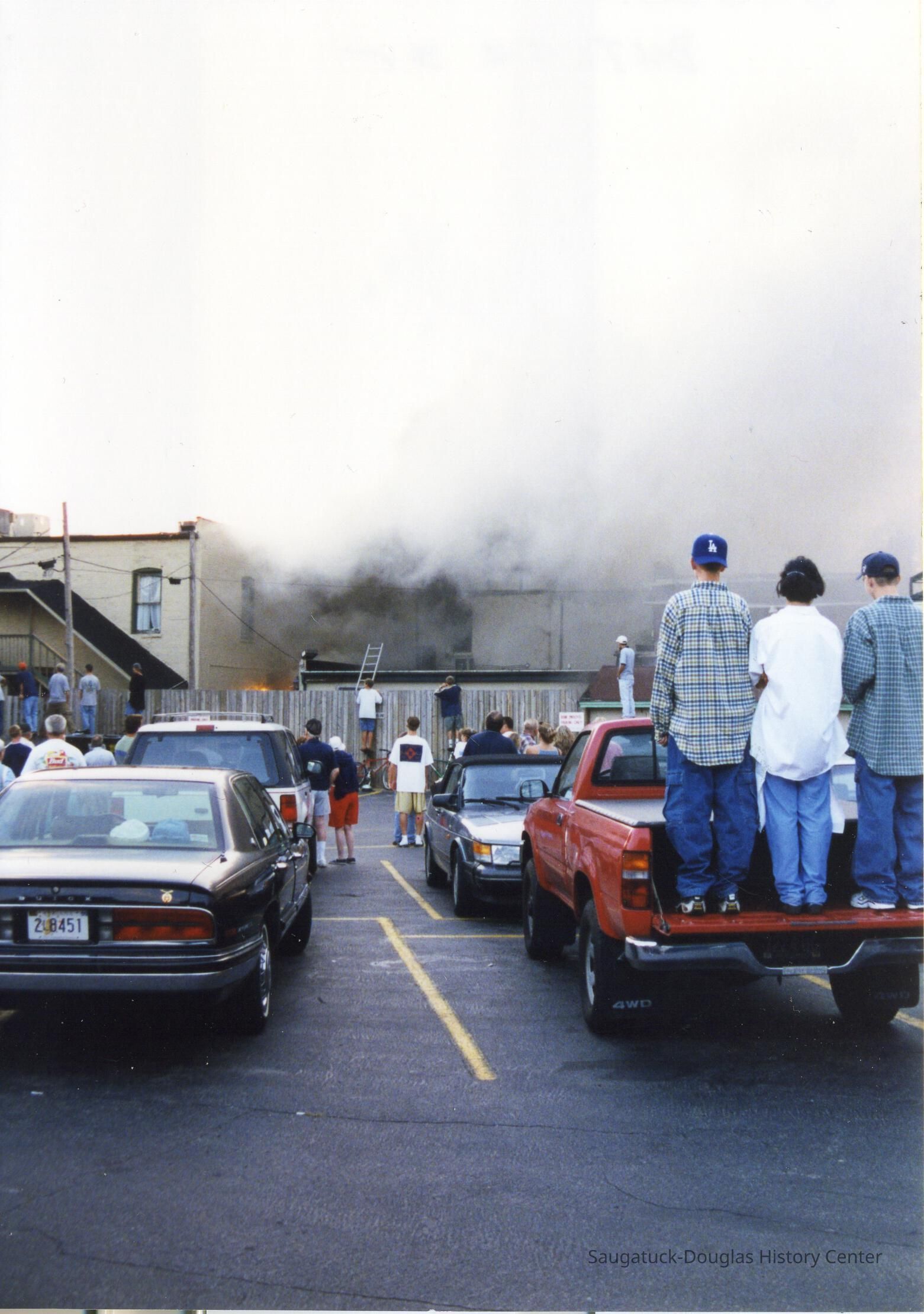 The blaze drew hundreds, many attracted by the thick smoke that covered the city. Later, when the roof of the two story building gave way, bright orange flames roared.