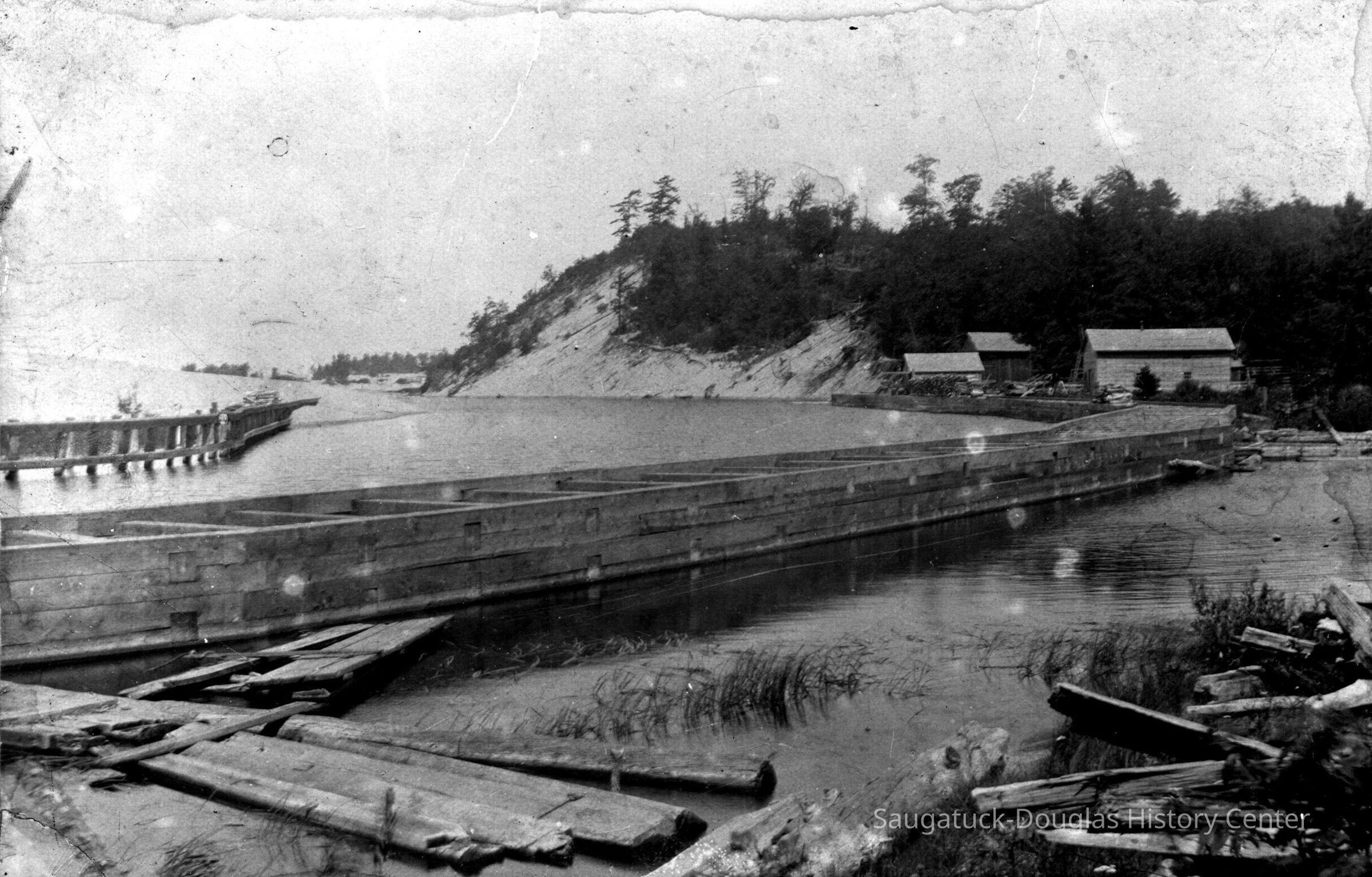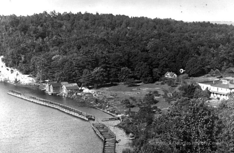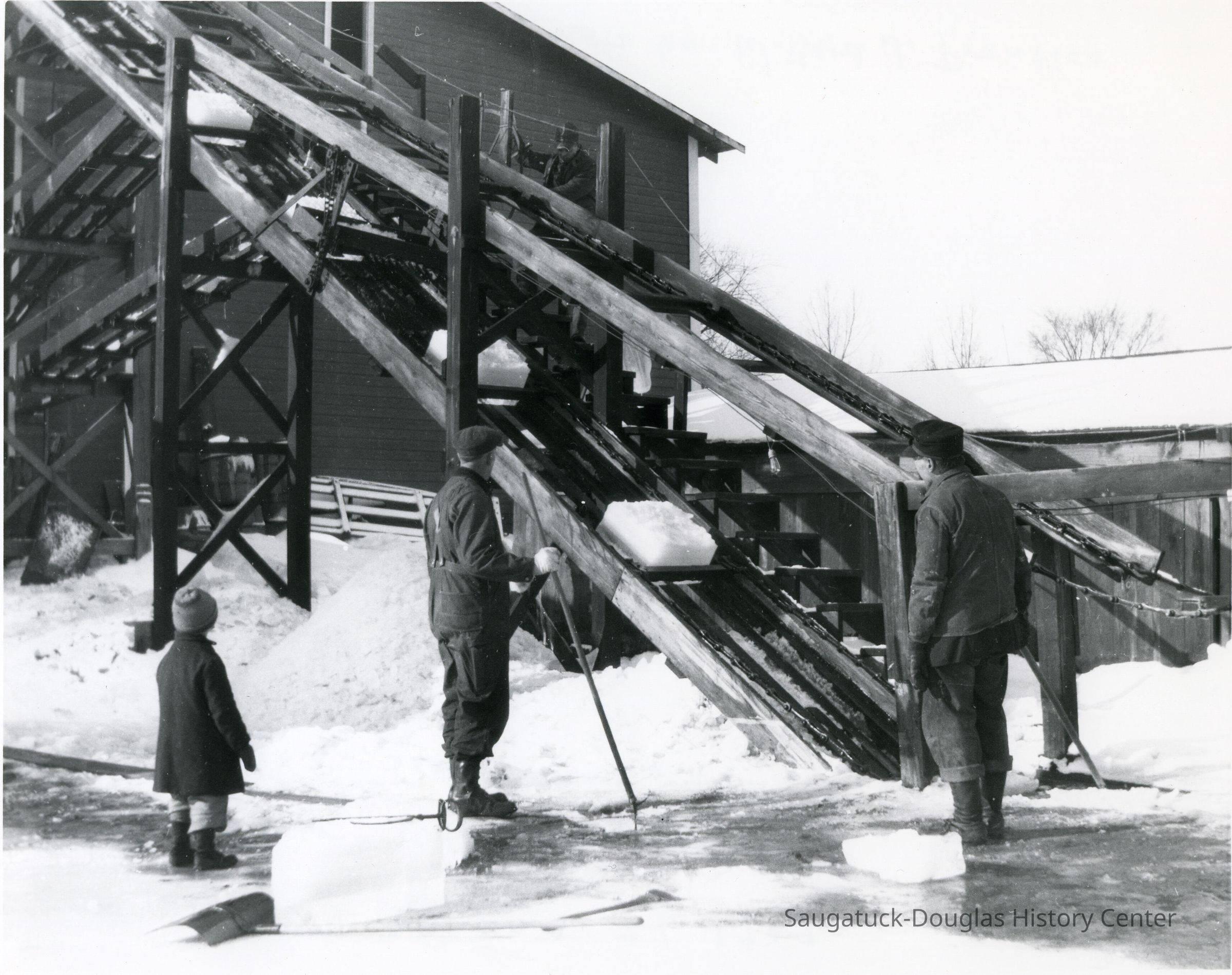 A number of ice houses existed along the river beginning with the first said to have been owned by William G. Butler. The Goshorns had one at Goshorn Lake and they hauled their sawdust from Singapore. The Shriver Brothers had two buildings in front of the Riverside Hotel at the Old Harbor -- the little buildings have been erroneously called “fish shanties” -- but they were in reality ice houses. In Saugatuck, houses were located between Mason and Hoffman and there was Eaton’s Ice House (the building later became the Buerle Hotel and then the Blue Tempo) which stood where Coghlin Park is today. The Morgan ice house was located in Douglas at the east end of Center Street.
