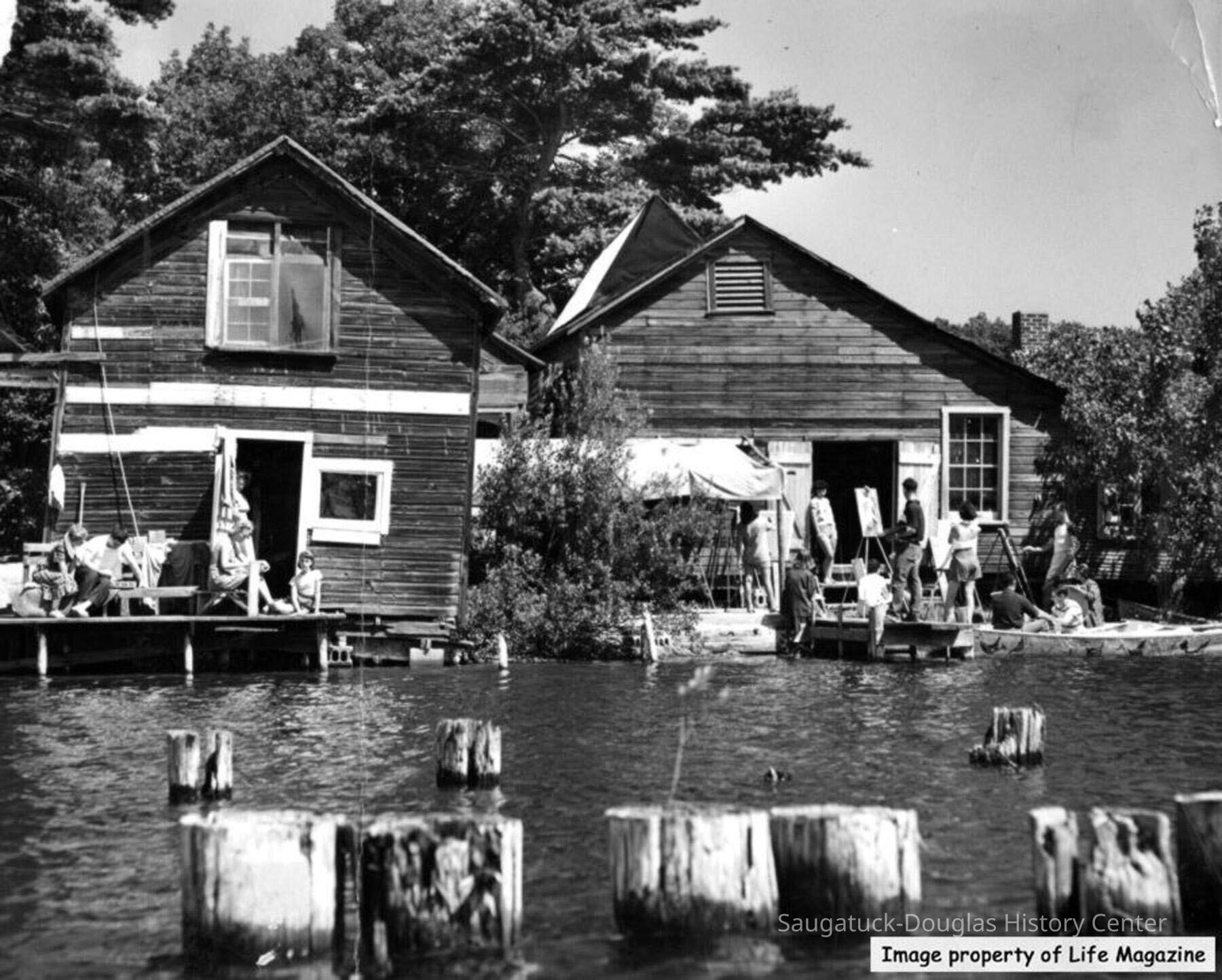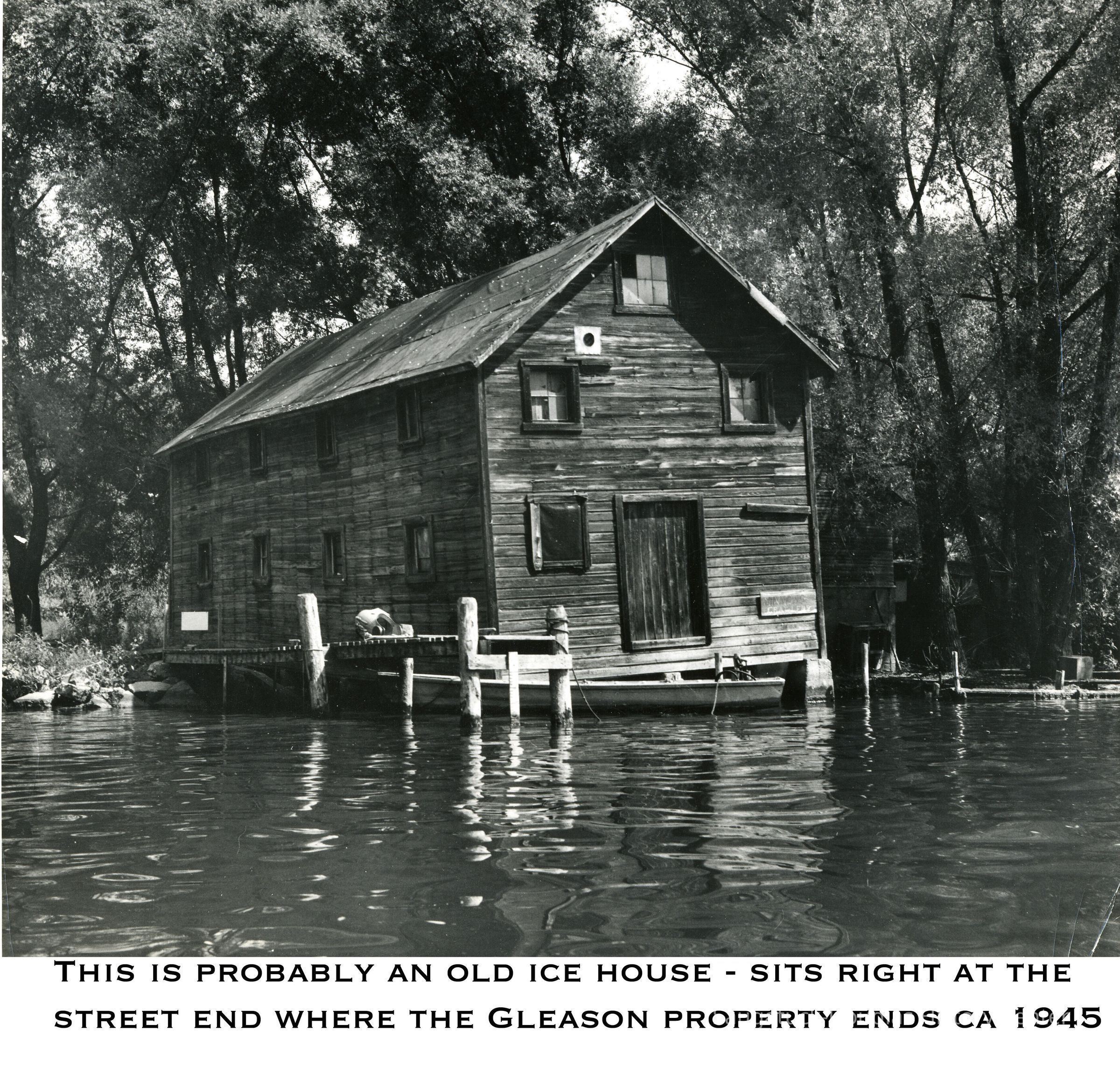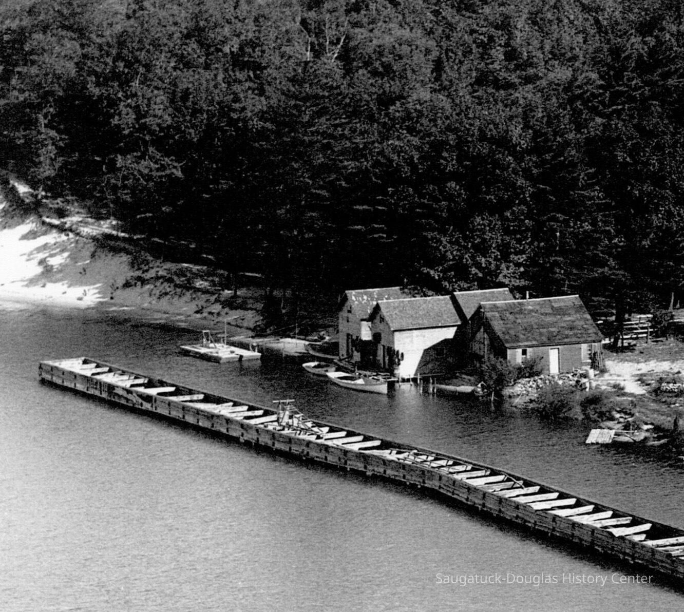 A number of ice houses existed along the river beginning with the first said to have been owned by William G. Butler. The Goshorns had one at Goshorn Lake and they hauled their sawdust from Singapore. The Shriver Brothers had two buildings in front of the Riverside Hotel at the Old Harbor -- the little buildings have been erroneously called “fish shanties” -- but they were in reality ice houses. In Saugatuck, houses were located between Mason and Hoffman and there was Eaton’s Ice House (the building later became the Buerle Hotel and then the Blue Tempo) which stood where Coghlin Park is today. The Morgan ice house was located in Douglas at the east end of Center Street.