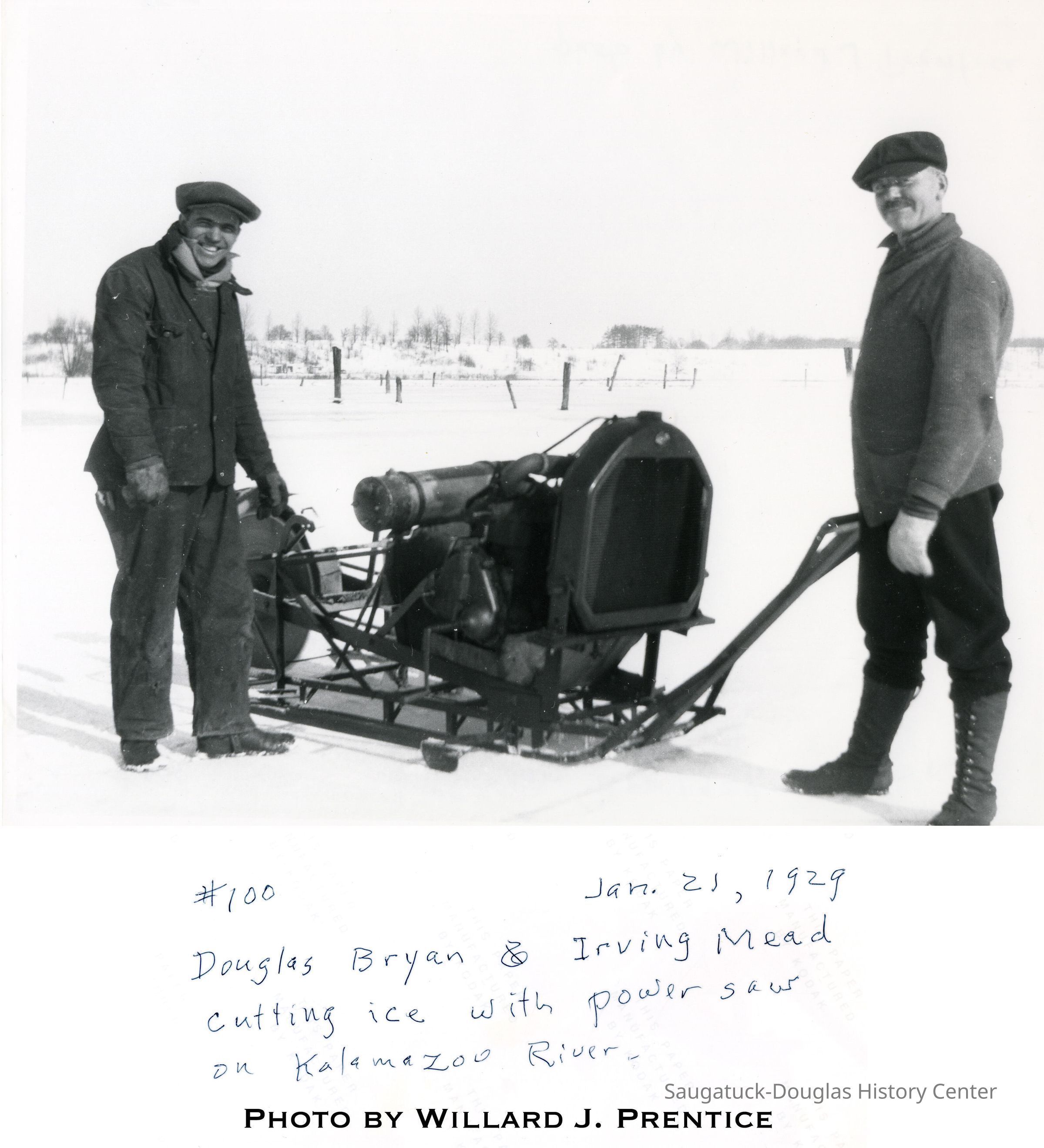 Ice was not made but “harvested” in the good old days. And there is no doubt that ice was big business and very important to everyday life – especially in the heat of the summer. Being close to water and cold air were important to the ice business and being close to good source of sawdust was even more important. Saugatuck and Douglas had an abundance of all three. Before “global warming” river ice was usually a foot thick in early January. It was then time to get the crew together and fill up the old ice house. The hollow walls of the house were loosely filled with sawdust to provide insulation – remember the ice blocks (at least those toward the bottom) had to last a year!