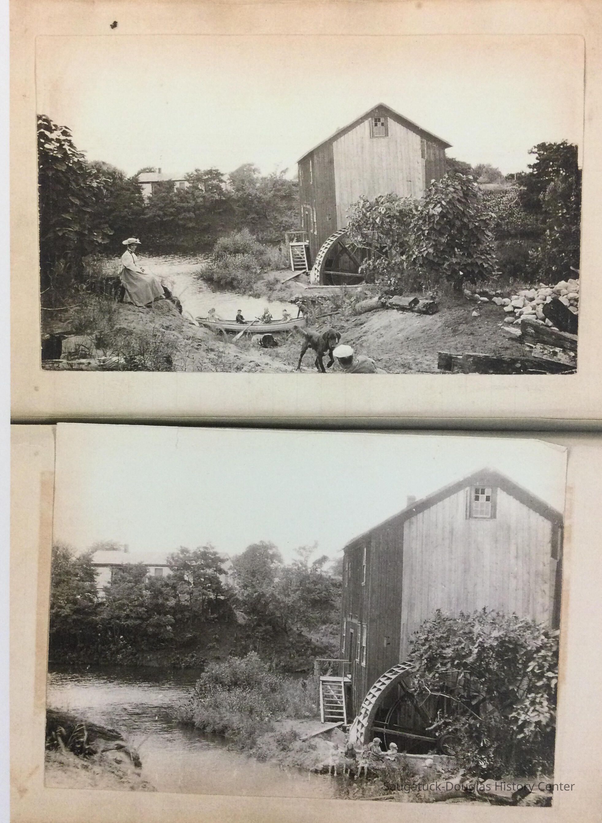 Scan of a group of people standing on a bridge over a river. There is a mill in the background.
