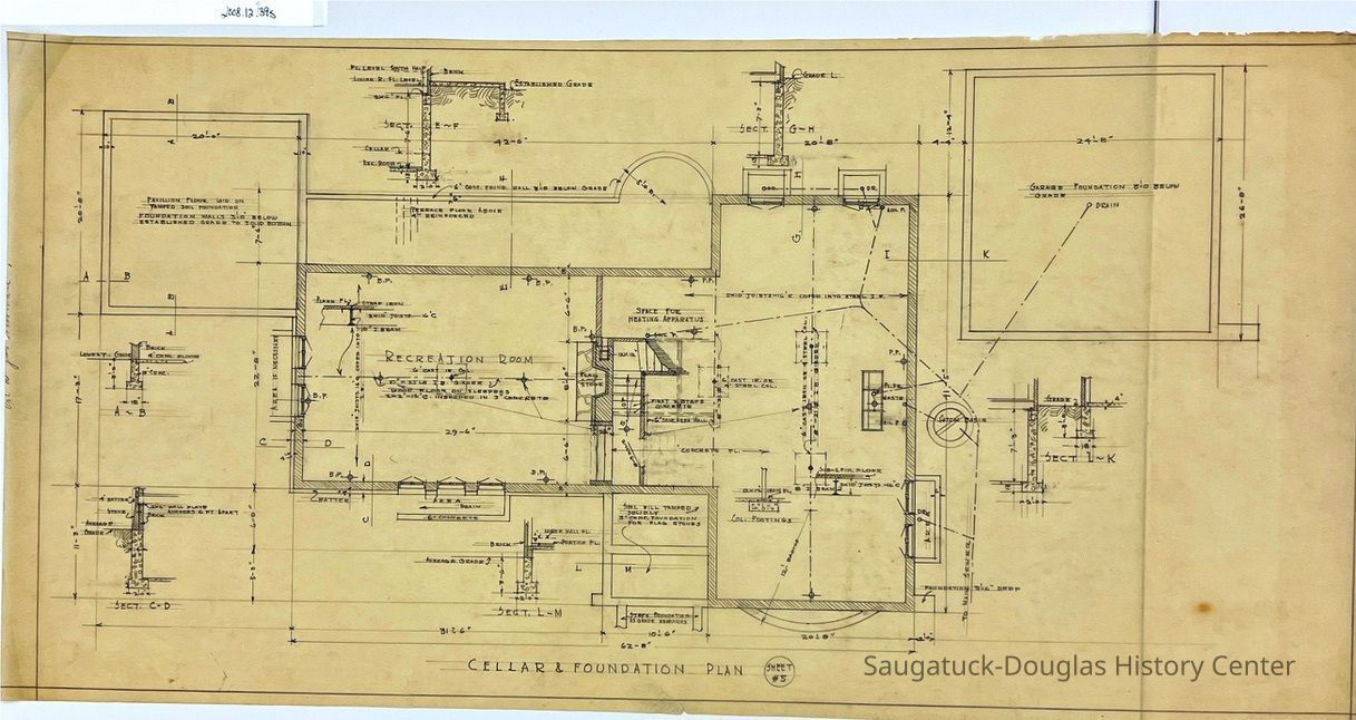 This architectural drawing shows the foundation plan for a house. It gives great detail including room labels, measurements and materials to be used. It also shows details marked as cross sections with letters.Collection