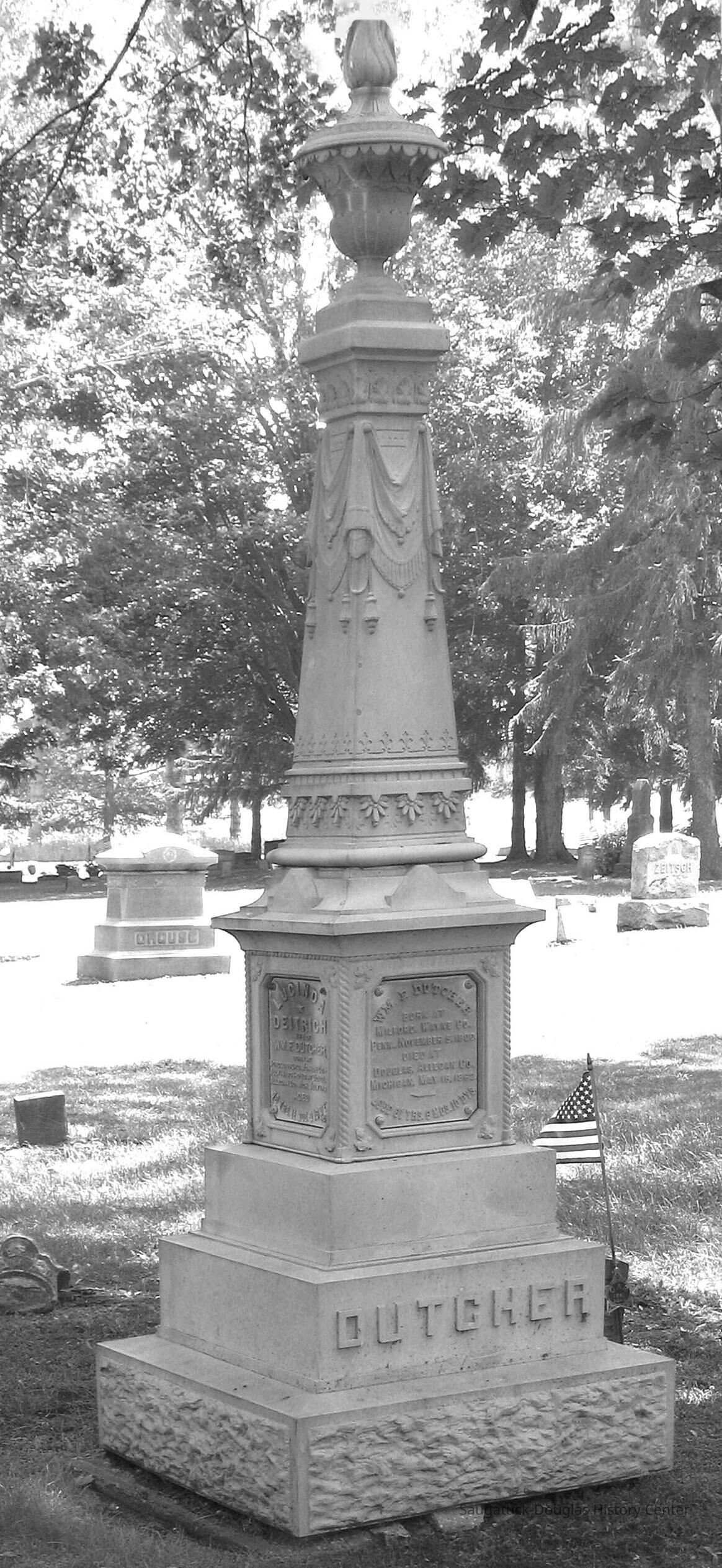 Starting in the 1830’s, many burials for the earliest settlers took place at a burial ground located just south of the present city hall. This was also the site of native American burials prior to the arrival of William G. Butler. On the other side of the river, Douglas early pioneers were laid to rest in a lot across Center Street from the present day Dutcher Lodge - Douglas city hall building. In the early 1860’s Saugatuck and Douglas established the current cemeteries - Riverside Cemetery near Holland Street and Clearbrook Drive and the Douglas Cemetery which lies along Wiley Road just southeast of Douglas.