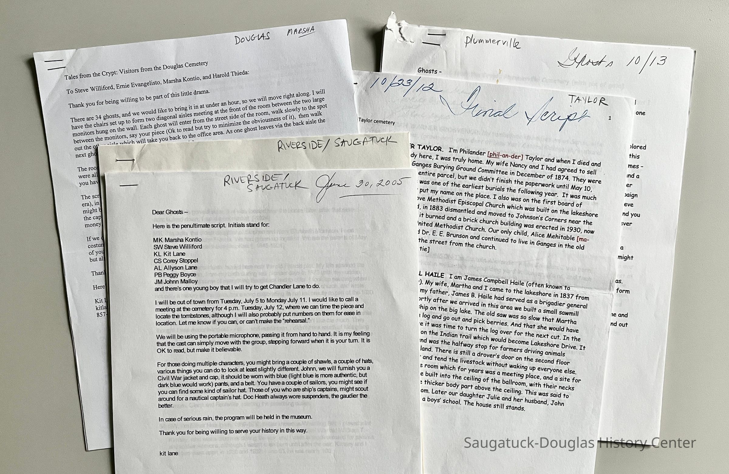 3. Taylor cemetery script marked "Final" and 10/23/12. Presenters were Kit Lane, Steve Williford, Chris Yoder, Marsha Kontio. Historical people profiled include Philander Taylor, James Campbell Haile, Sarah Warner Grosvenor, Alexander Allen Johnson, William H. Dunn, Eliza Raplee, Van Renselaer Wadsworth, Levi Tuttle, William B. Kibby, Jonathan Pratt Eddy, Henry Hudson Hutchins, Frank Chenoweth, George Dallas Dean, Susan Lawrence, Dr. E.E. Brunson, Dr. Eugene T. Brunson, Alice Brunson Wolbrink, Charles McVea, Herbert D. Hudson, Claude Dornan, Linton Varus Foot, Robert Wolbrink, James S. Chase, Marion Ensfield, William Leslie Tromp, Bruce E. Matteson, Mary Kanyo Simon, Richard E. Trumble