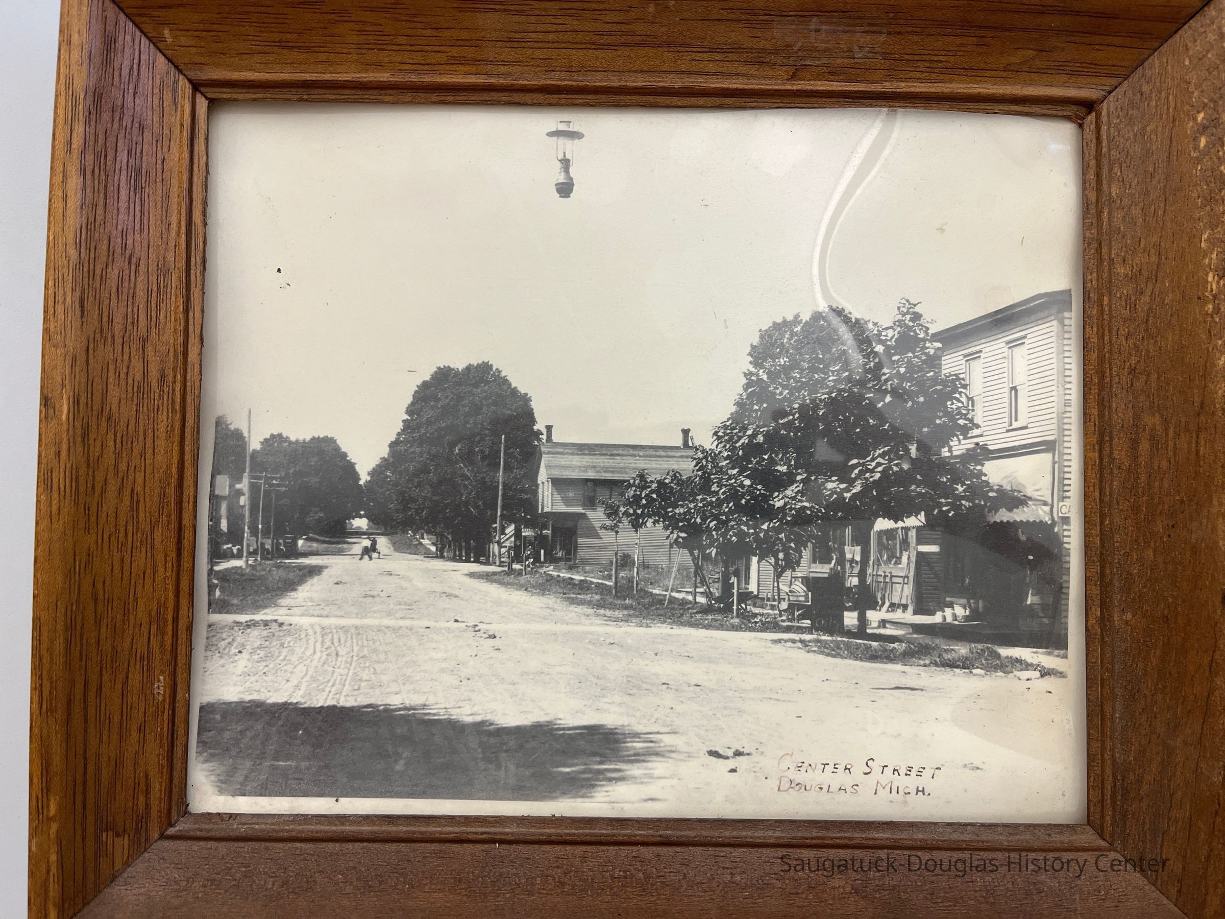 Photo of an unpaved Center Street, looking west about at the Washington Street intersection. A grocery store, a hardware store and a barbershop are visible on the near right. Further up the street is the Wiegert's Model Grocery building at 8 West Center St. where two figures are crossing the street. A street lantern is visible at the top center of the image.Photograph Details